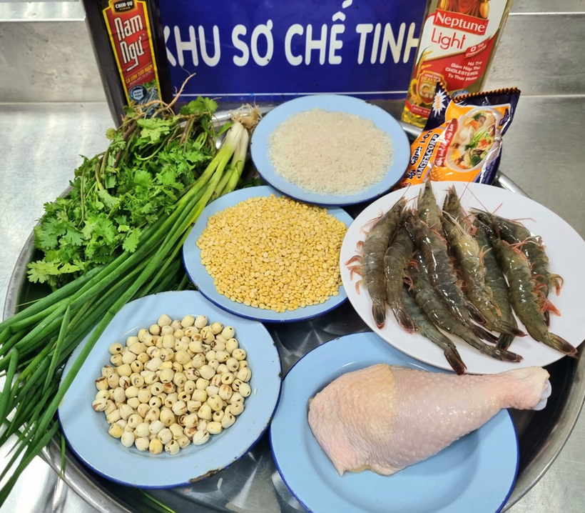 Cho phần nước sườn và nước vỏ tôm ninh vào xoong, đun sôi rồi đổ gạo vào đun tiếp. Cho đỗ xanh vào, cho tiếp nấm hương, hạt sen, thịt sườn vào nấu cùng. Phần thịt tôm cho hành khô vào phi thơm với thịt tôm rồi cho tiếp vào cháo nấu lên. Nấu cháo cùng các nguyên liệu cho đến khi cháo nhừ mềm sánh mịn , nêm mắm gia vị cho vừa, cho hành mùi vào bắc ra ăn nóng.