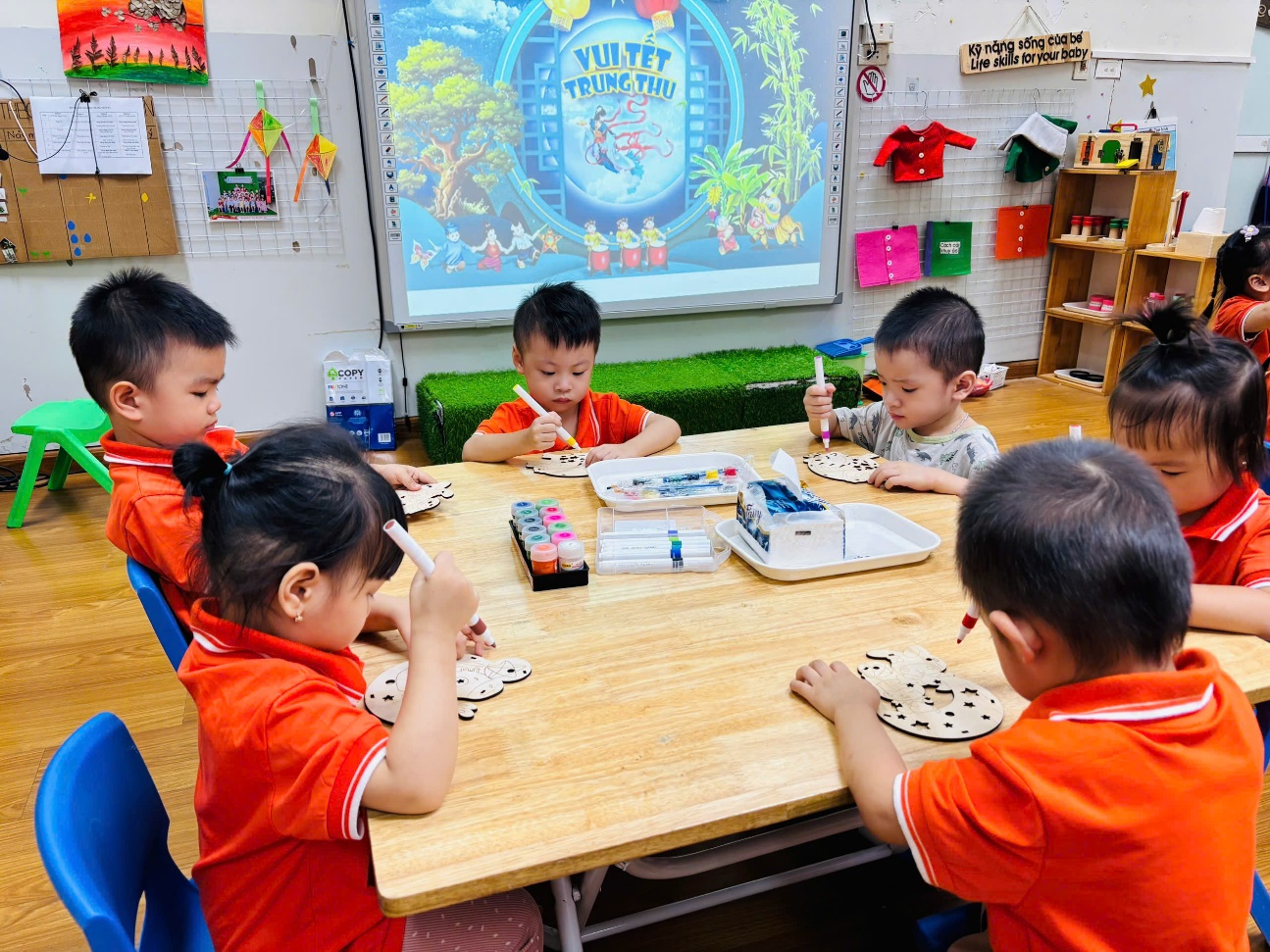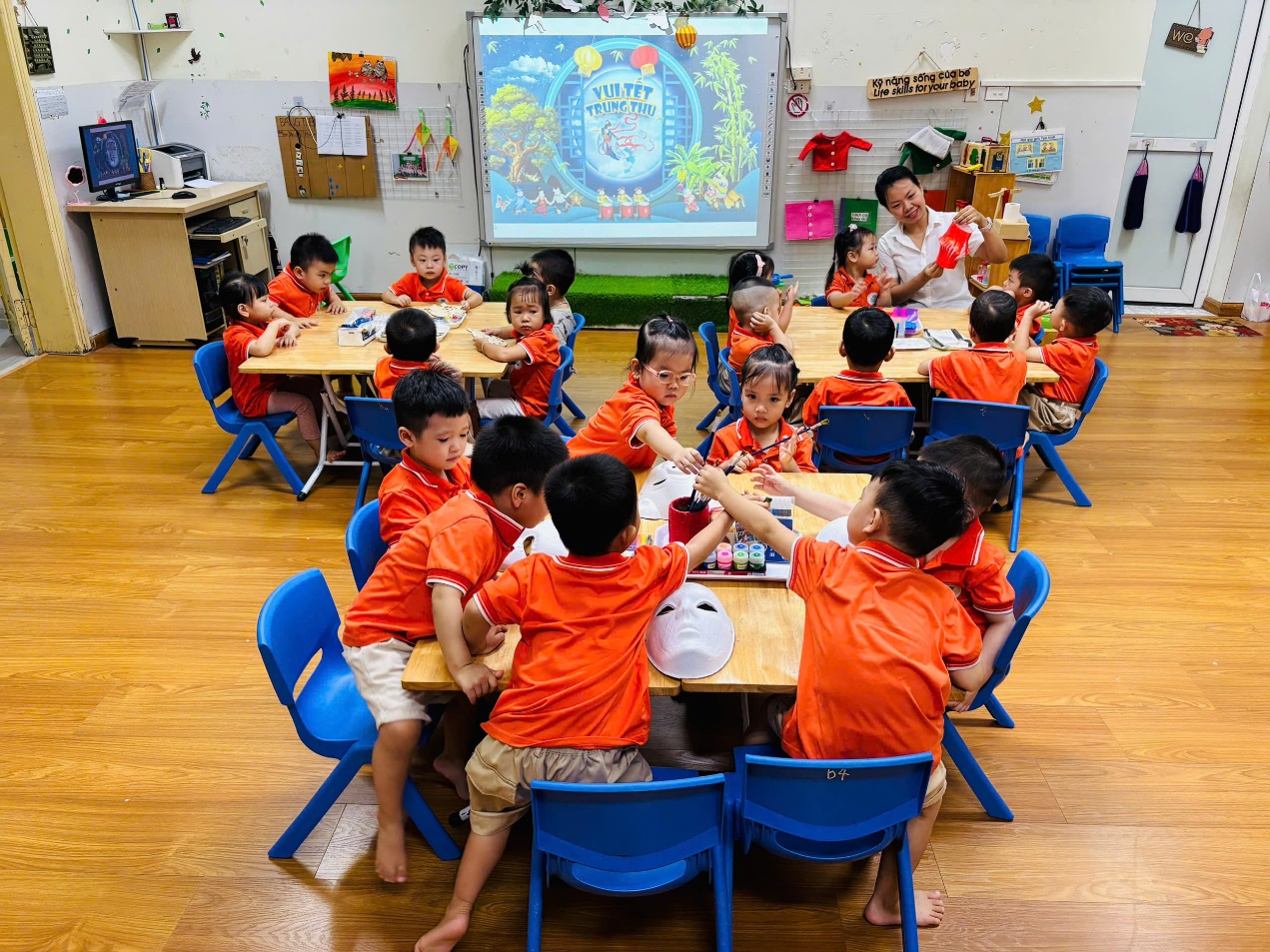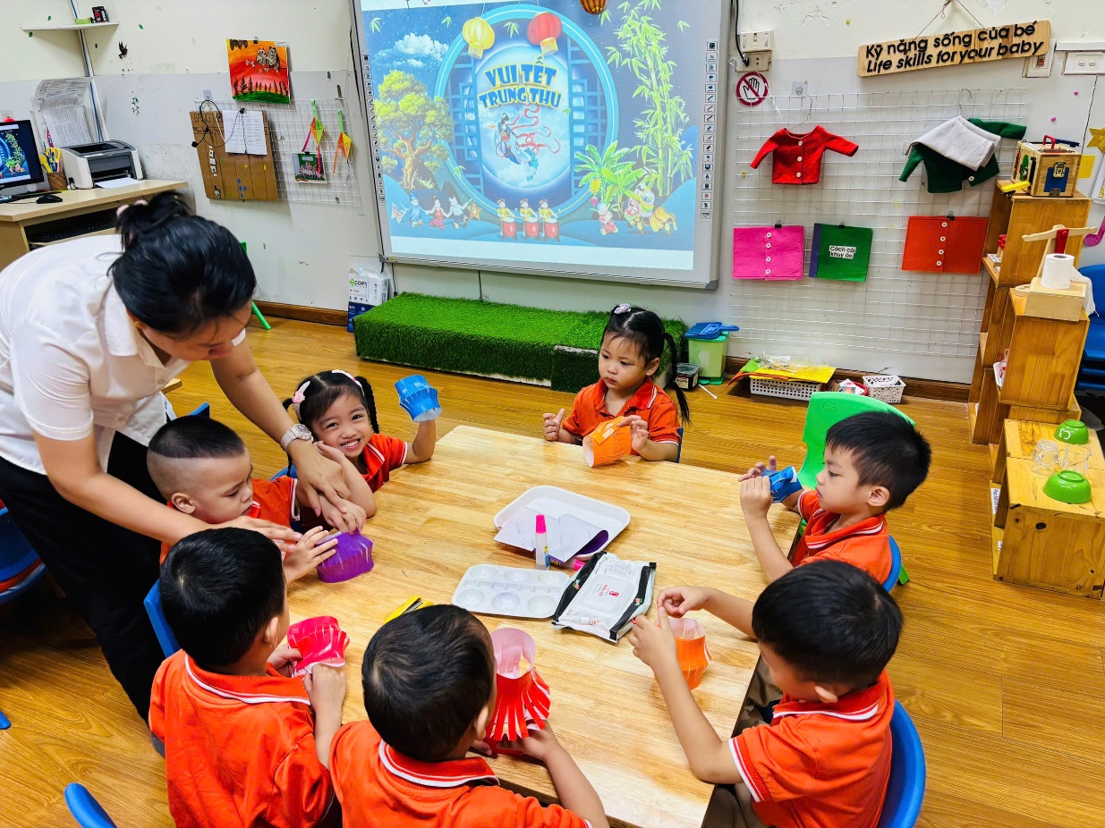 Dưới sự hướng dẫn tận tình của cô giáo, các bé được tự tay làm những chiếc đèn lồng đầy màu sắc, cùng nhau tô những chiếc mặt nạ thật ngộ nghĩnh. Mỗi bé đều chăm chú, trang trí cho sản phẩm của mình thật đẹp mắt. Khi hoàn thành xong sản phẩm, cả lớp cùng nhau múa hát và vui chơi. Các bạn nhỏ còn được tham gia phá cỗ, rước đèn cùng các anh chị và các bạn trong trường, thưởng thức bánh nướng, bánh dẻo, bánh kẹo và chia sẻ niềm vui với bạn bè, tạo nên một không khí ấm áp, đoàn kết và tràn ngập tiếng cười