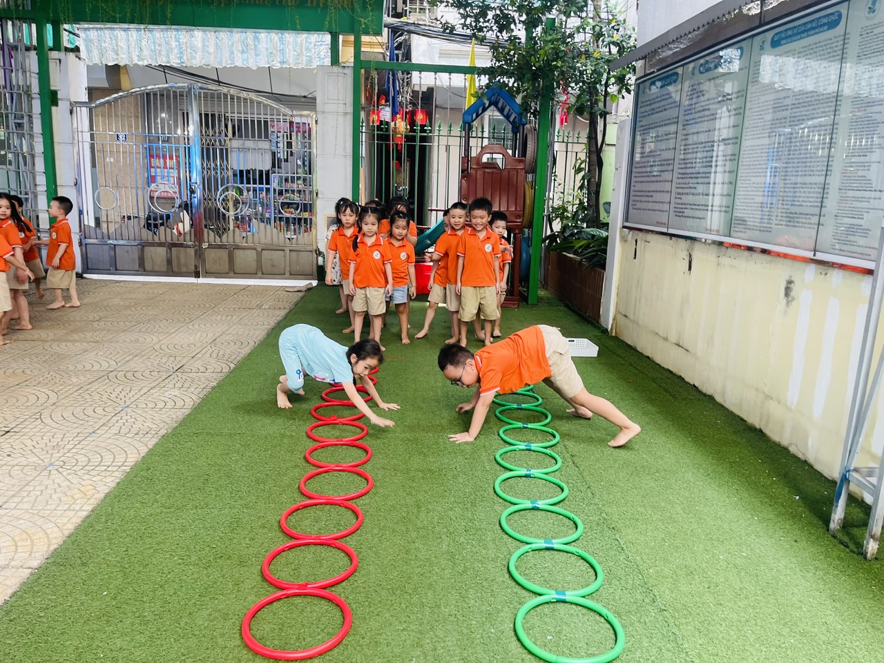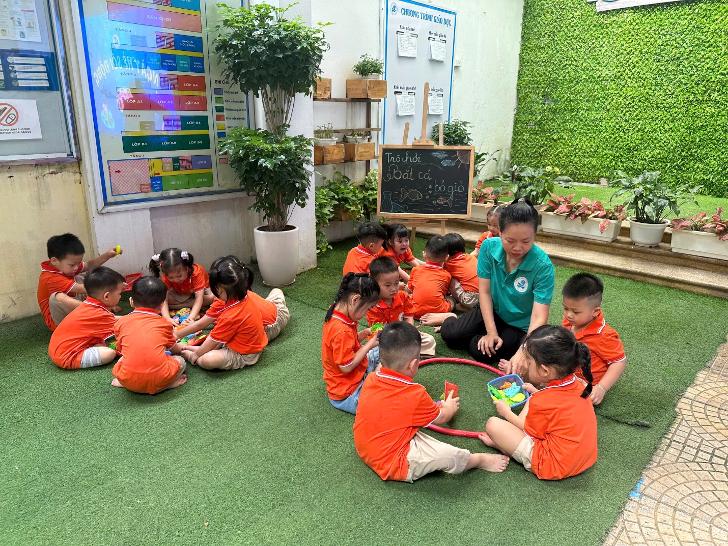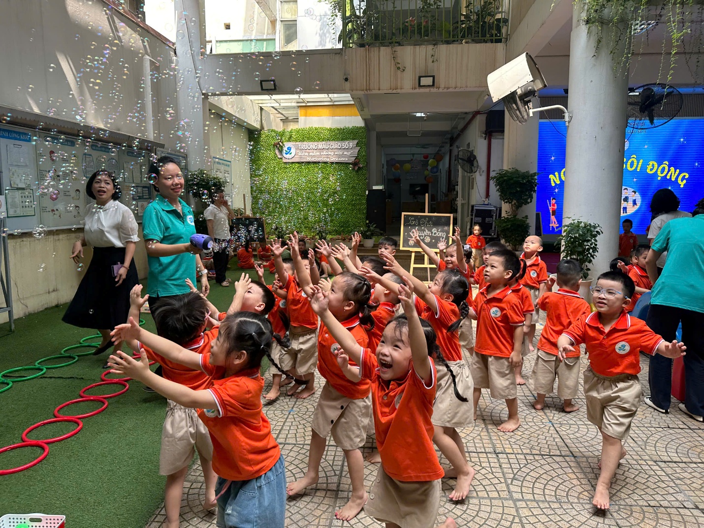 Các giáo viên luôn đồng hành, động viên từng bé, đảm bảo an toàn trong mọi hoạt động và khơi gợi tinh thần hứng khởi qua mỗi phần chơi.