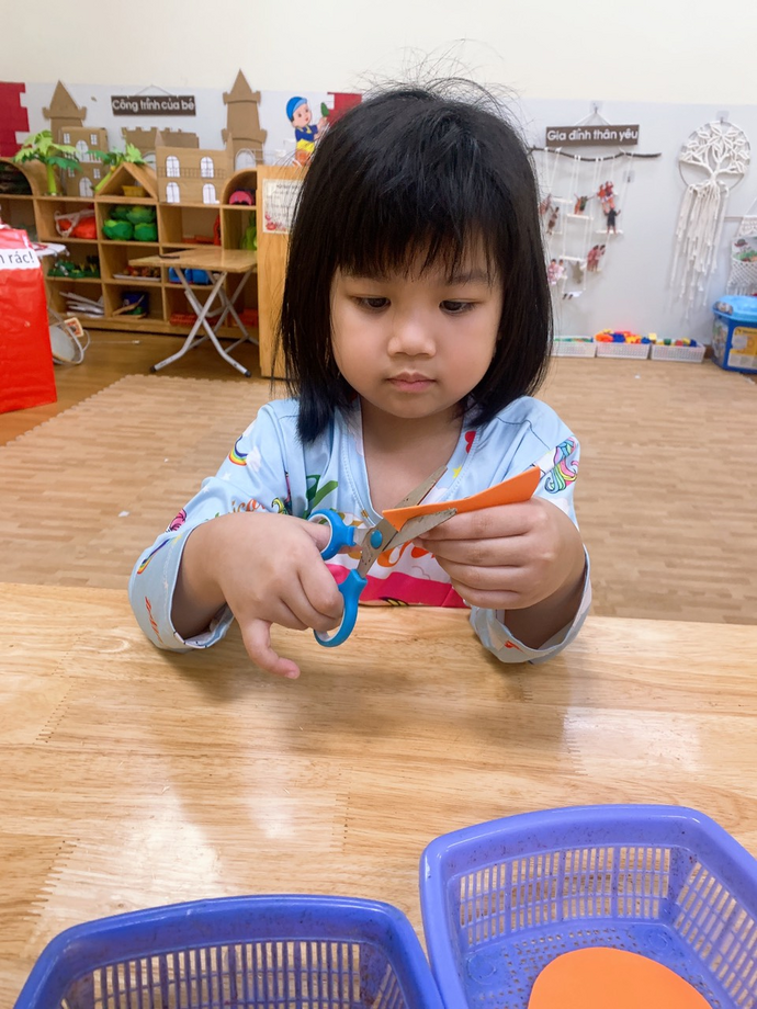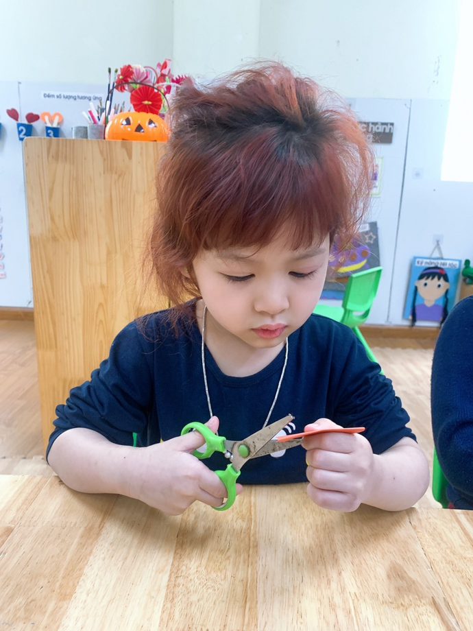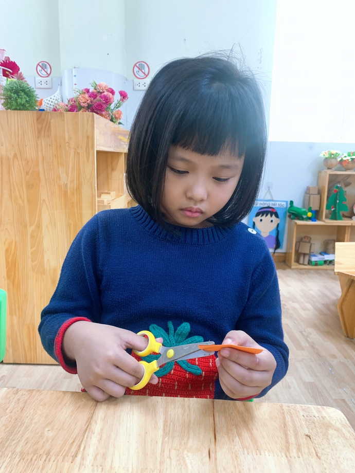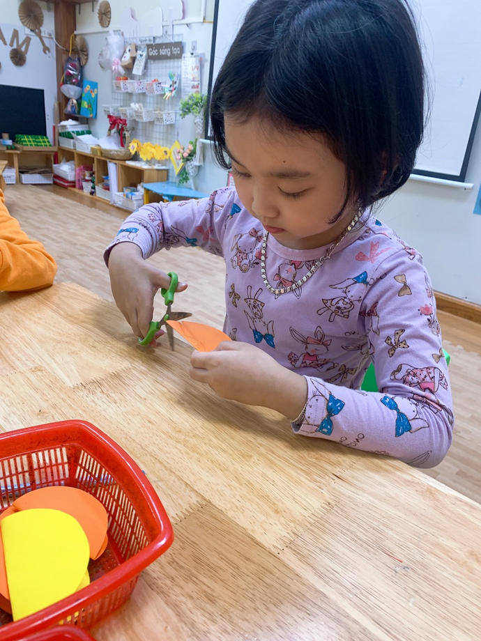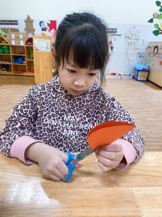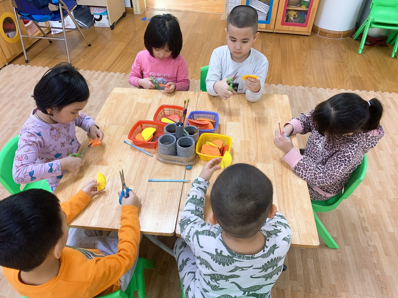 Các con đang ngồi tỉ mỉ cắt những cánh hoa
