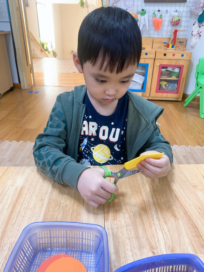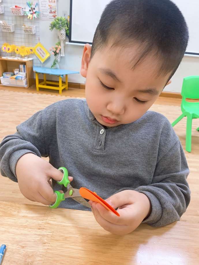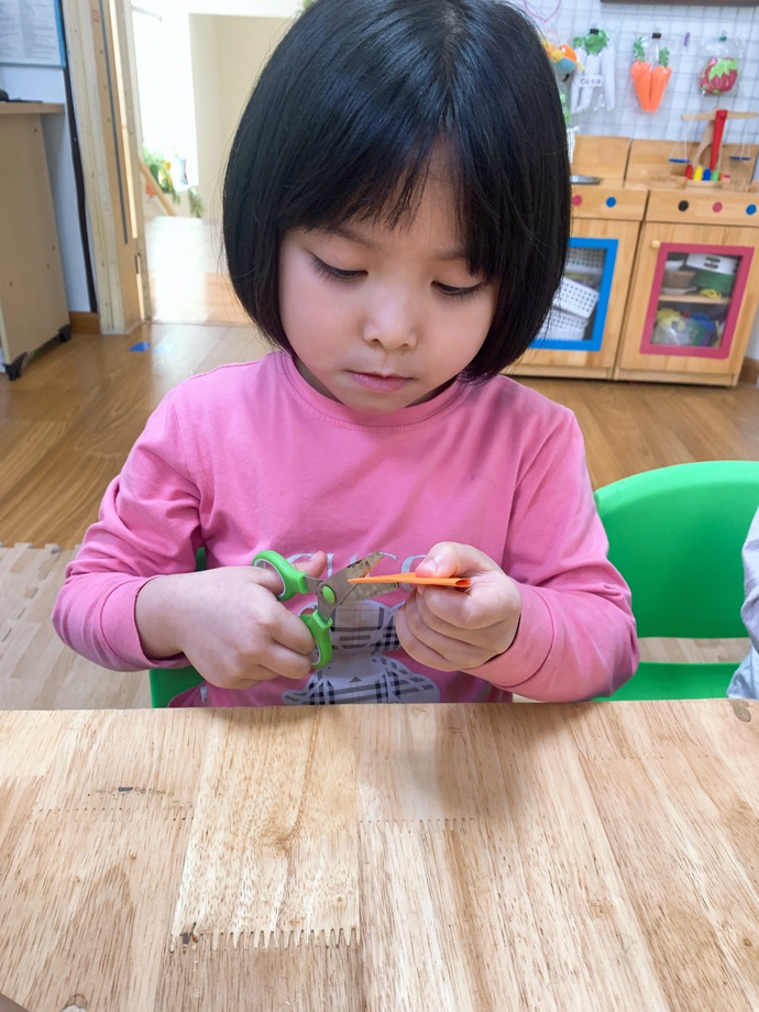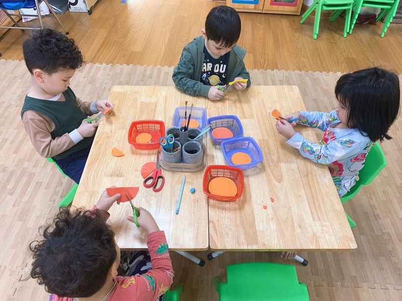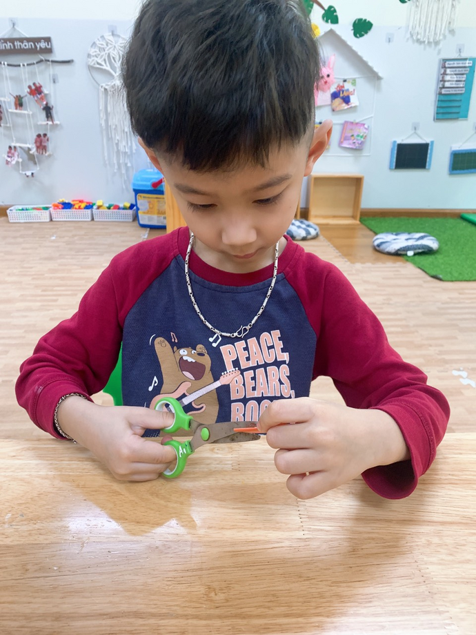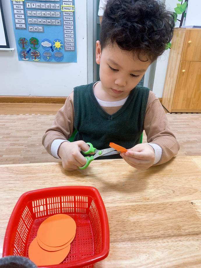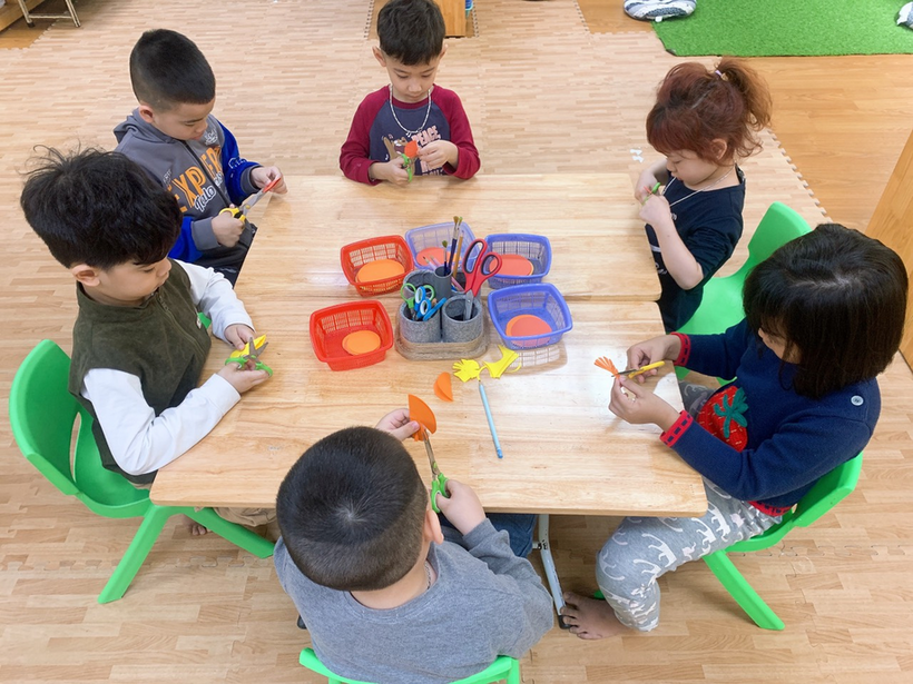 Các con đang ngồi tỉ mỉ cắt những cánh hoa