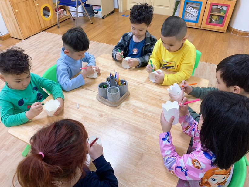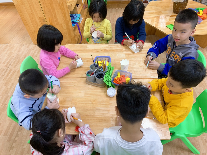 Các con đang tự tay trang trí chiếc giỏ hoa bằng cốc giấy của mình