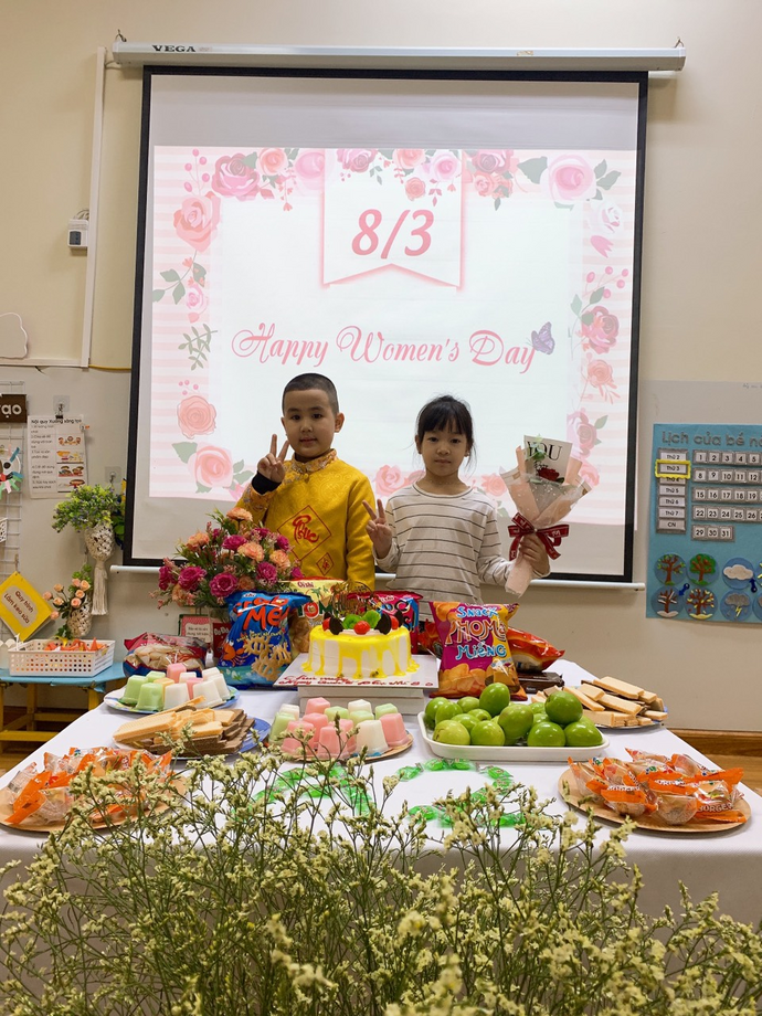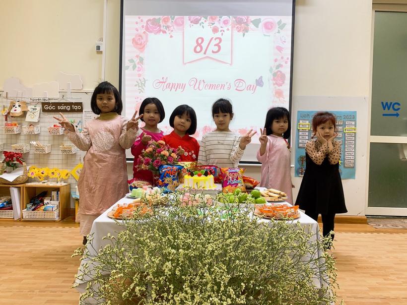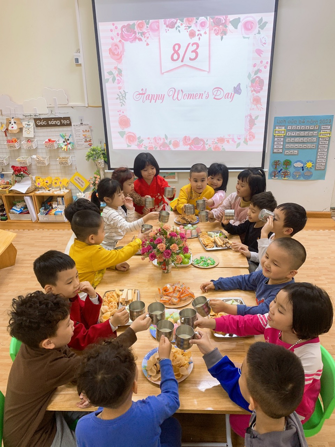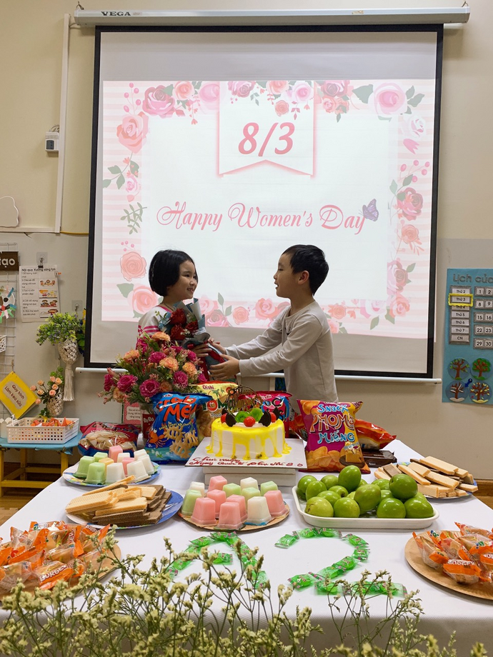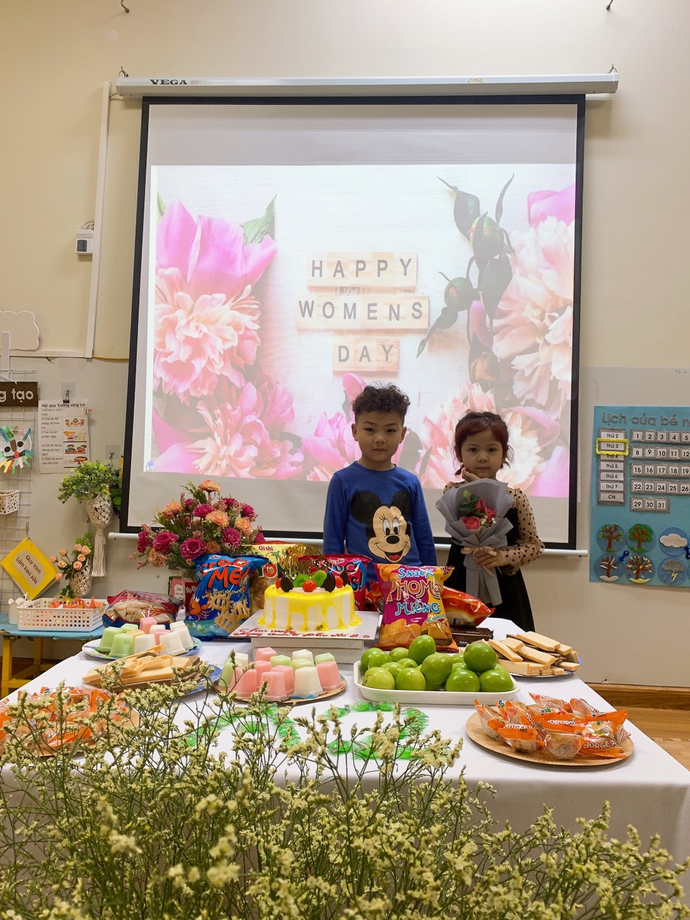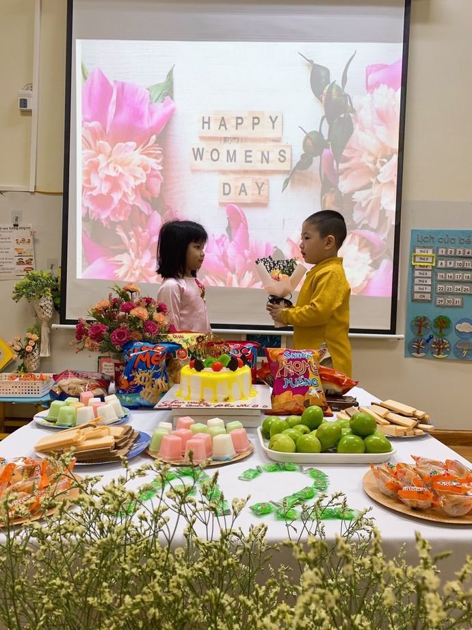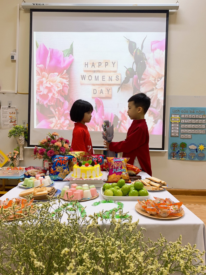 Không những thế, các con còn được liên hoan chào mừng ngày 8/3, các bạn gái còn nhận được những món quà nhỏ xinh, ý nghĩa của các bạn trai trong lớp dành tặng.