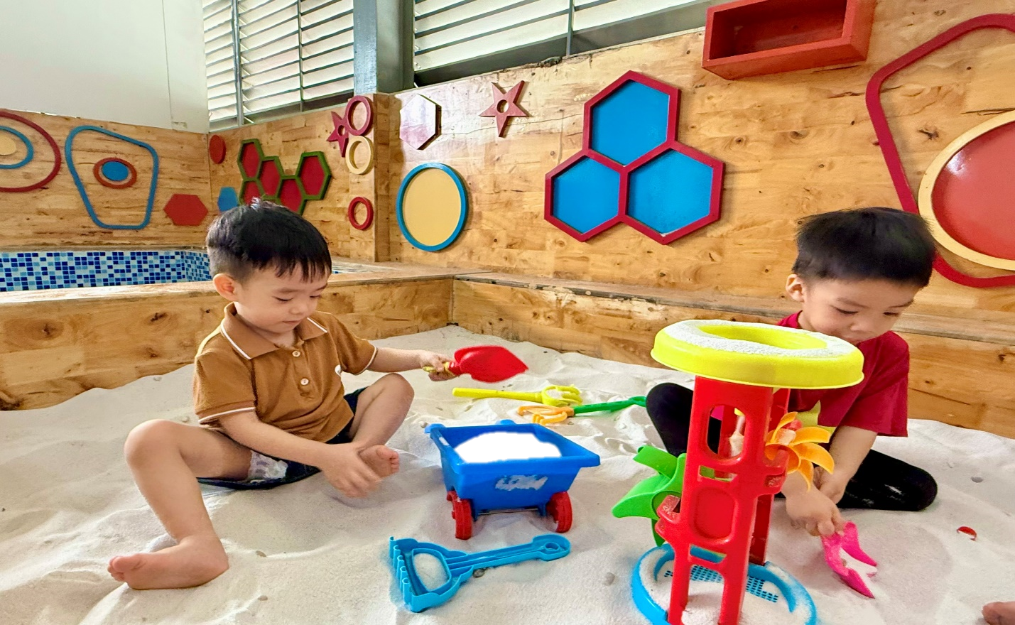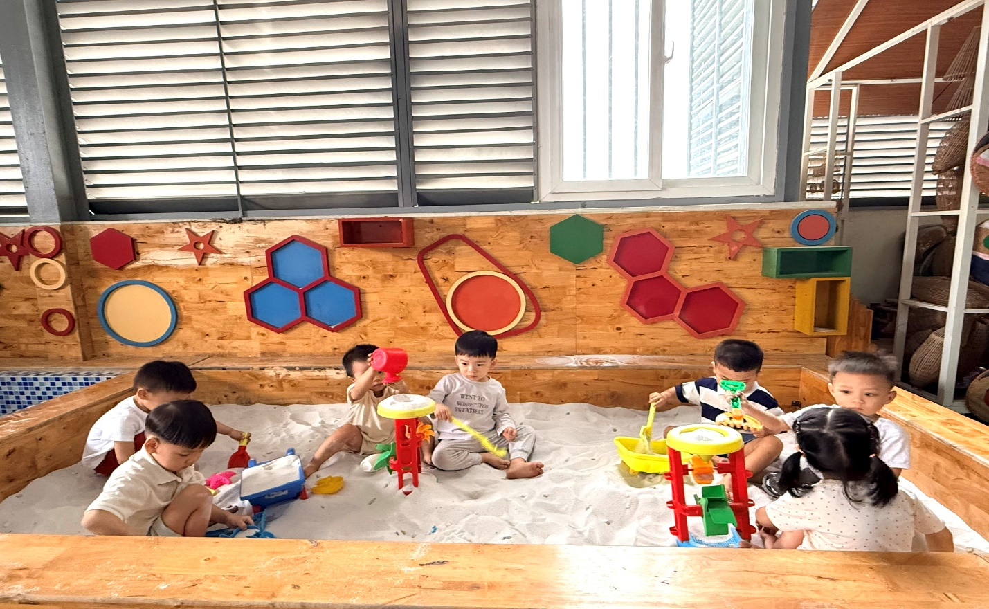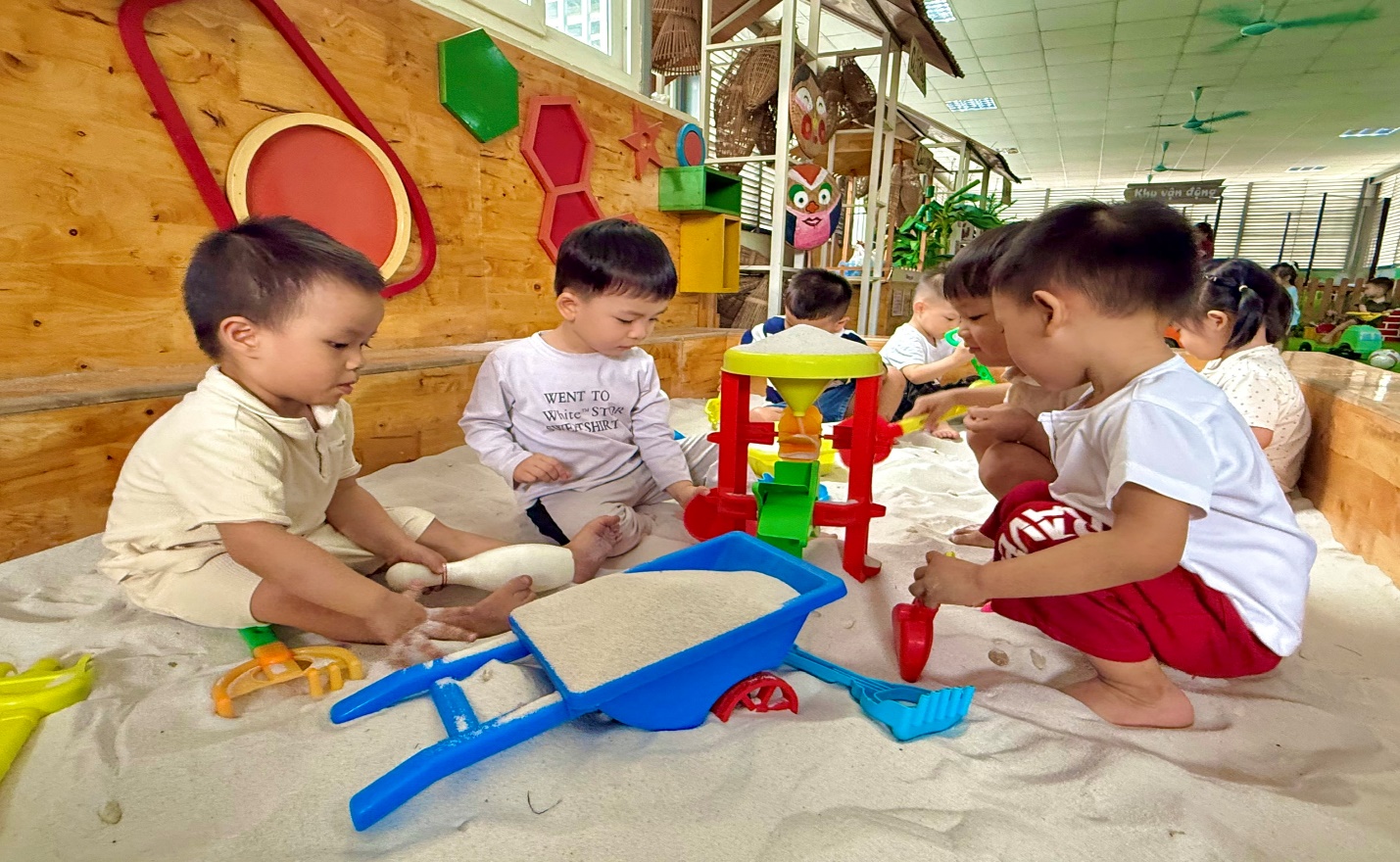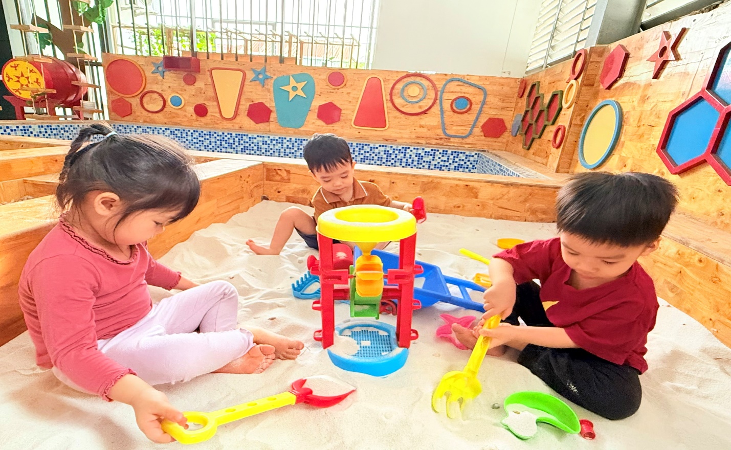 Các con say sưa xúc, đổ, sử dụng guồng quay và những chiếc khuôn xinh xắn để tạo hình. Việc tiếp xúc với cát không chỉ giúp trẻ phát triển xúc giác mà còn kích thích trí tưởng tượng phong phú.