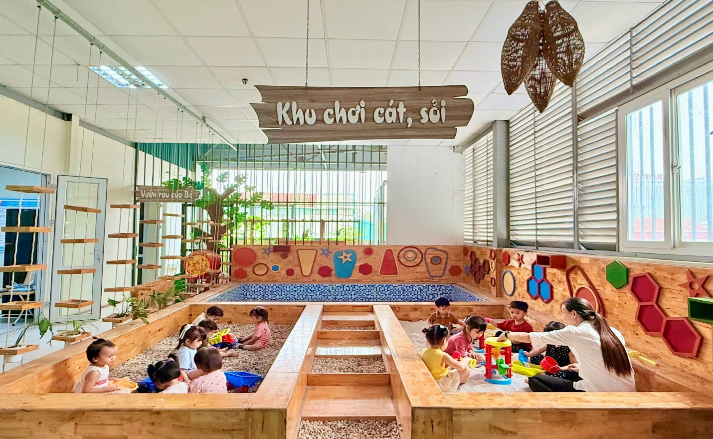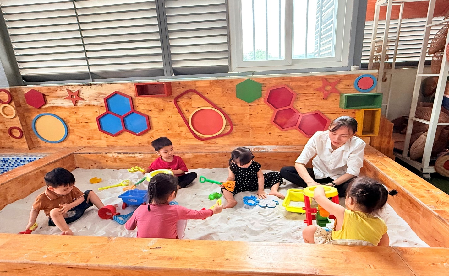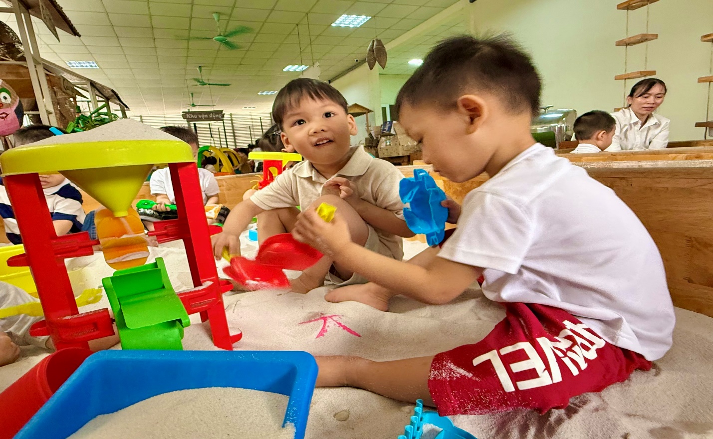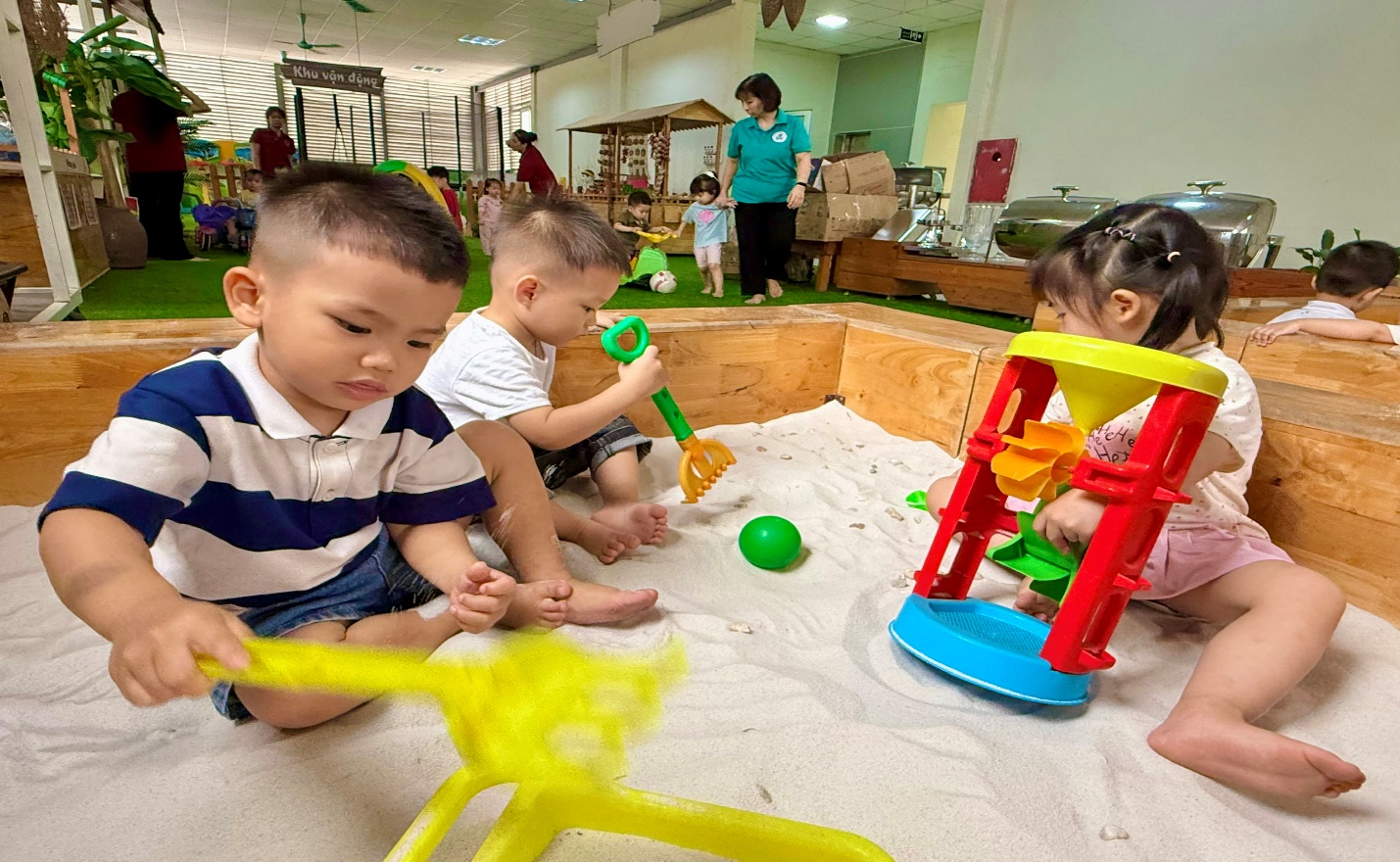 Các con say sưa xúc, đổ, sử dụng guồng quay và những chiếc khuôn xinh xắn để tạo hình. Việc tiếp xúc với cát không chỉ giúp trẻ phát triển xúc giác mà còn kích thích trí tưởng tượng phong phú.