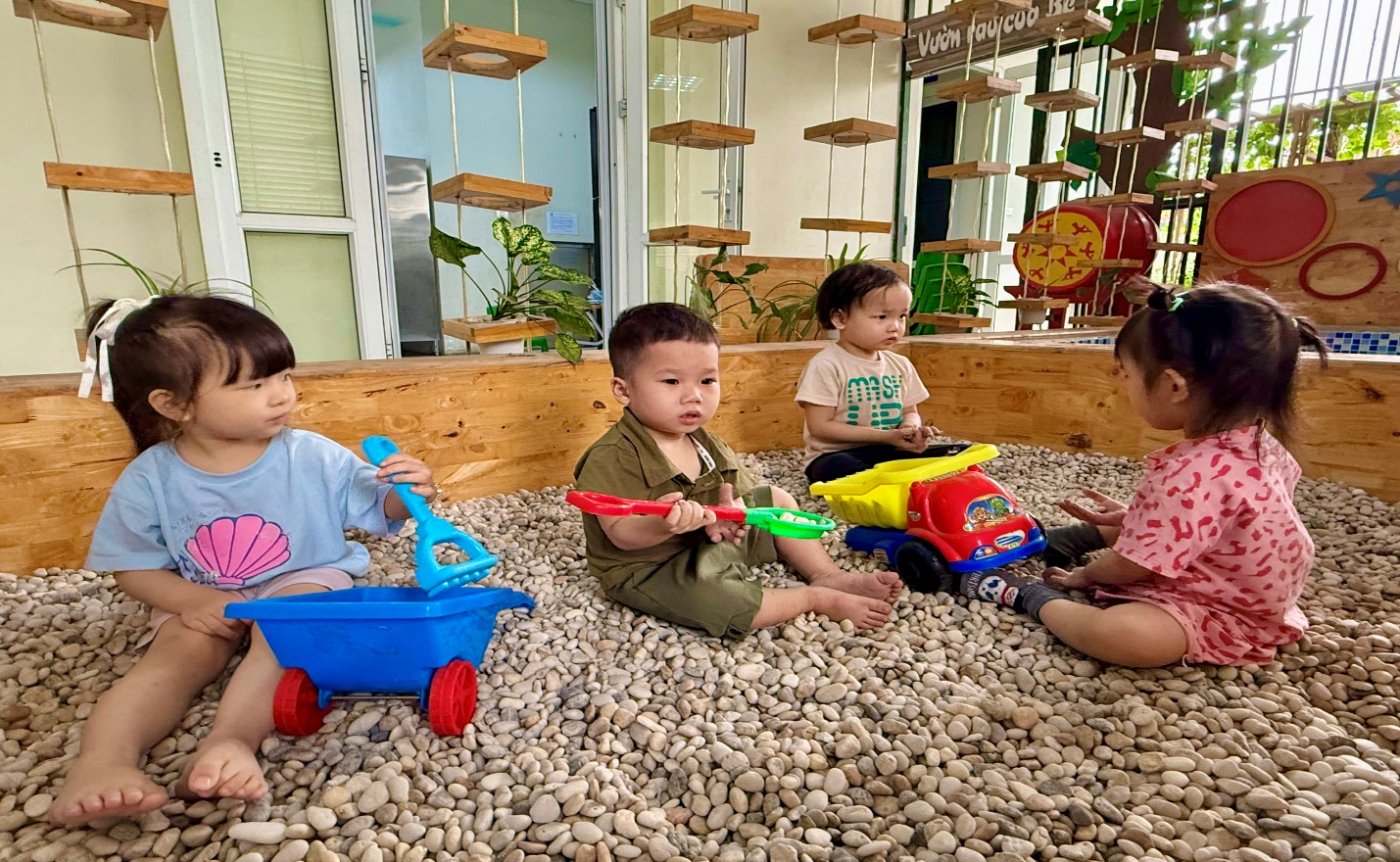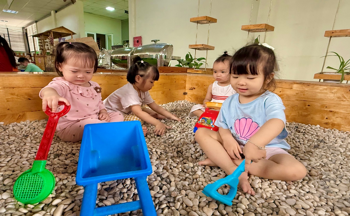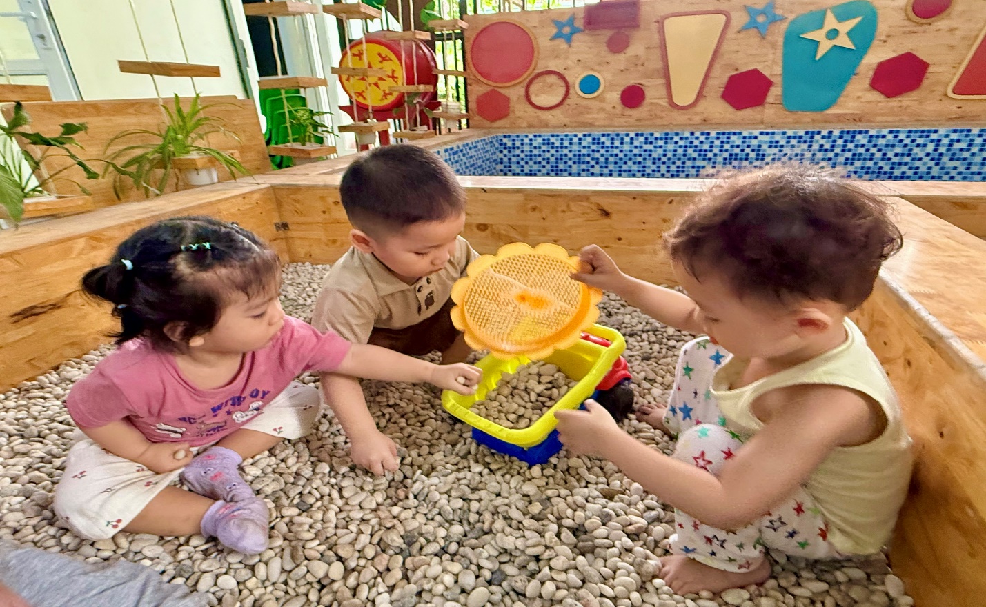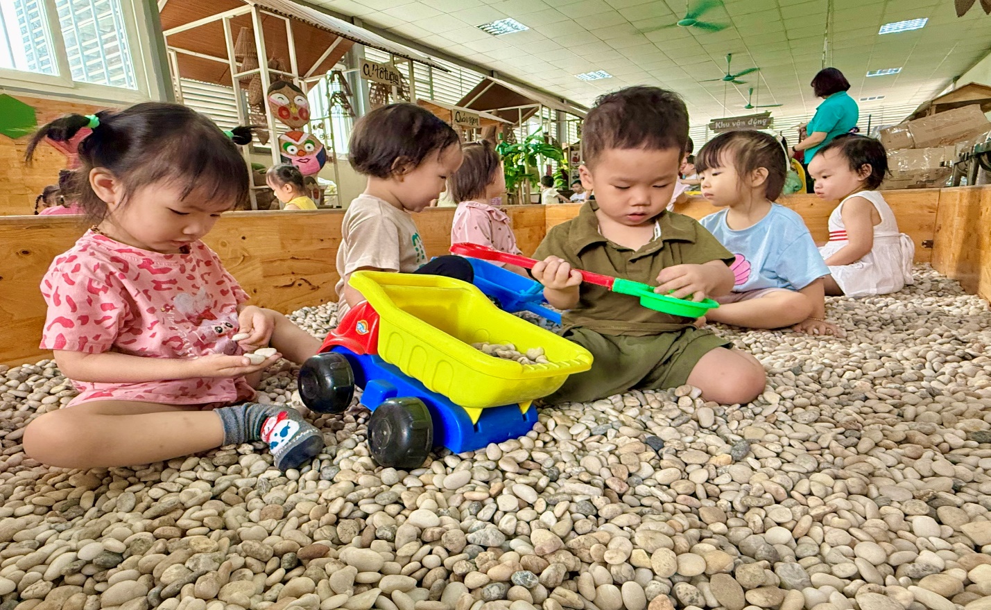 Tiếng sỏi lạo xạo dưới chân, những chiếc xe tải chở đầy "vật liệu" rời bến... tất cả tạo nên một bài học về thiên nhiên cực kỳ sống động. Chơi với sỏi giúp các bé rèn luyện sự khéo léo của đôi bàn tay và sự kiên nhẫn.