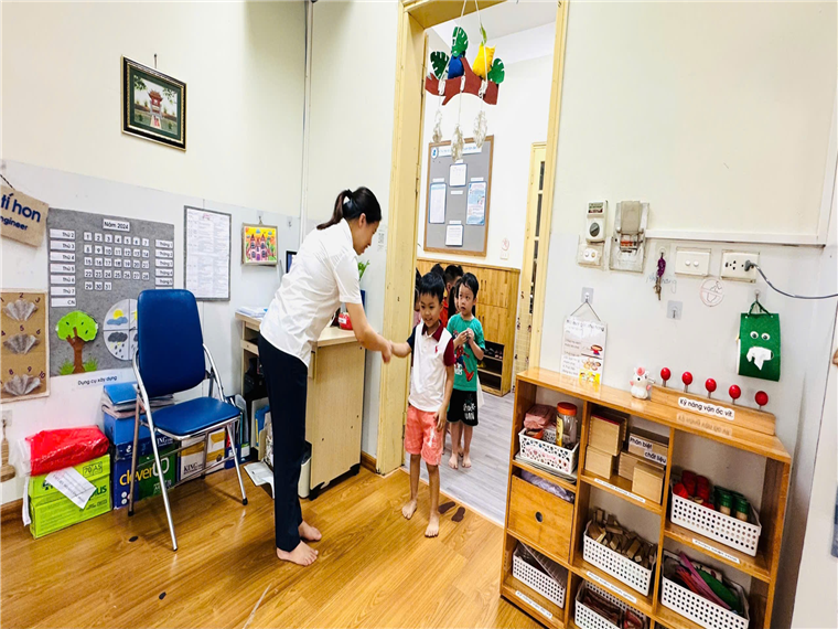 Bước vào lớp, các bé nhanh nhẹn cất gọn dép vào kệ, treo ba lô đúng chỗ, thể hiện sự trưởng thành và kỹ năng tự phục vụ đã được rèn luyện. Các cô giáo luôn kịp thời động viên, nhắc nhở nhẹ nhàng, giúp trẻ hứng thú hơn với nề nếp đầu năm.