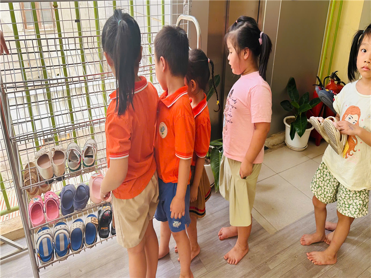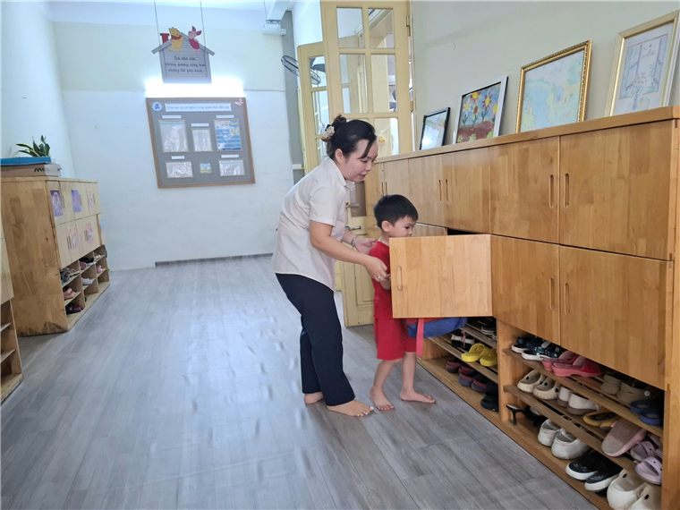 Các bé đến lớp được học kí năng cất dép, cất ba lô gọn gàng