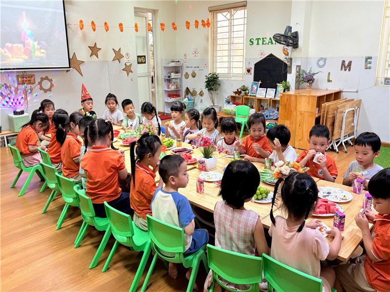 Ngoài các hoạt động vui chơi, các bé cùng nhau tham dự một bữa tiệc liên hoan nhẹ do cô giáo chuẩn bị. Những chiếc bánh xinh xắn, ly sữa thơm ngon là món quà nho nhỏ để chào đón năm học mới. Trẻ cùng nhau tạo nên khoảnh khắc gắn kết đầu năm đầy ý nghĩa.