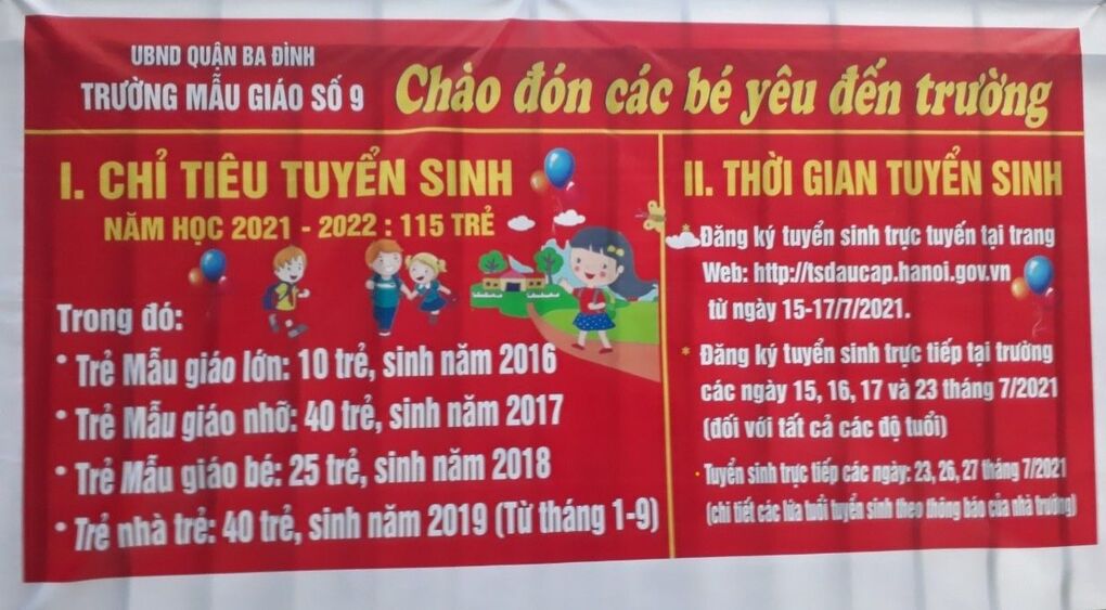 Đã sắp tới ngày đăng ký tuyển sinh vào trường Mẫu giáo Số 9, các bậc phụ huynh có con ở độ tuổi Mầm non đến đăng ký tuyển sinh tại trường theo hình thức trực tiếp từ ngày 15, 16, 17 và 23/7/2021; trực tuyến (đối với trẻ sinh năm 2016) trong 03 ngày 15,16,17/7/2021.