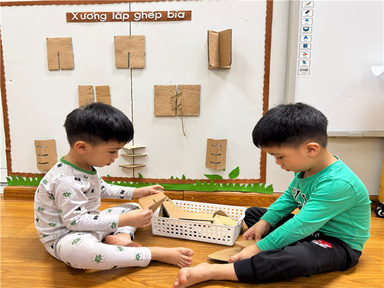 Những "kỹ sư nhí" đang say sưa lắp ghép, tạo nên những công trình kỳ vĩ từ các hình khối bằng bìa, các khối gỗ... các cô đã chuẩn bị. Qua đó, trẻ rèn luyện tư duy logic, khả năng quan sát, tính kiên trì và kỹ năng hợp tác.