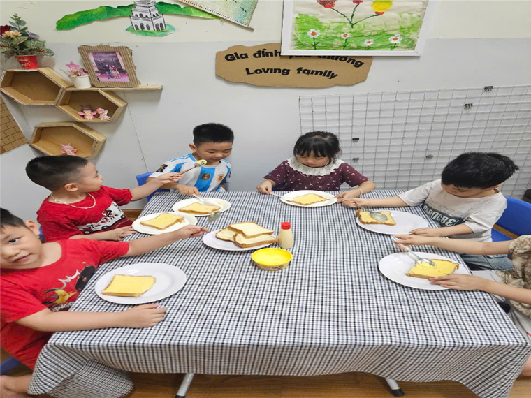 Các đầu bếp của lớp B2 đang làm món bánh mỳ phết bơ