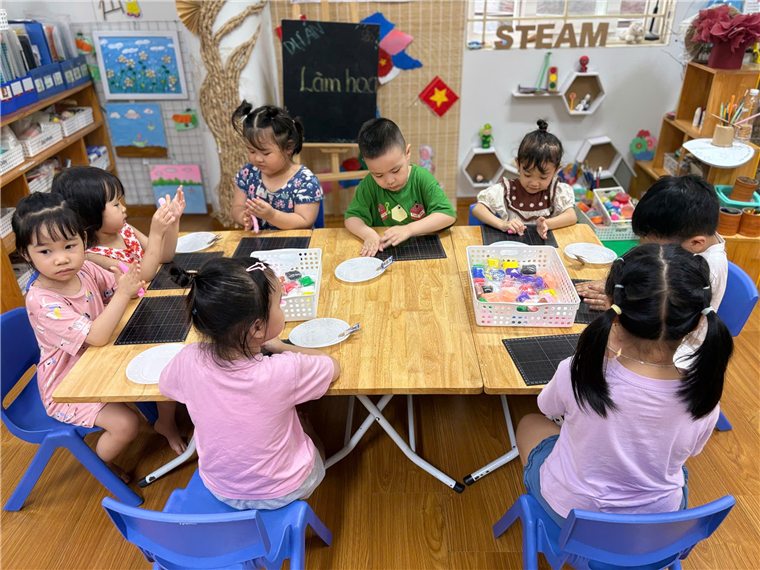 Ở góc Nghệ Thuật với đa dạng nguyên liệu như: bút màu, đất nặn, giấy, hồ dán...đây là công cụ để các "họa sĩ nhí" thỏa sức sáng tạo, thể hiện trí tưởng tượng phong phú và rèn luyện sự khéo léo của đôi tay.