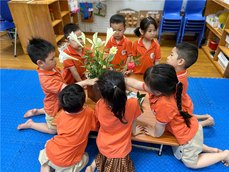 Các bé đang cùng nhau cắm bình hoa loa kèn