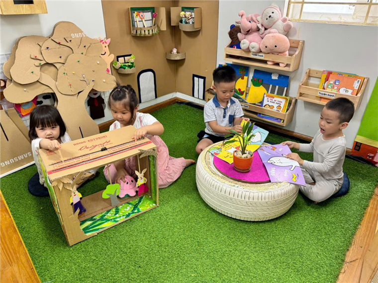 Những cuốn truyện tranh, sách ảnh đầy màu sắc thu hút các bé khám phá, làm quen với chữ cái, bồi đắp tình yêu với sách và phát triển ngôn ngữ. Những bài tập về hình hay các chữ số các cô chuẩn bị phong phú giúp các con hưng thú hơn ở góc đọc sách.