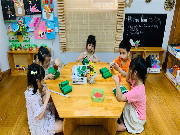 Ở góc Nghệ thuật, những họa sĩ nhí đang thỏa sức sáng tạo với đủ loại màu sắc và chất liệu. Những bức tranh nguệch ngoạc nhưng đầy cảm xúc, những con vật ngộ nghĩnh được tạo ra từ giấy, lá cây hay những chiếc vỏ hộp cũ... tất cả đều là những tác phẩm độc đáo mang đậm dấu ấn cá nhân của từng bé. Hoạt động này không chỉ giúp các bé phát triển khả năng thẩm mỹ, sự khéo léo của đôi tay mà còn là một cách tuyệt vời để các bé thể hiện cảm xúc và khám phá thế giới xung quanh.