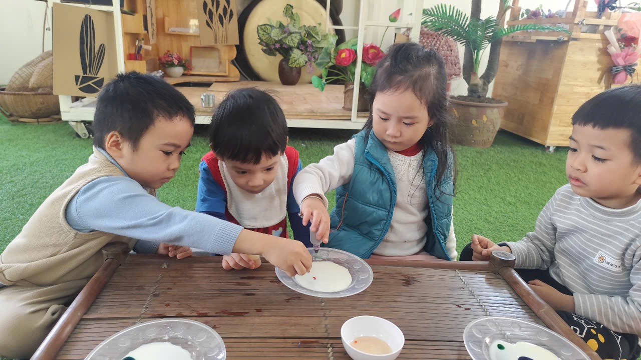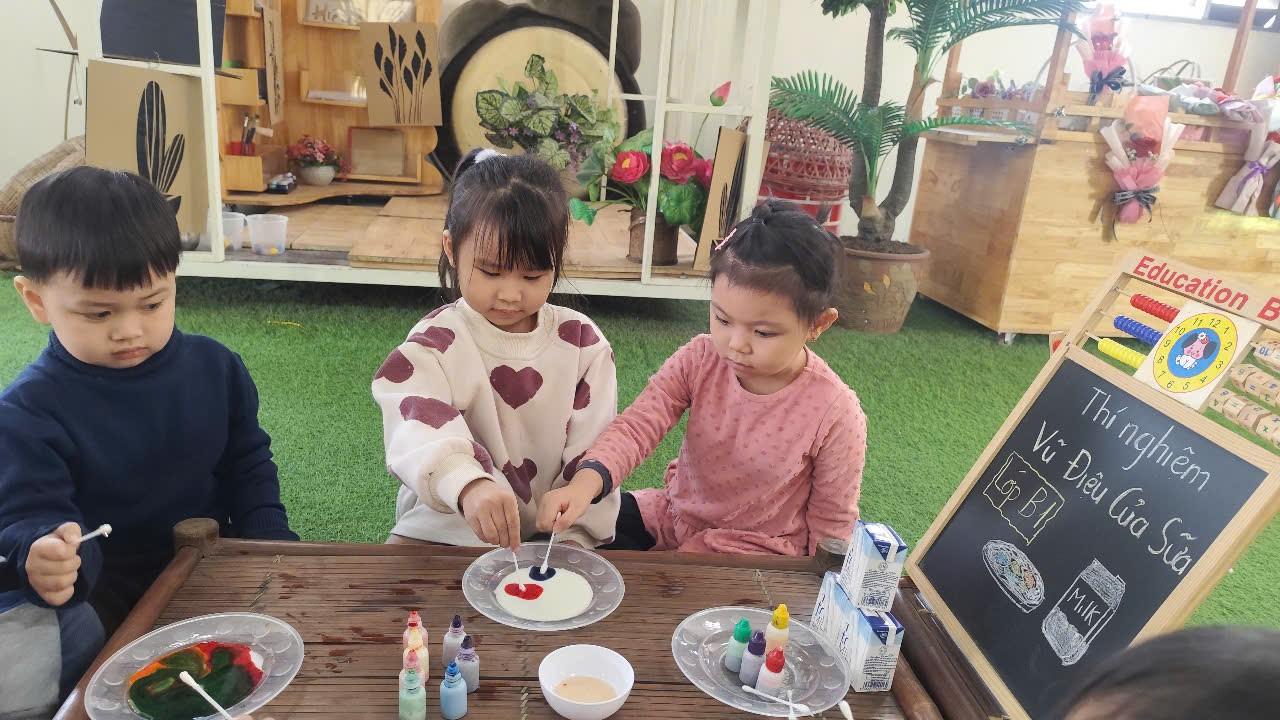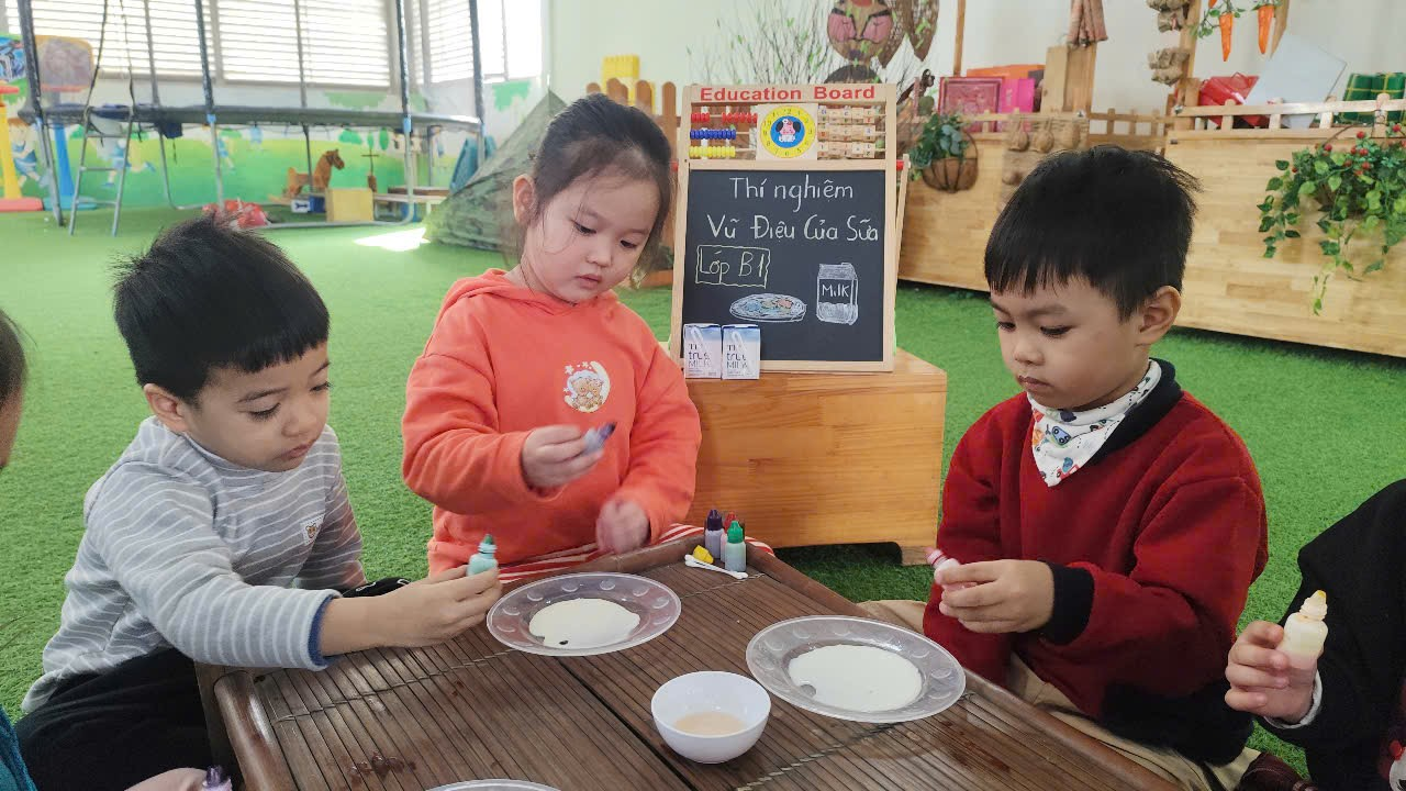 Với những nguyên liệu chính như: Sữa; Nước rửa bát; Màu thực phẩm; Tăm bông... Các bạn nhỏ lớp mẫu giáo bé C2 đã có một thí nghiệm thú vị về sự bùng nổ màu sắc trên đĩa. Bí mật của sự bùng nổ màu sắc nằm ở tính chất hóa học: Trong sữa có nước và chất béo lơ lửng bên trong. Khi nước rửa bát tiếp xúc với sữa sẽ nhanh chóng chạy đi bắt giữ các phân tử chất béo. Sự “đuổi bắt” này làm màu sắc chạy khắp đĩa. Thật kì diệu phải không các bạn!