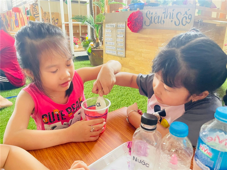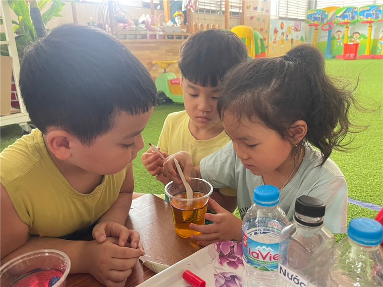 Dưới sự hướng dẫn tận tình của các cô giáo, các "nhà khoa học nhí" lớp MGL A2 được trang bị đầy đủ dụng cụ: khay nước, cốc nước (hoặc sữa, dầu ăn), màu thực phẩm hoặc màu nước an toàn, ống nhỏ giọt, que khuấy, và những tờ giấy trắng.