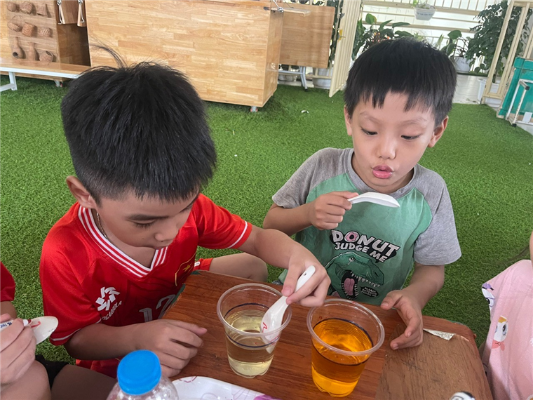 Với thìa khuấy trong tay, các con tự do "vẽ" nên những bức tranh trừu tượng của riêng mình. Đó có thể là những vòng xoáy ốc, những dải ngân hà, hay đơn giản là những mảng màu đan xen đầy ngẫu hứng.