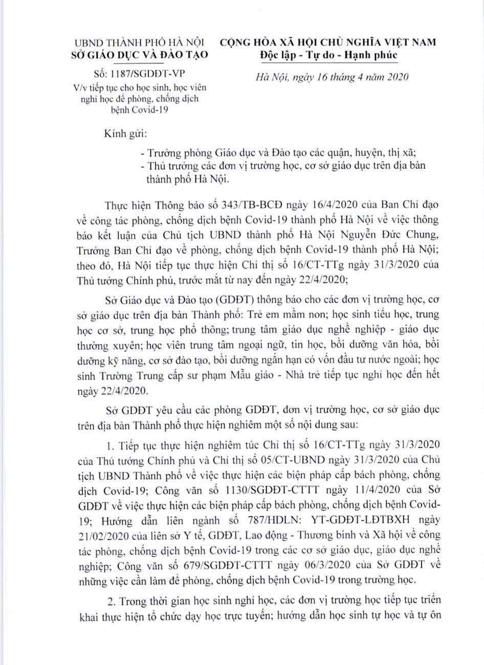Thông báo 1187/SGDĐT-VP ngày 16/42020 về việc tiếp tục cho học sinh nghỉ học đến hết ngày 22/4/2020 để phòng, chống dịch CoVid-19.