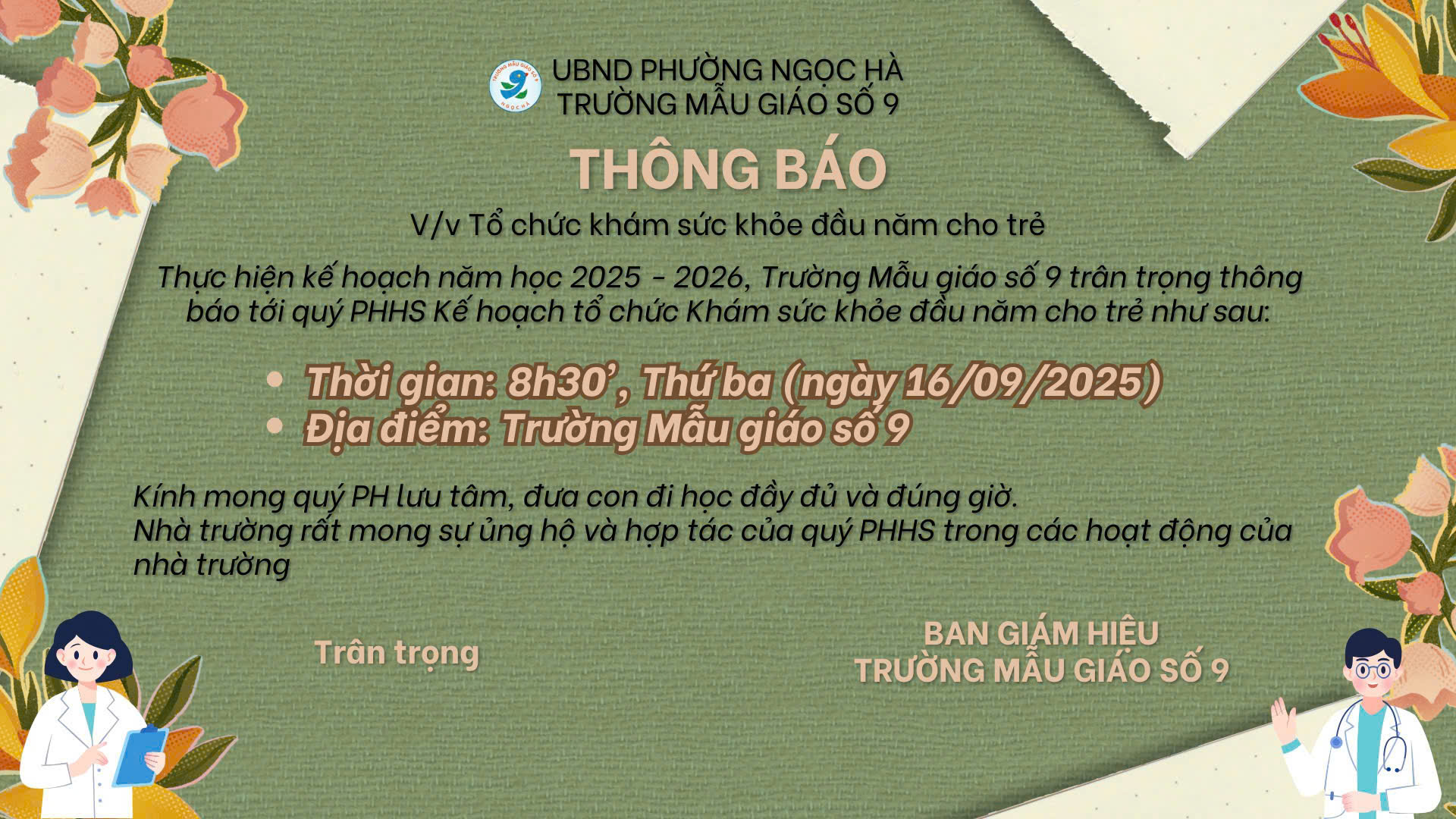 Thông báo tổ chức khám sức khỏe đầu năm cho học sinh trường Mẫu Giáo Số 9