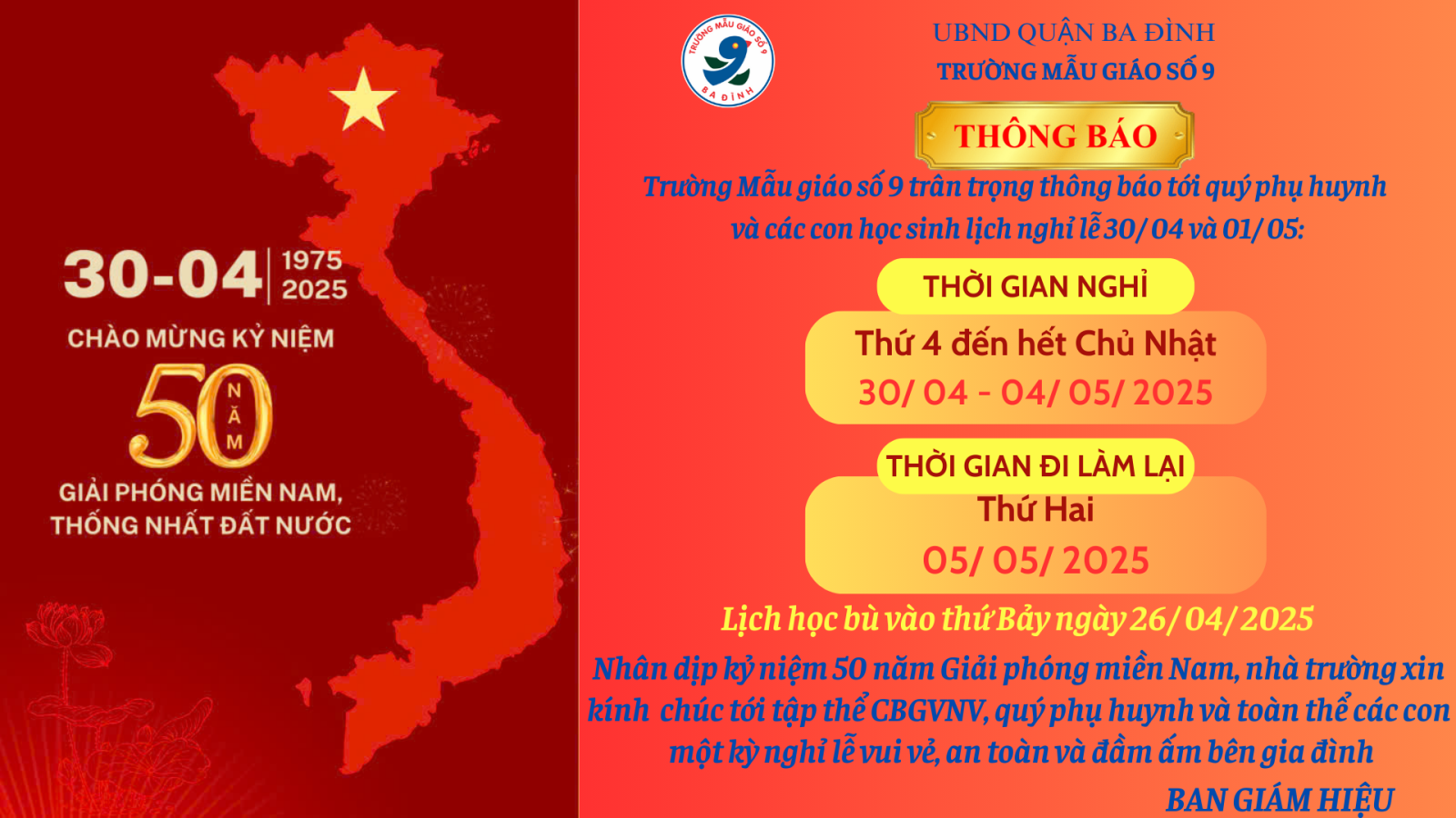 Thông báo về lịch Nghỉ lễ và học bù của trường Mẫu giáo số 9 dịp lễ 30/4 - 1/5