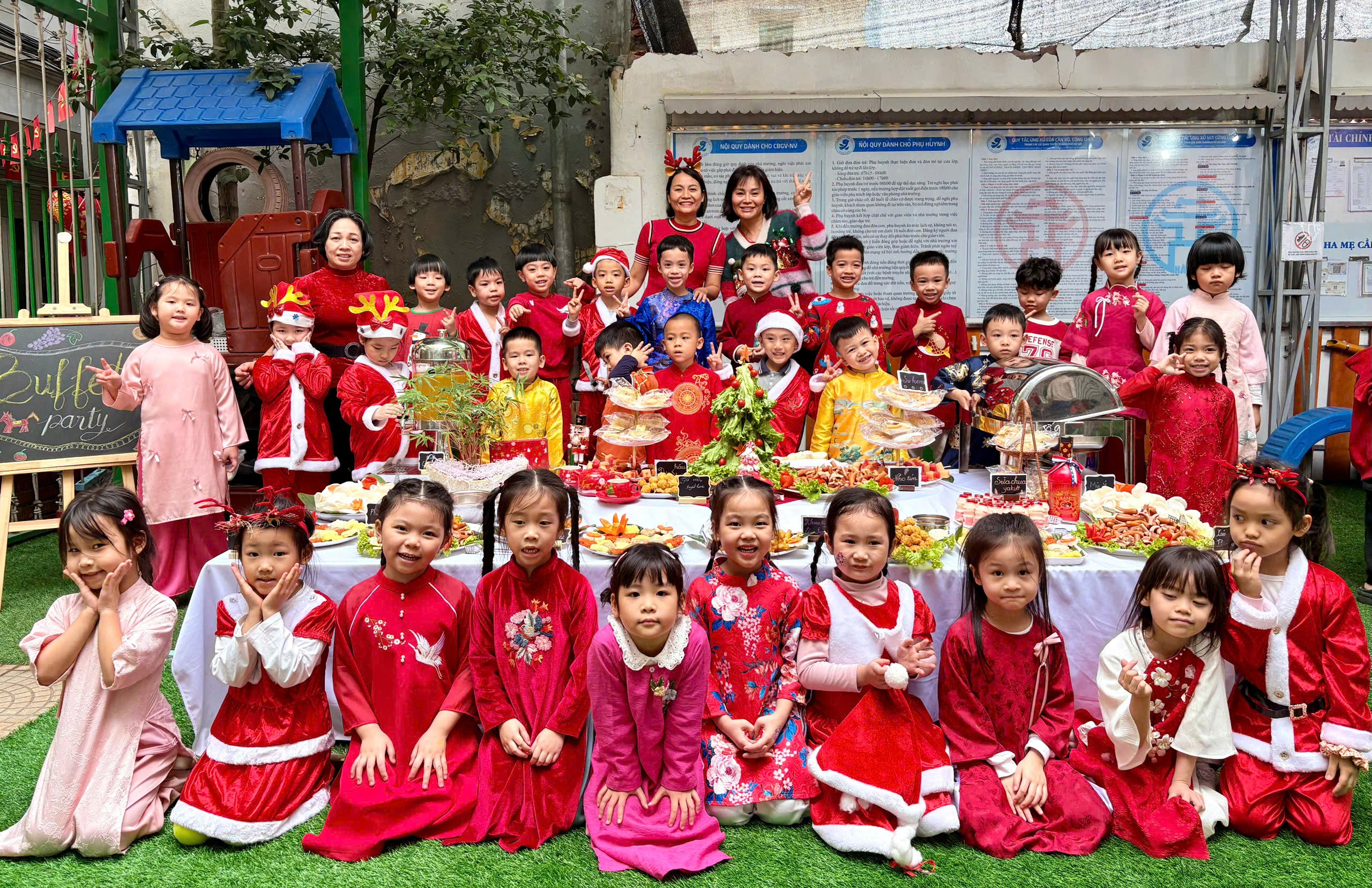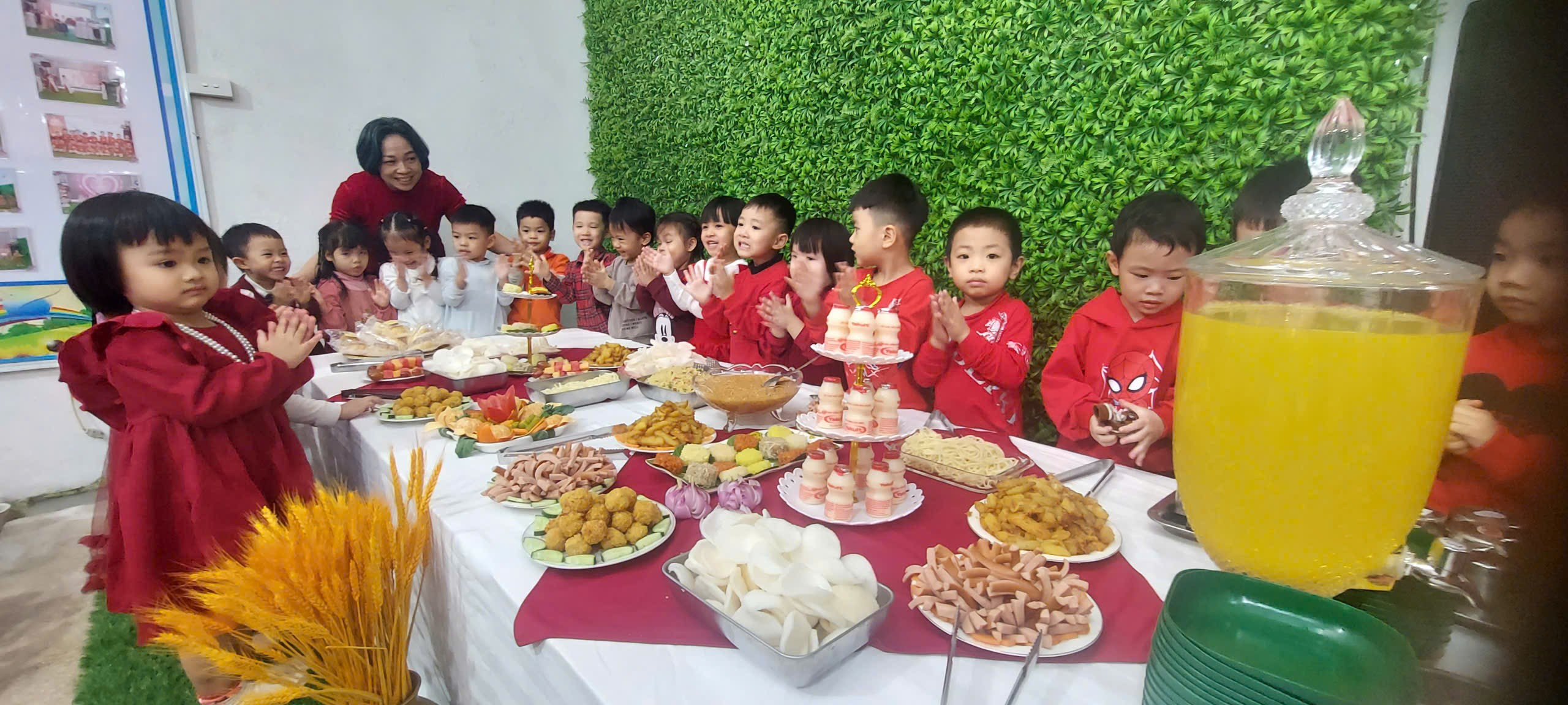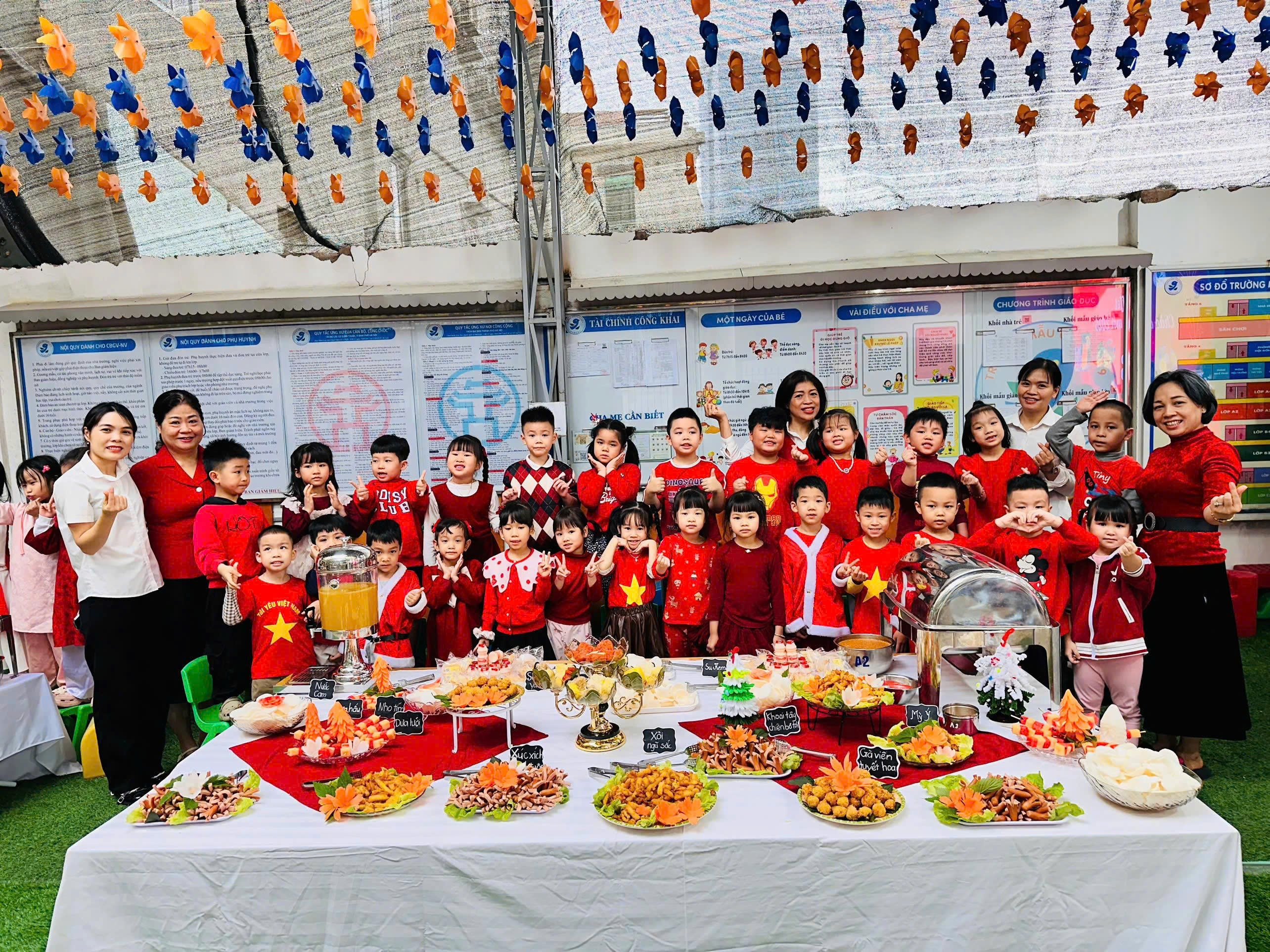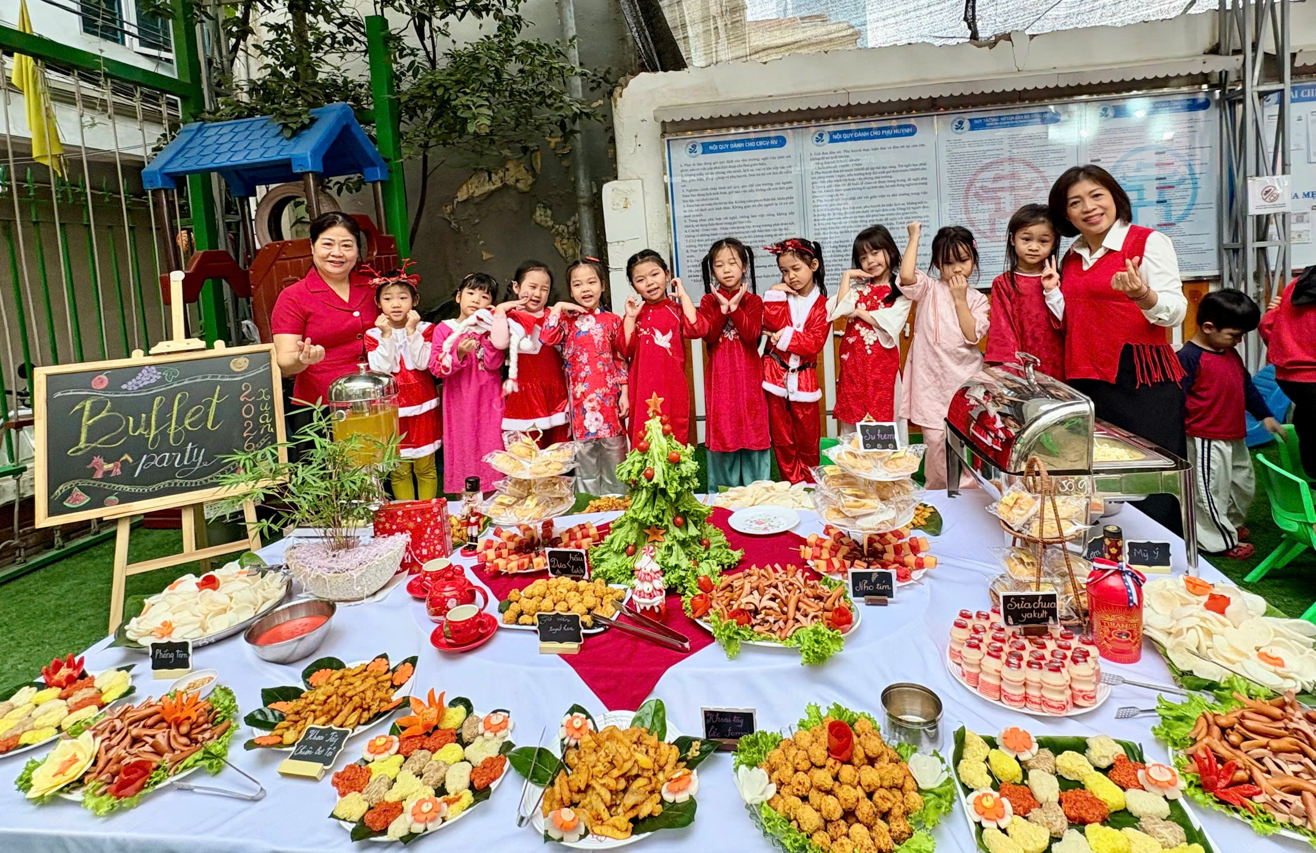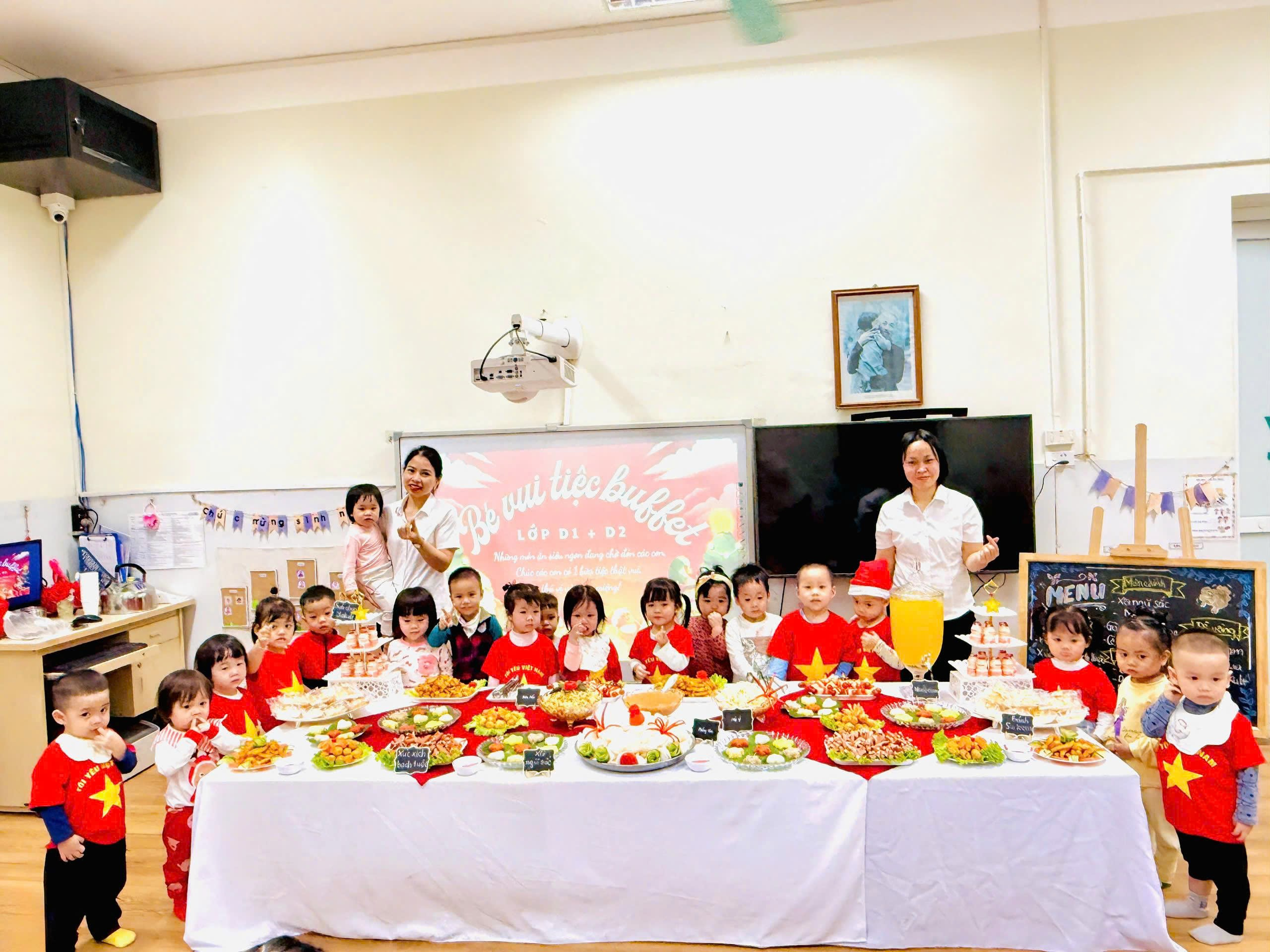 Bữa tiệc buffet được nhà trường chuẩn bị chu đáo với thực đơn phong phú, đảm bảo vệ sinh an toàn thực phẩm và cân đối dinh dưỡng, phù hợp với lứa tuổi mầm non. Thực đơn bao gồm: