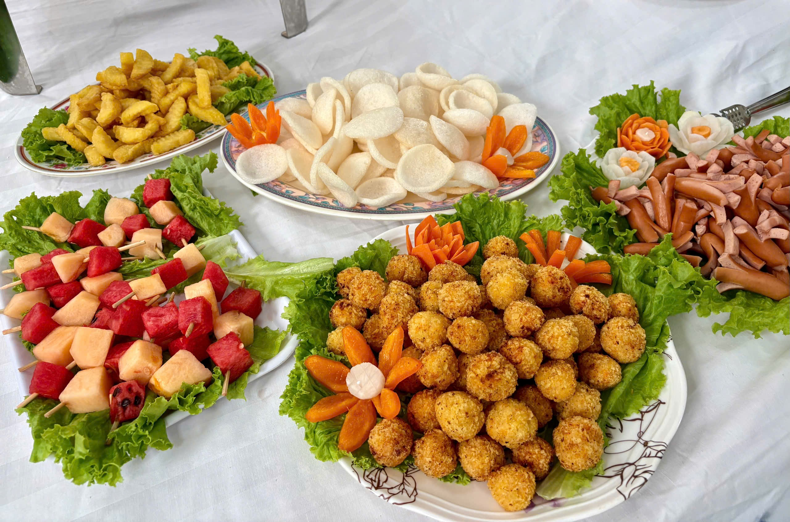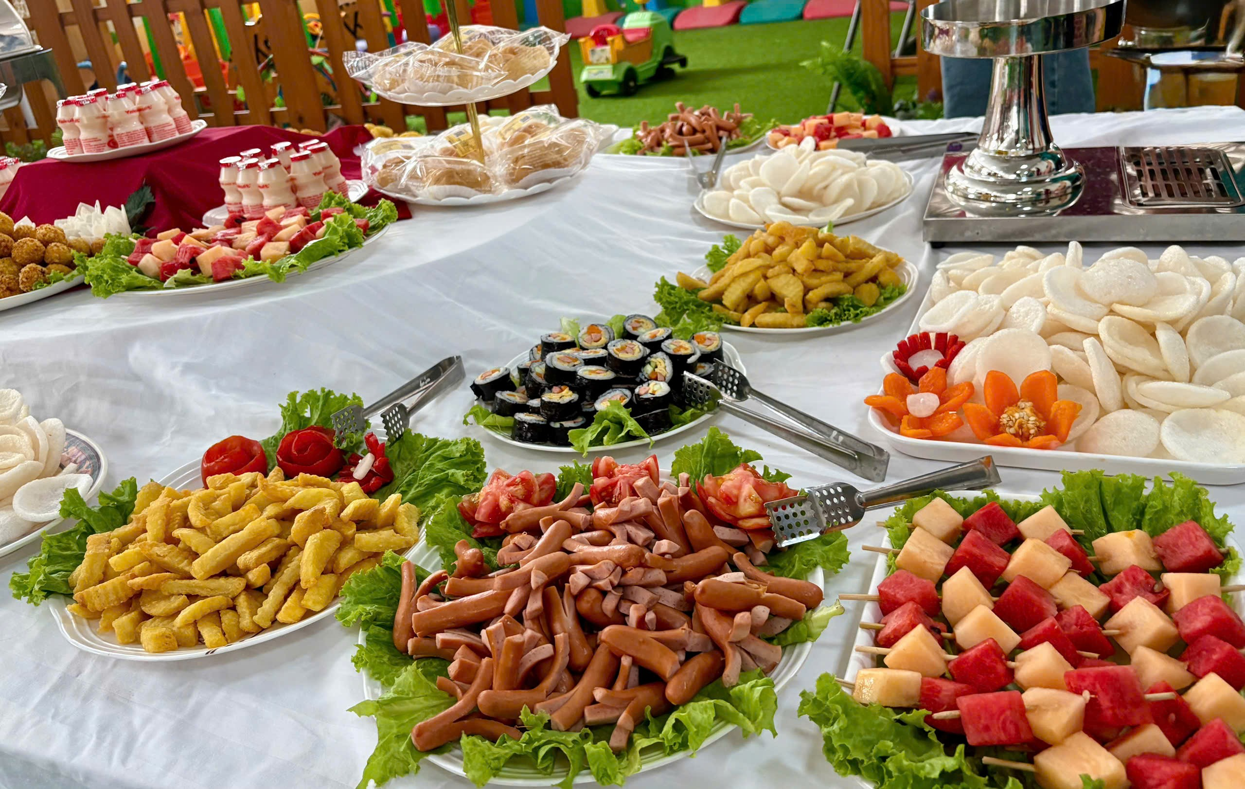 Bàn tiệc được các cô chuẩn bị chu đáo với nhiều món ăn phong phú, bắt mắt như: xúc xích, khoai chiên, cơm cuộn, bánh mì, trái cây tươi và sữa chua… Tất cả được trình bày đẹp mắt, sạch sẽ, tạo nên một “bữa tiệc nhỏ” đầy màu sắc khiến các bé vô cùng hào hứng.