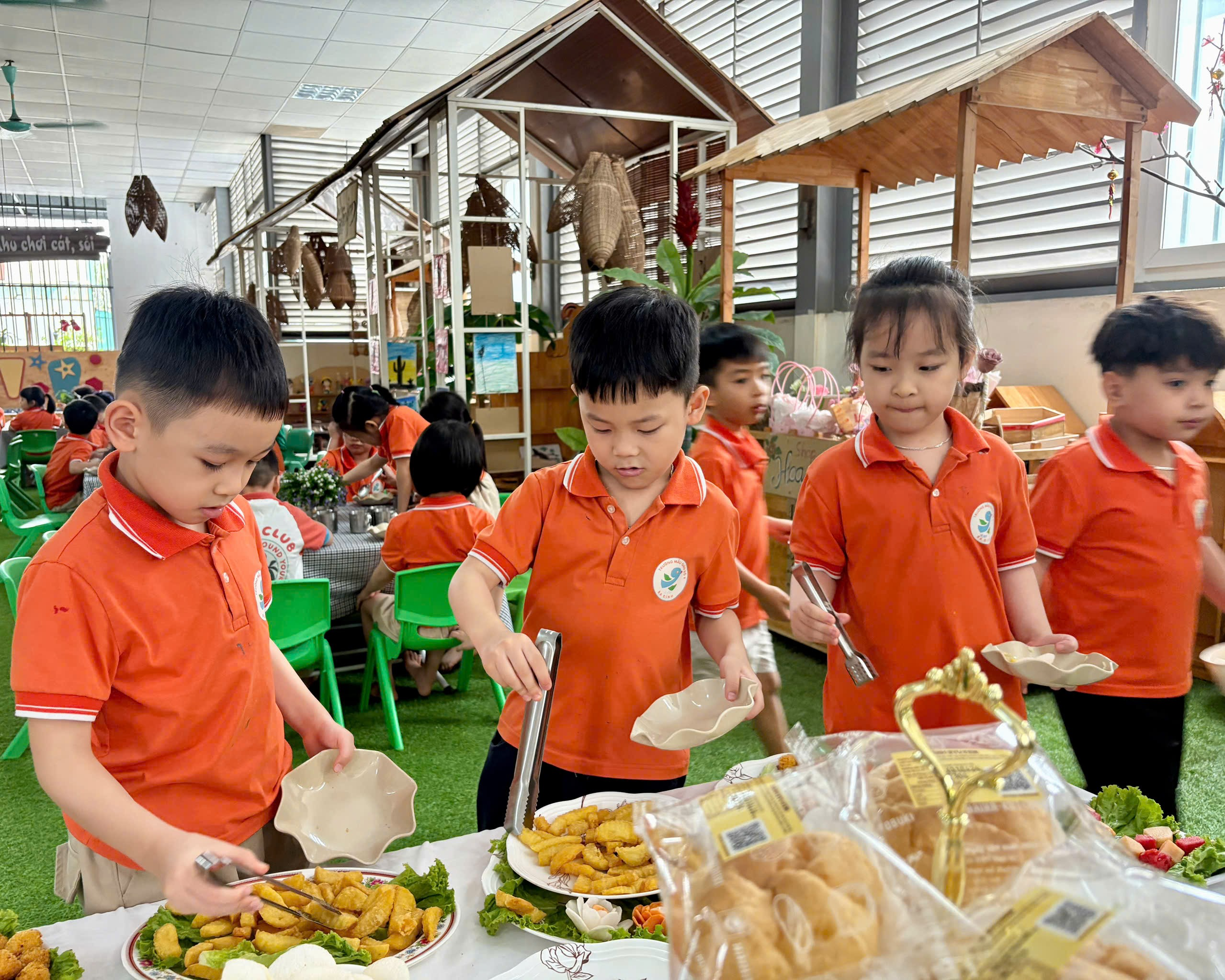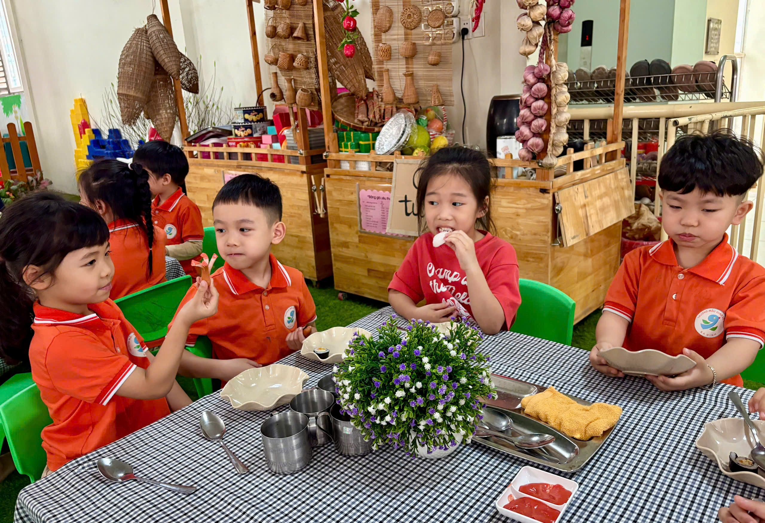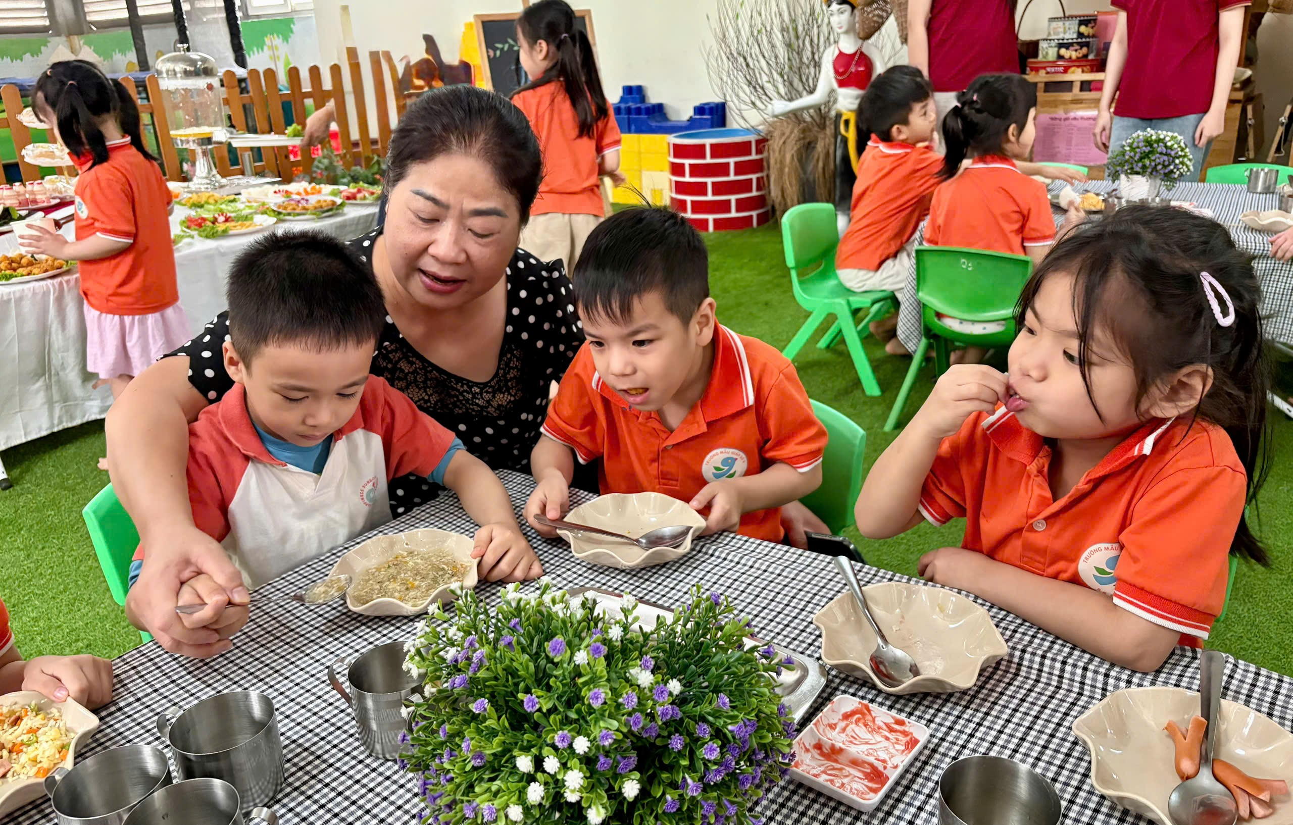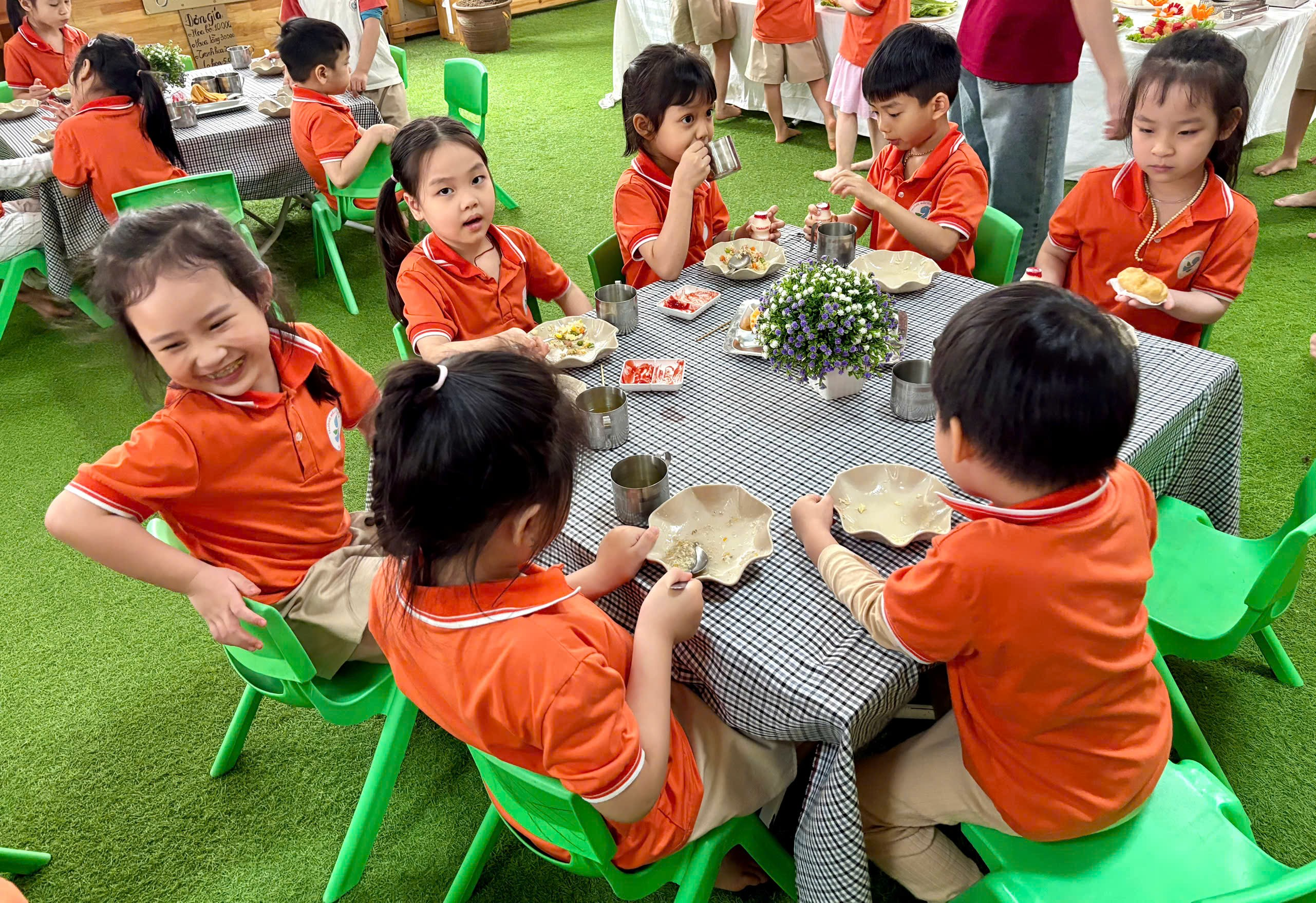 Không khí buổi tiệc tràn ngập tiếng cười. Các bé tỏ ra rất thích thú khi được cùng nhau thưởng thức món ăn, trò chuyện và trải nghiệm như một “bữa tiệc thật sự”. Đây cũng là cơ hội để các con thêm gắn bó với bạn bè và cô giáo.