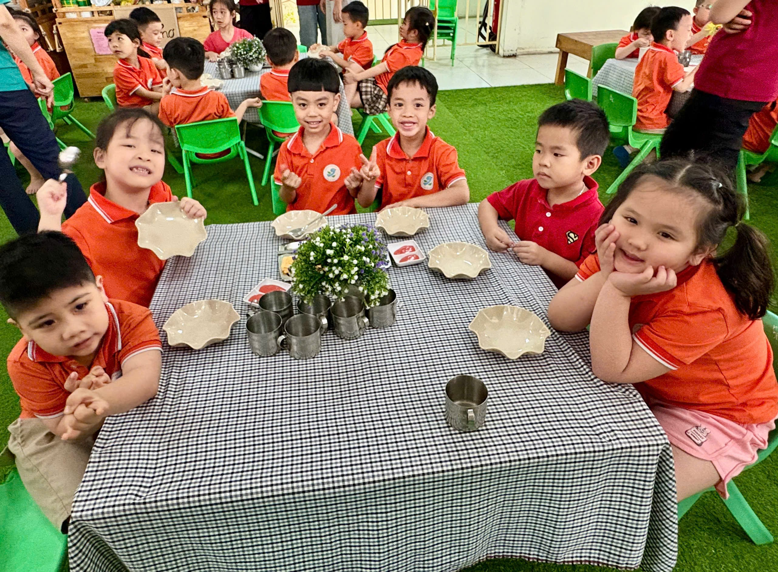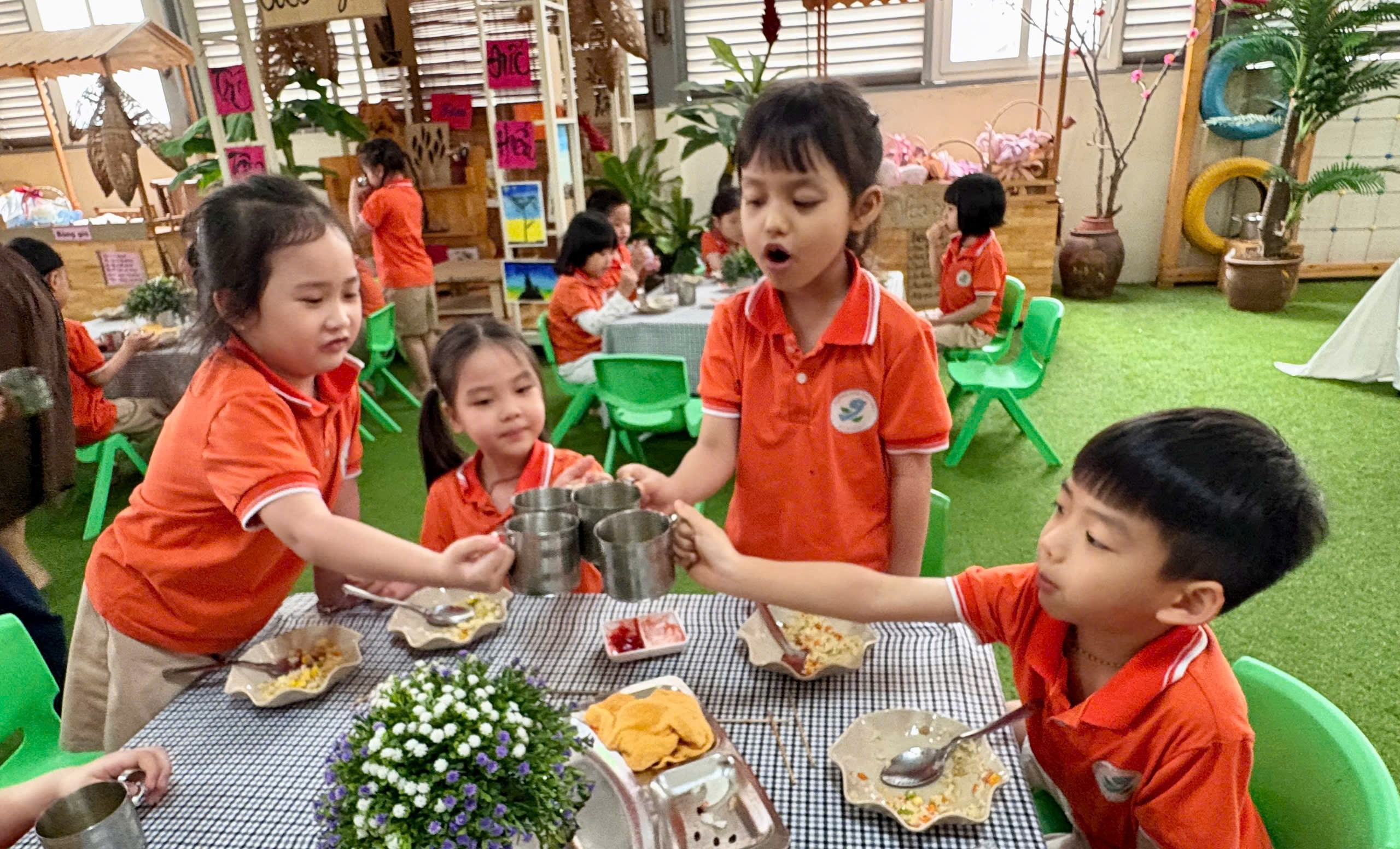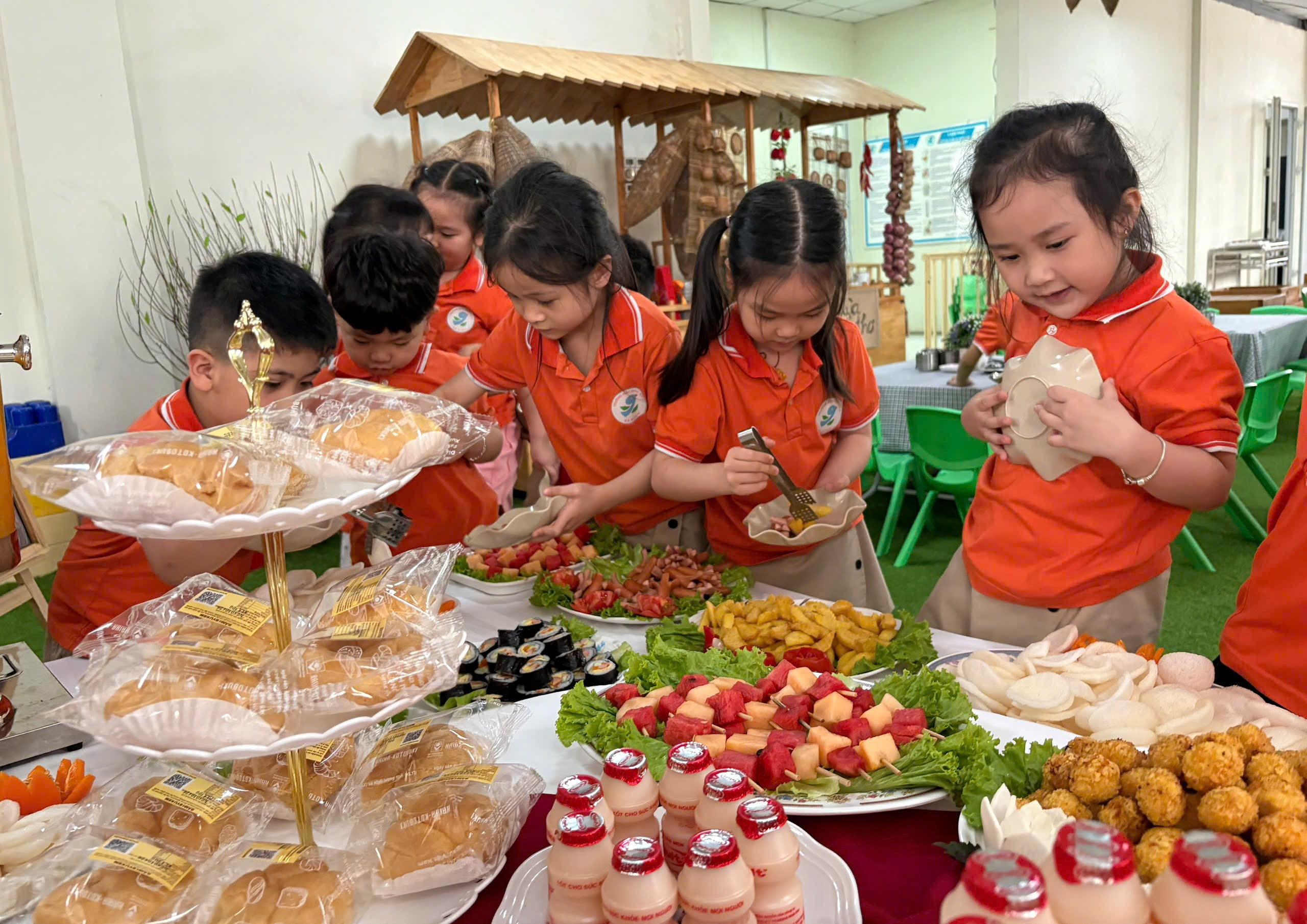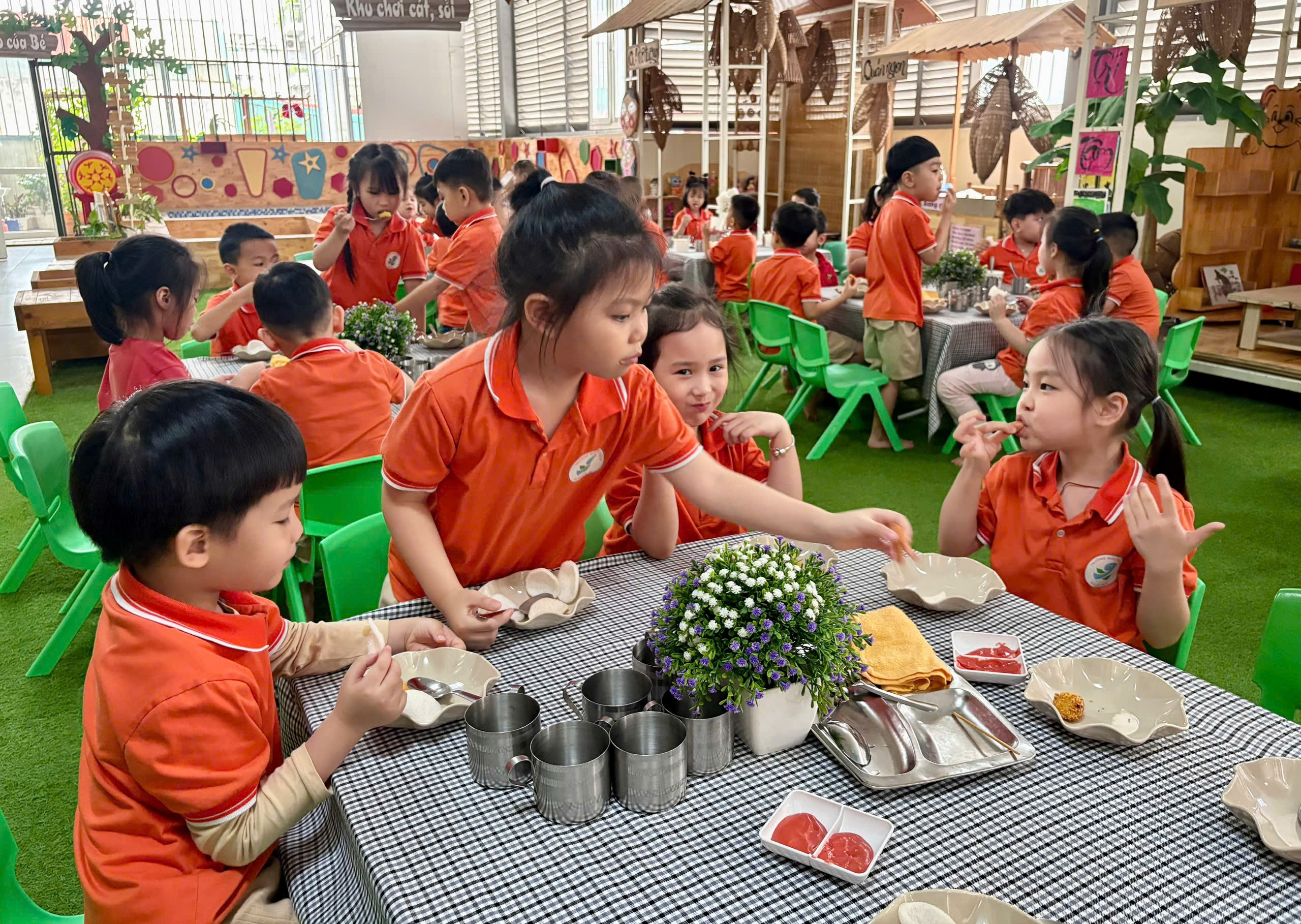 Không khí buổi tiệc tràn ngập tiếng cười. Các bé tỏ ra rất thích thú khi được cùng nhau thưởng thức món ăn, trò chuyện và trải nghiệm như một “bữa tiệc thật sự”. Đây cũng là cơ hội để các con thêm gắn bó với bạn bè và cô giáo.