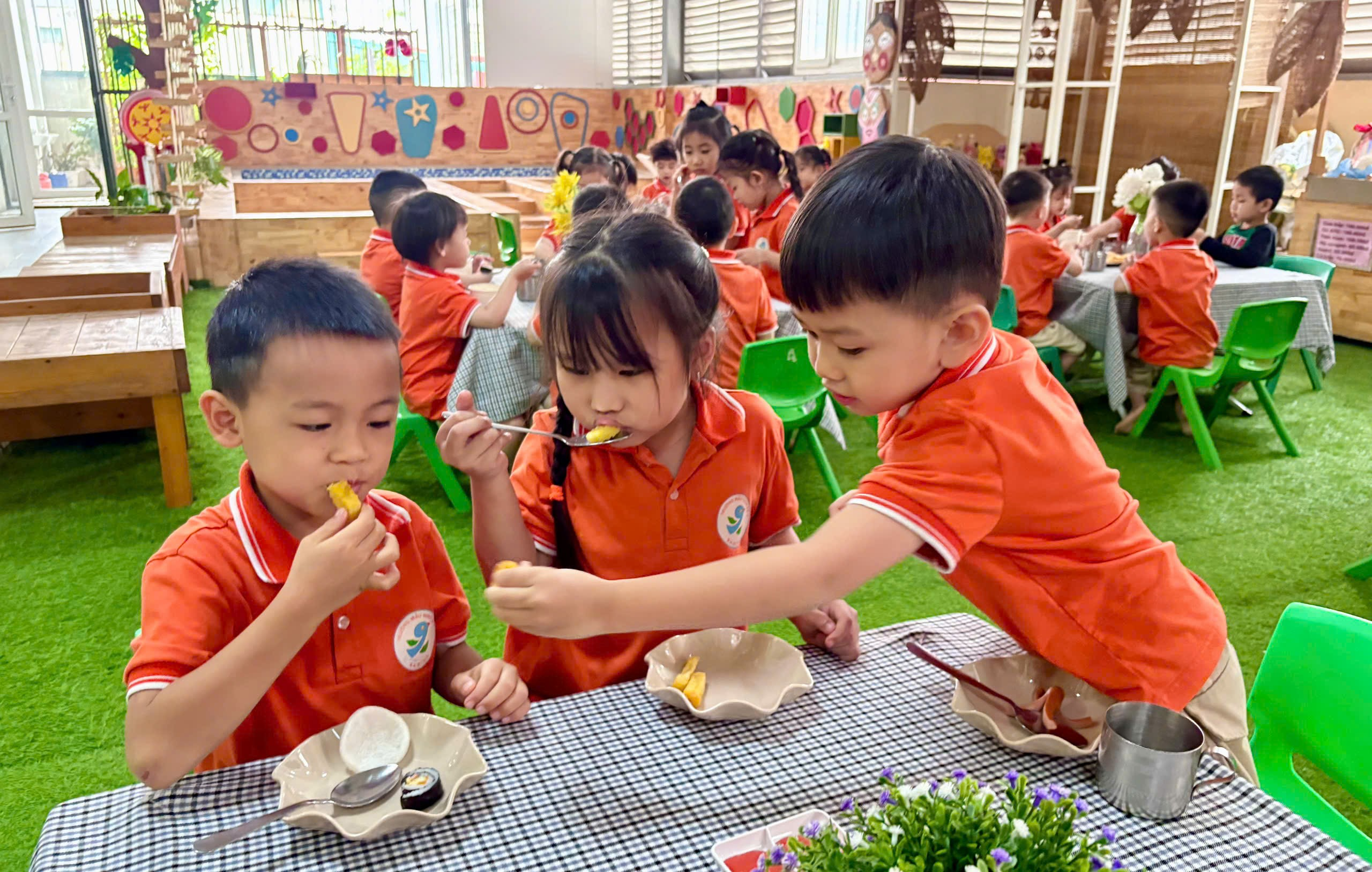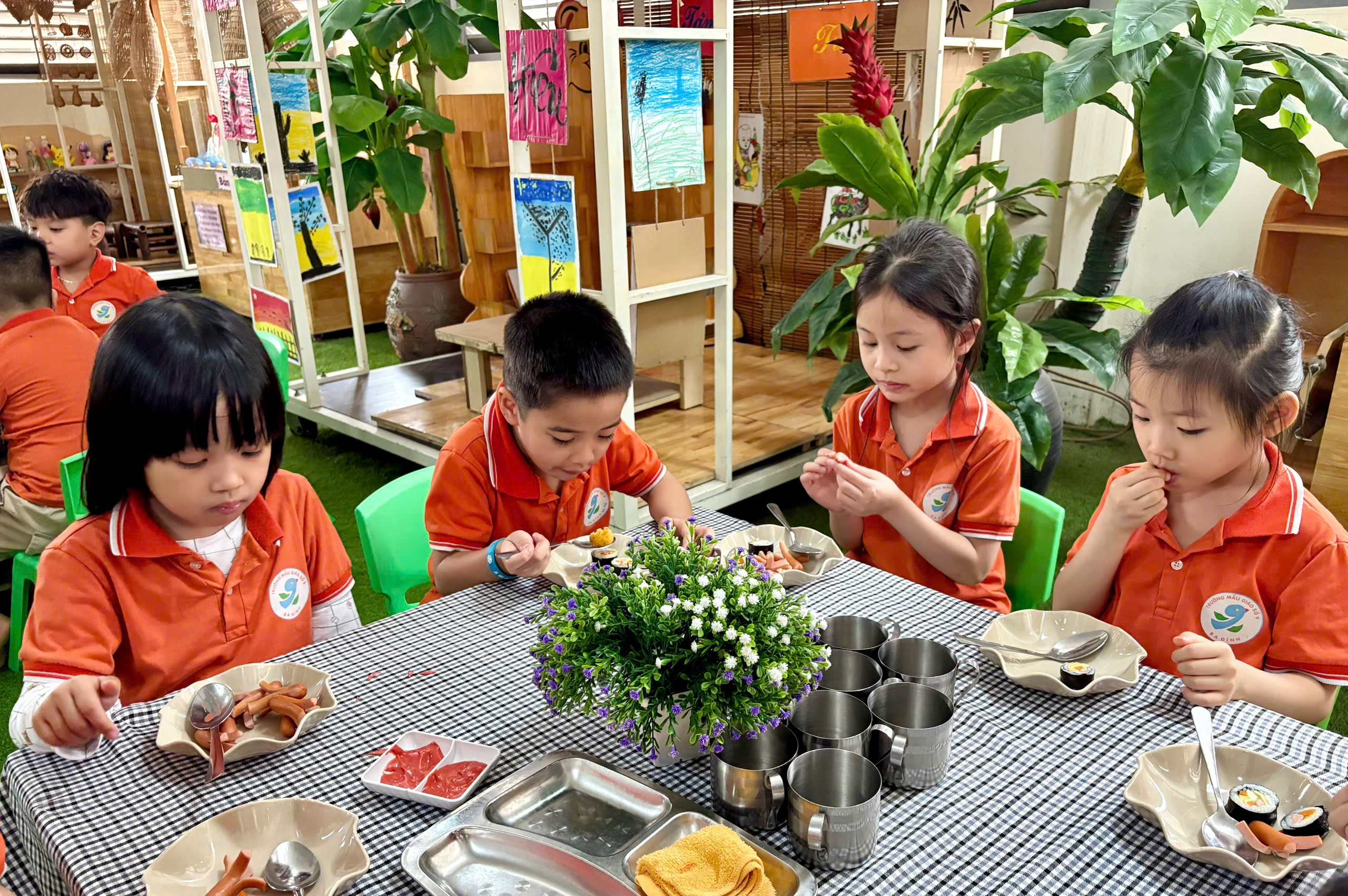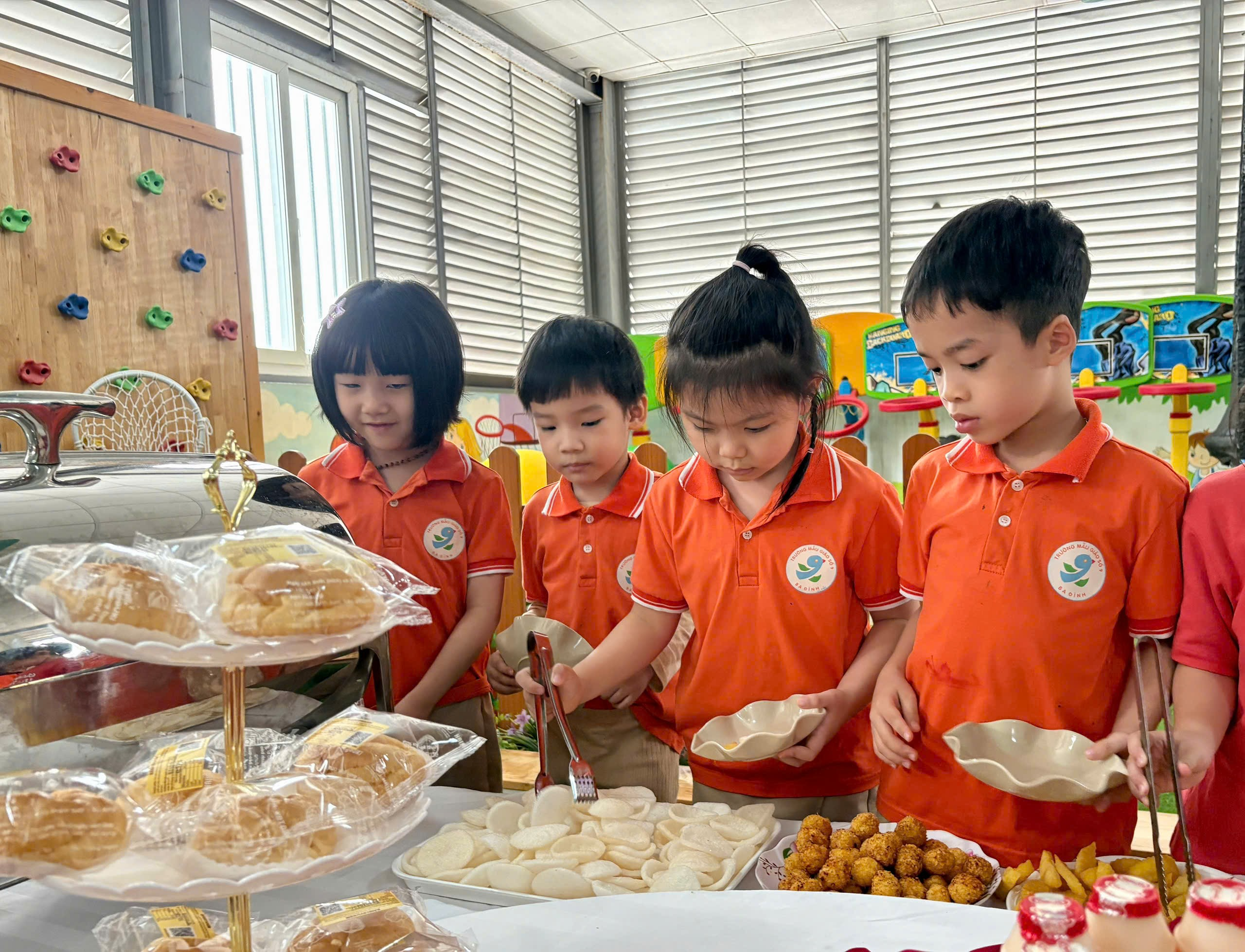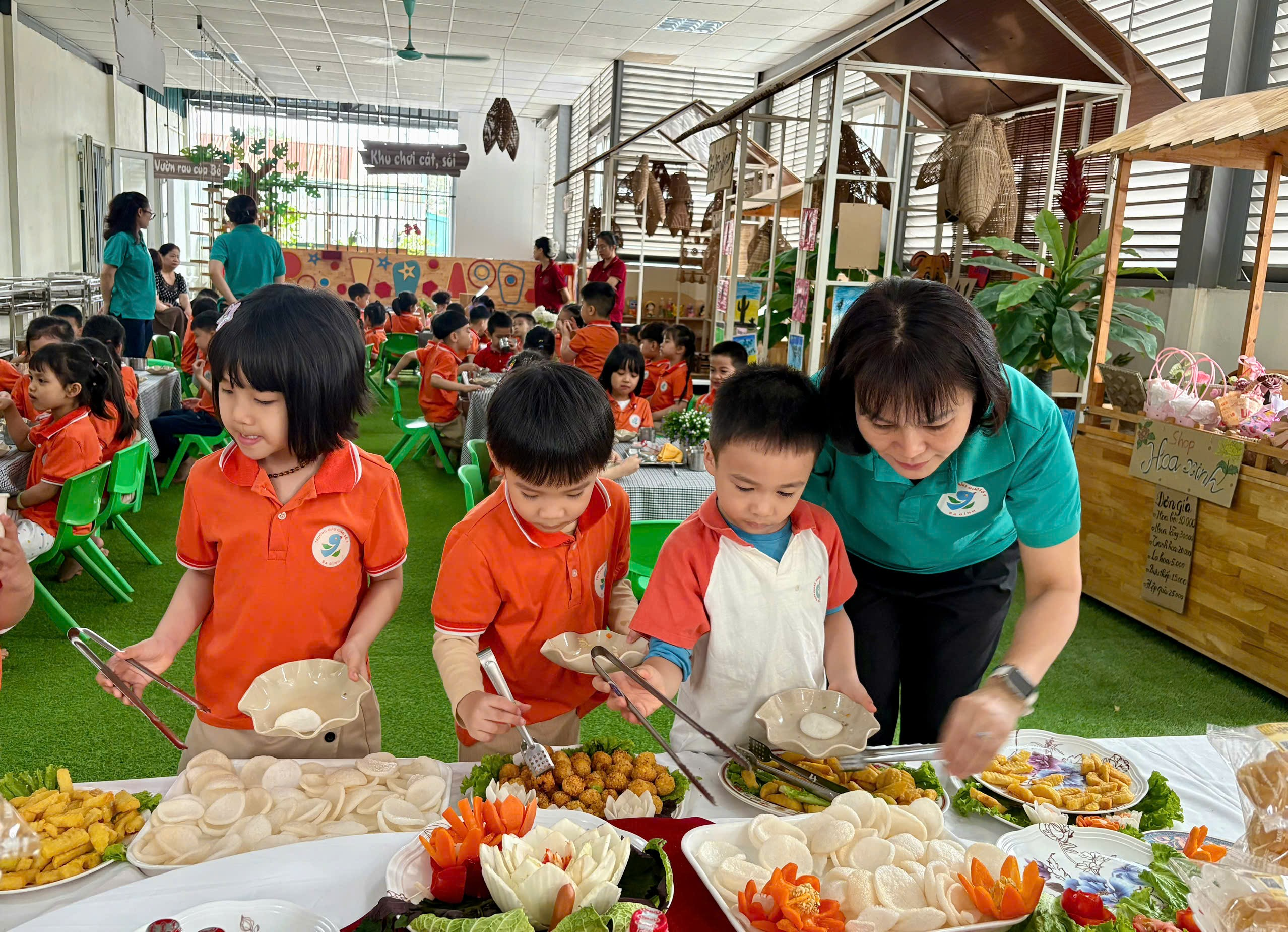 Không khí buổi tiệc tràn ngập tiếng cười. Các bé tỏ ra rất thích thú khi được cùng nhau thưởng thức món ăn, trò chuyện và trải nghiệm như một “bữa tiệc thật sự”. Đây cũng là cơ hội để các con thêm gắn bó với bạn bè và cô giáo.