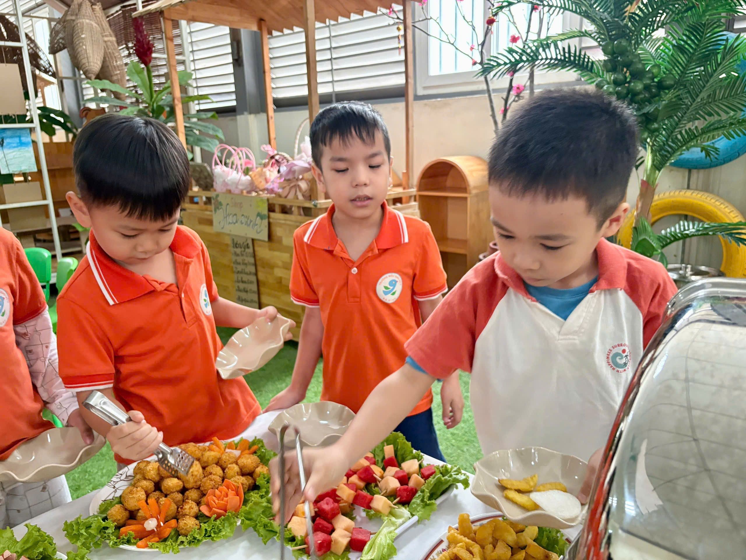 Trong buổi tiệc, các bé được tự tay lựa chọn món ăn, xếp hàng lấy đồ, sử dụng dụng cụ ăn uống đúng cách và ngồi ăn gọn gàng cùng bạn bè. Qua đó, trẻ được rèn luyện: