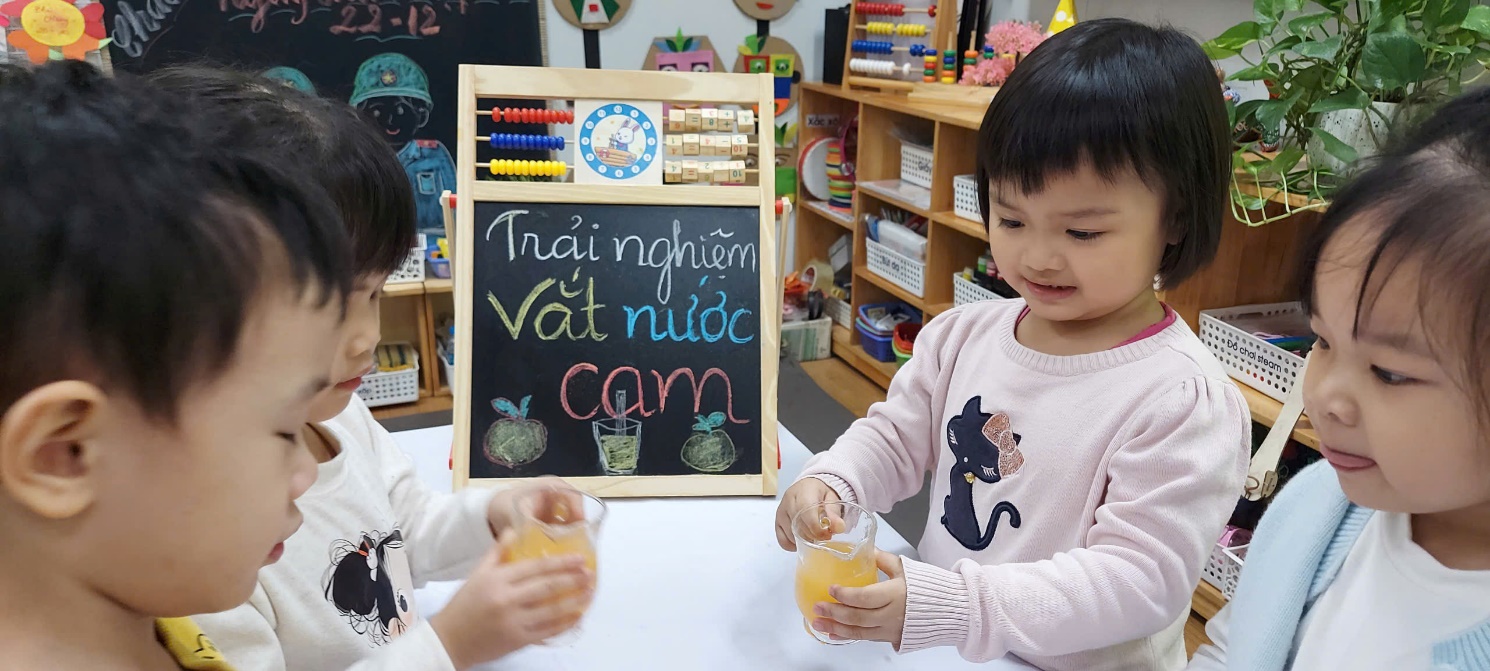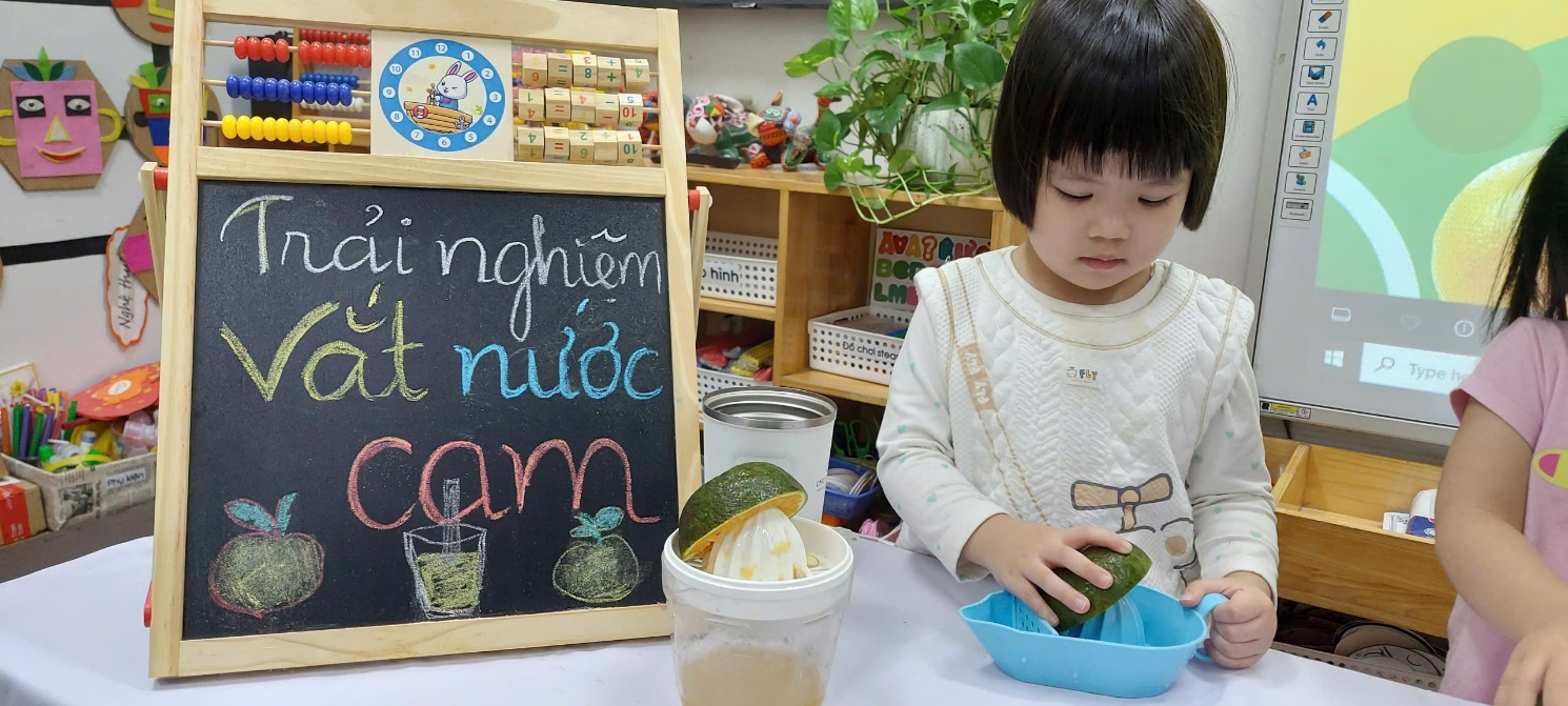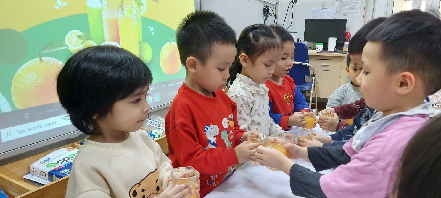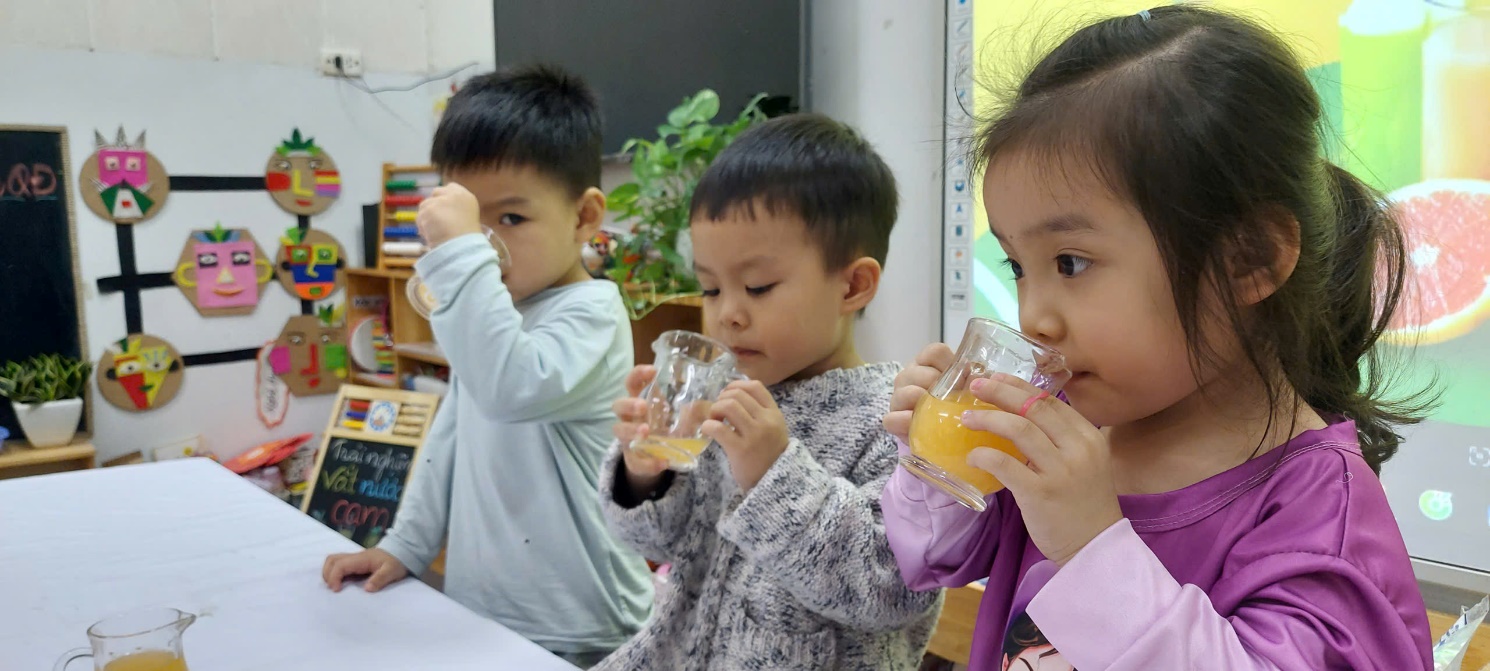 Với các bé 3-4 tuổi, việc tự tay tạo ra một món đồ uống không chỉ là niềm vui, mà còn là một hành trình khám phá đầy thú vị về kỹ năng và vị giác. Không chỉ đơn thuần là một ly nước giải khát, hoạt động trải nghiệm này là "bài học đa kỹ năng" mà các cô dành cho bé: Để có được một ly nước cam ngon, các bé phải học cách phối hợp lực của bàn tay và cổ tay để xoay, ấn quả cam trên dụng cụ vắt