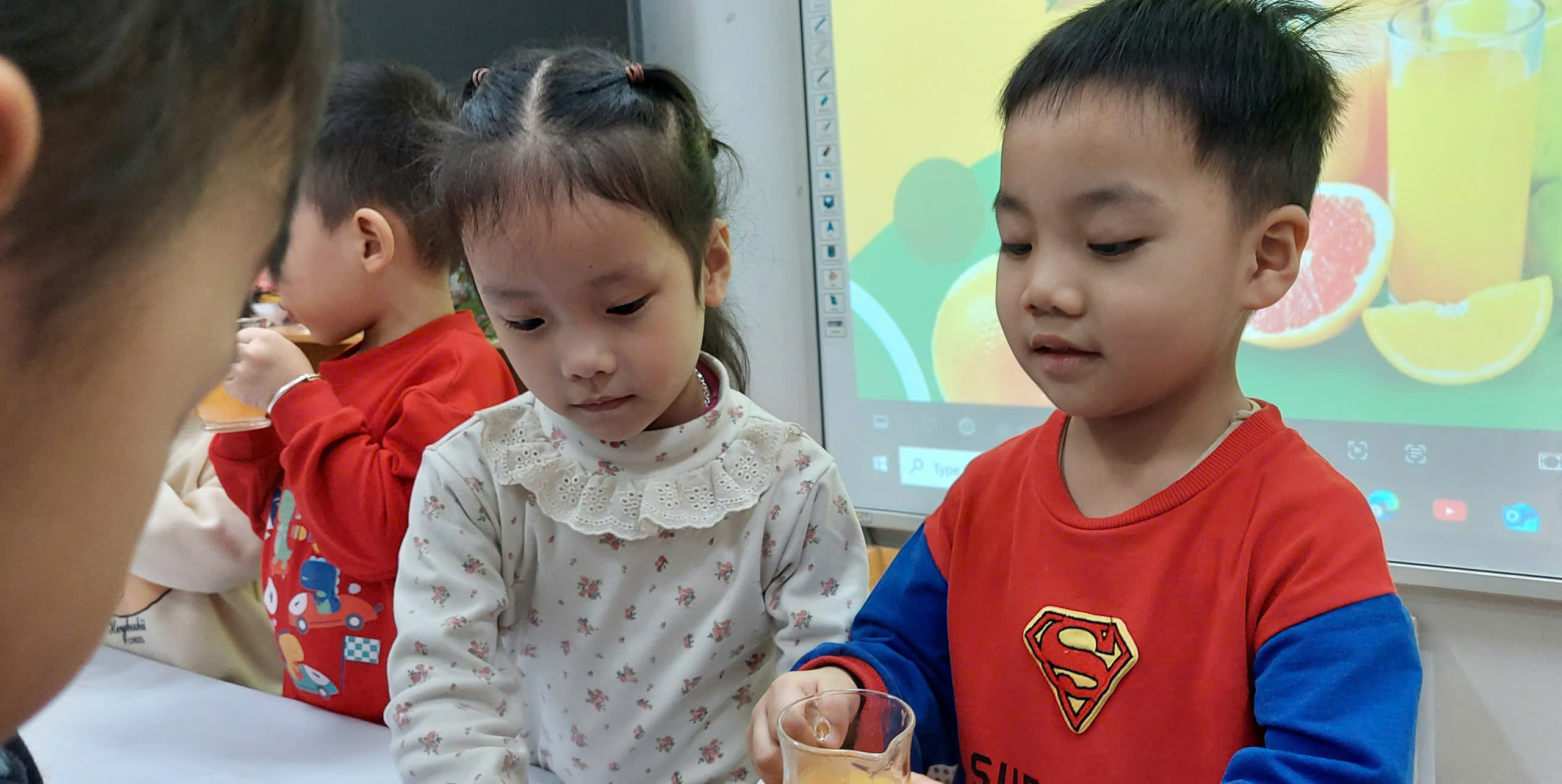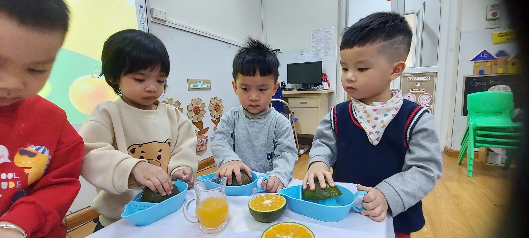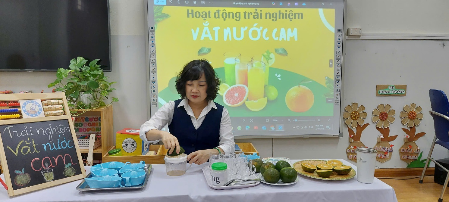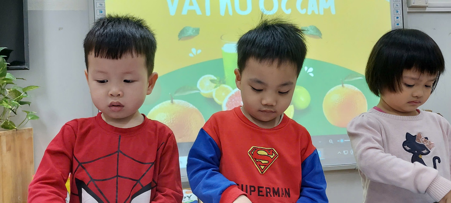 Với các bé 3-4 tuổi, việc tự tay tạo ra một món đồ uống không chỉ là niềm vui, mà còn là một hành trình khám phá đầy thú vị về kỹ năng và vị giác. Không chỉ đơn thuần là một ly nước giải khát, hoạt động trải nghiệm này là "bài học đa kỹ năng" mà các cô dành cho bé: Để có được một ly nước cam ngon, các bé phải học cách phối hợp lực của bàn tay và cổ tay để xoay, ấn quả cam trên dụng cụ vắt