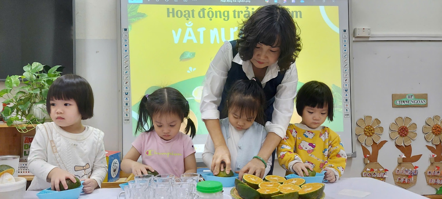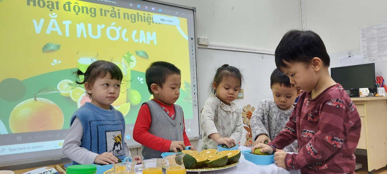 Trước khi hoạt động cô giáo đã cho các bé đi rửa tay sạch sẽ và chuẩn bị tâm thế thật vui vẻ để cùng cô tham gia trải nghiệm. Bước đầu bé đã cùng cô trò chuyện về quả cam, về dụng cụ vắt nước cam. Sau đó cùng cô thực hành cách vắt nước cam: "Xoay, xoay, xoay"... những giọt nước cam bắt đầu chảy xuống. Dù đôi tay còn chút lóng ngóng nhưng bé nào cũng rất quyết tâm. Dưới sự hướng dẫn ân cần của cô giáo, từng bé được tự tay vắt cam bằng dụng cụ an toàn, phù hợp với lứa tuổi. Những bàn tay nhỏ nhắn xoay cam trên dụng cụ vắt, từng giọt nước cam tươi mát chảy ra khiến các con vô cùng thích thú.