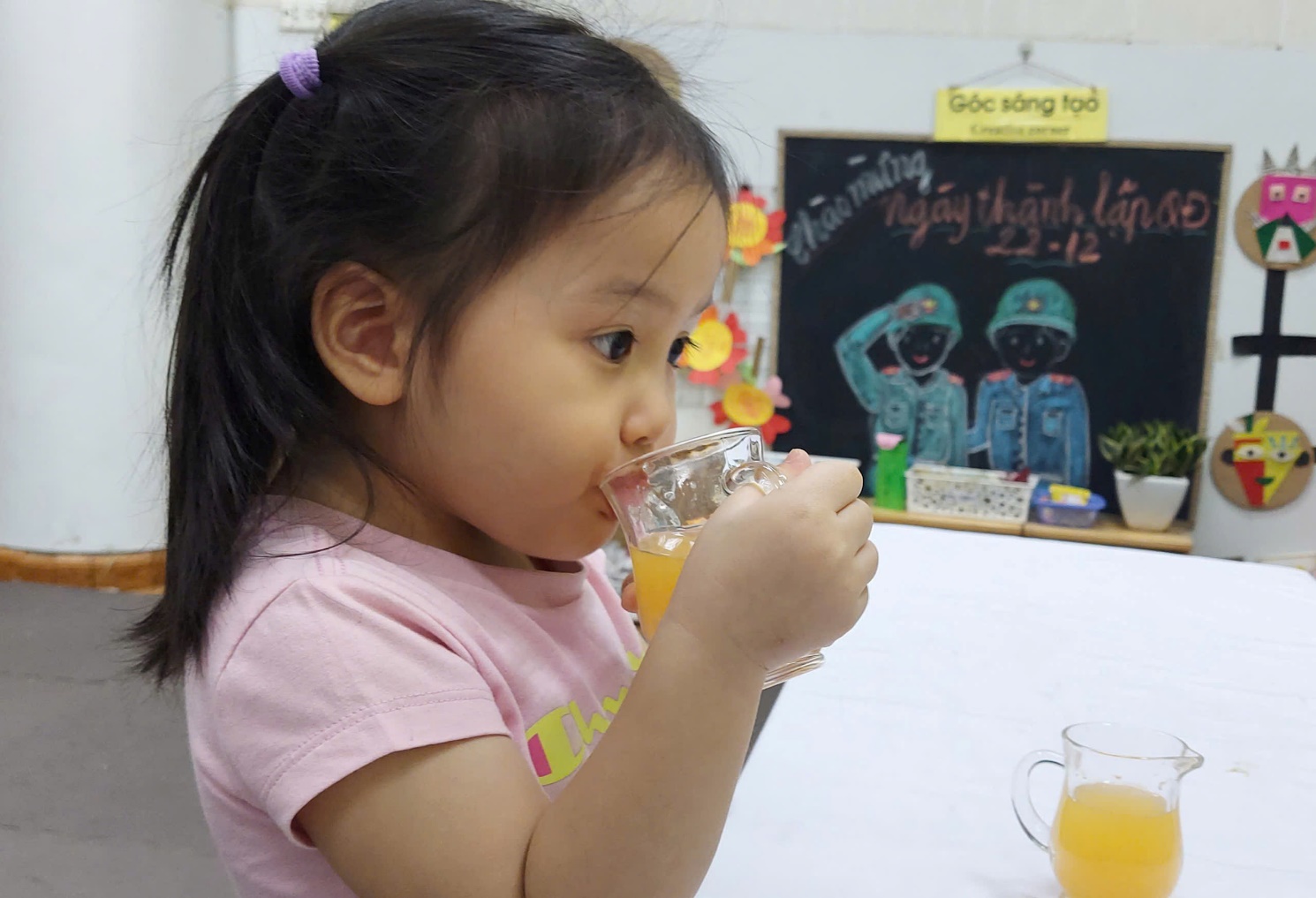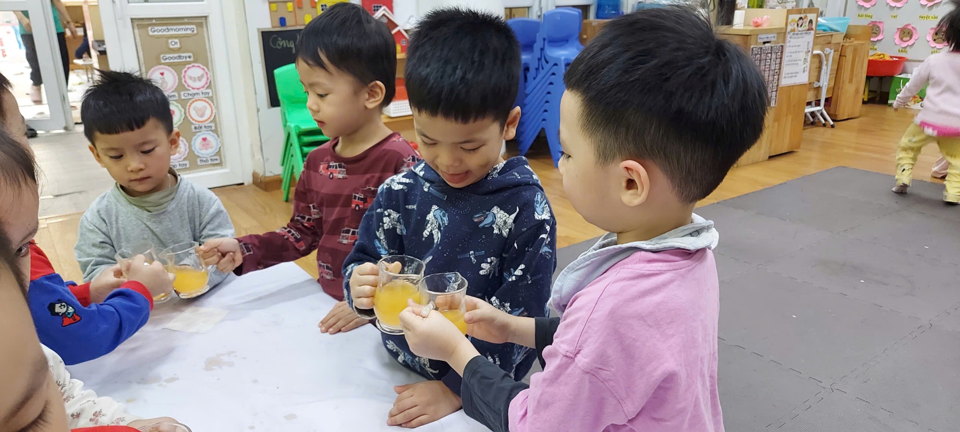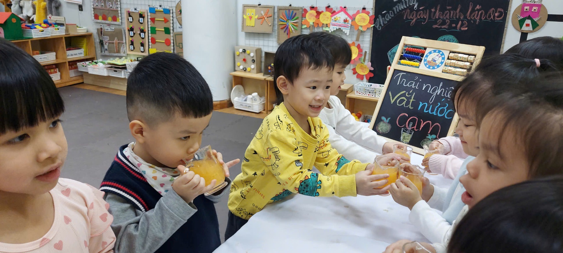 Sau khi hoàn thành, các bé được được thưởng thức thành quả của mình. Đây là khoảnh khắc hạnh phúc nhất là khi các bé cùng nhau nâng ly, thưởng thức thành quả thơm ngon do chính tay mình làm ra. Gương mặt rạng rỡ, nụ cười tươi và những lời nhận xét đáng yêu của các con đã khiến giờ học thêm trọn vẹn