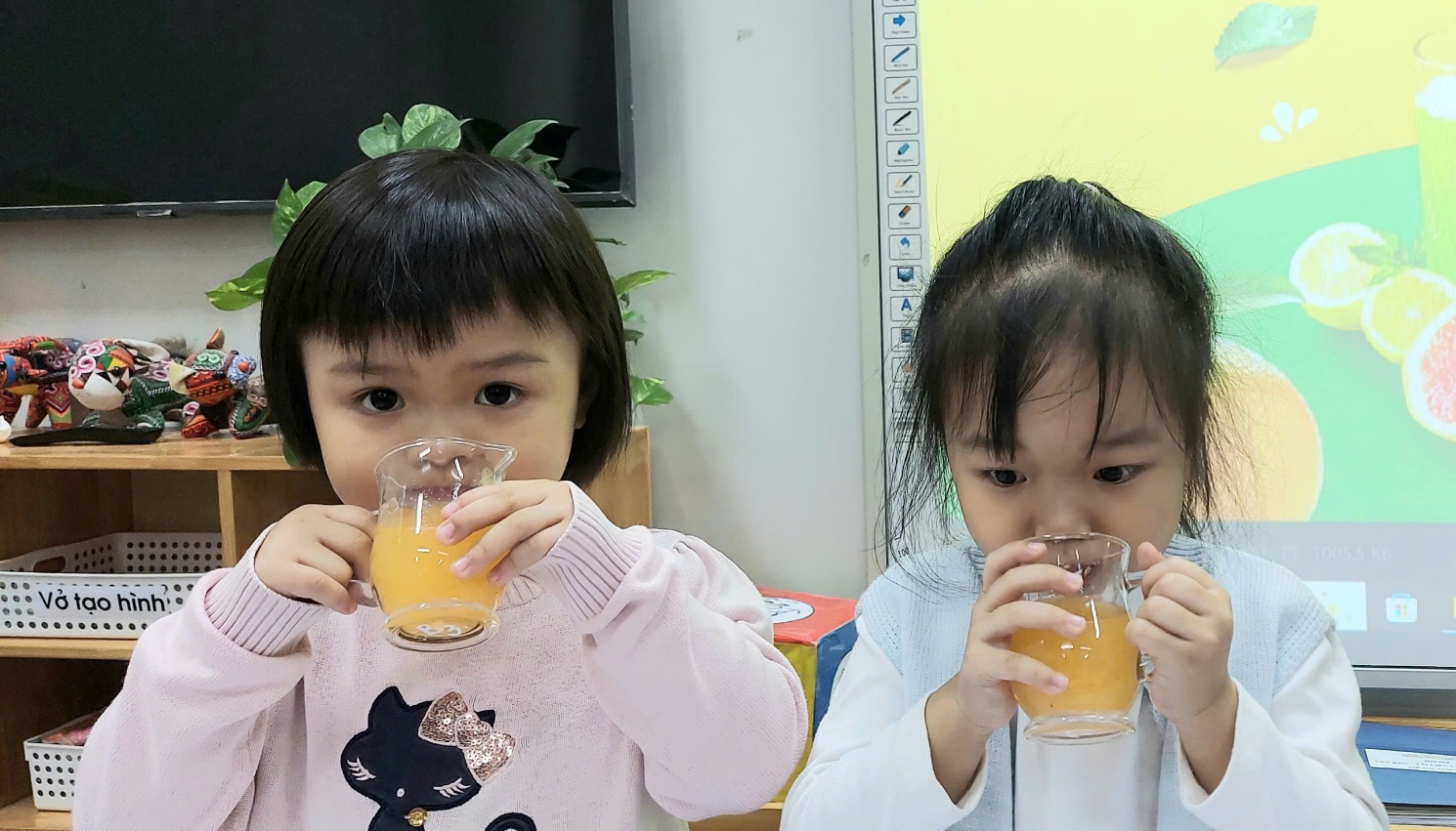 Đây là bài tập tuyệt vời cho các cơ nhỏ của bàn tay. Bé được quan sát màu sắc của quả cam, ngửi mùi thơm đặc trưng và đặc biệt là nếm vị chua chua, ngọt ngọt từ thành quả của mình. Bé học được các bước cơ bản để chăm sóc bản thân và mời bạn bè, giúp bé tự tin và độc lập hơn. Thông qua hoạt động, các cô lồng ghép giáo dục bé về Vitamin C, về việc ăn uống đủ chất để cơ thể luôn khỏe mạnh, tăng sức đề kháng. Bố mẹ có biết không? Nhìn những đôi mắt xoe tròn chăm chú quan sát cô hướng dẫn, rồi đến những khuôn mặt "tập trung cao độ" khi tự tay vắt cam, các cô thấy vừa thương vừa tự hào.