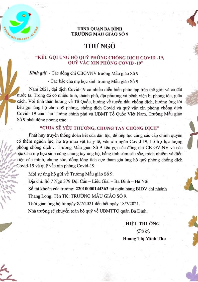 Hưởng ứng Thư kêu gọi của Thành phố Hà Nội, quận Ba Đình  và Liên đoàn lao động quận, trường Mẫu giáo Số 9 đã có THƯ NGỎ gửi tới toàn thể Cán bộ, Giáo viên, Nhân viên và Phụ huynh học sinh trong toàn trường nhằm vận động sự nhiệt tình chia sẻ một phần thu nhập tới Quỹ vaccine, nhằm góp phần tăng nhanh quá trình tiêm chủng vaccine, phấn đấu đạt miễn dịch cộng đồng, từ đó đưa đời sống nhân dân, trong đó có các con học sinh, các bậc phụ huynh, các cán bộ-giáo viên-nhân viên của nhà trường và toàn thể nhân dân ta sớm trở lại bình thường.