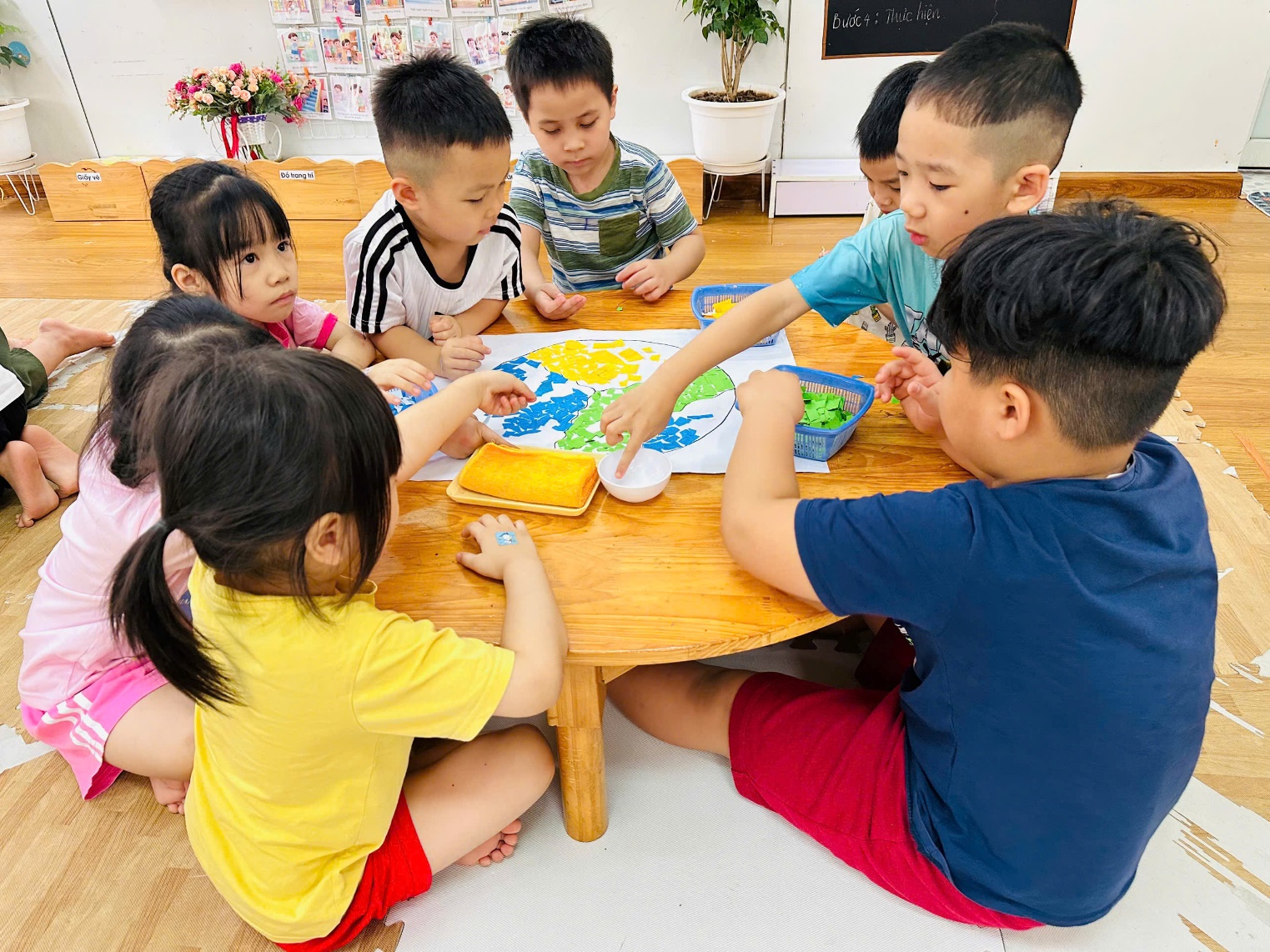 Các bé lớp MGN B1, MGL A1 làm tranh bảo vệ môi trường- trái đất xanh từ nguyên liệu tái chế