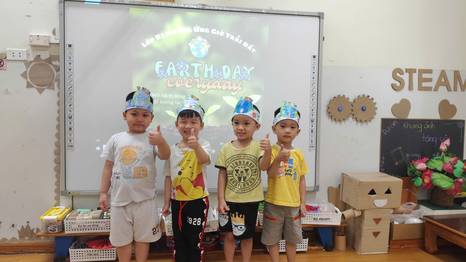 Không khí lớp học trở nên rộn ràng hơn bao giờ hết khi các bé tự tay làm những chiếc vương miện "Earth Day Everyday". Những nụ cười rạng rỡ, những ngón tay cái xinh xắn giơ cao thể hiện quyết tâm trở thành những "Hiệp sĩ bảo vệ môi trường" thực thụ.