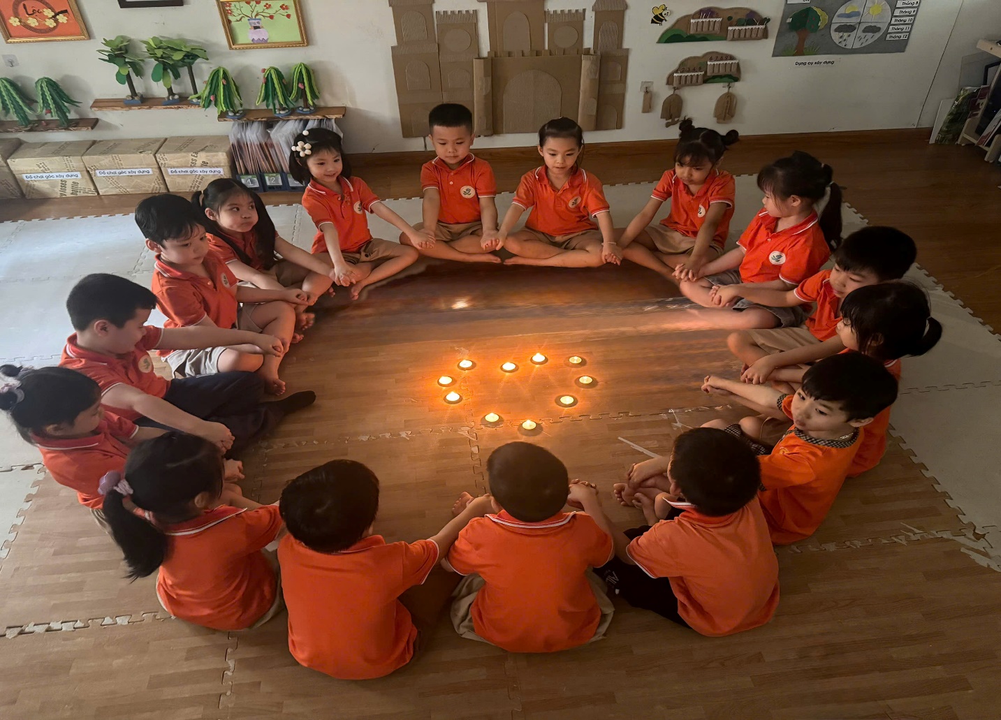 Hoạt động ấn tượng nhất có lẽ là khi đèn điện trong lớp được tắt đi, nhường chỗ cho ánh sáng lung linh của những ngọn nến nhỏ xếp hình trái tim. Trong không gian ấm cúng ấy, các con được trải nghiệm trò chơi kịch bóng bằng tay, được cảm nhận vẻ đẹp của thiên nhiên khi không có thiết bị điện tử. Bài học về tiết kiệm năng lượng chưa bao giờ trở nên gần gũi và sâu sắc đến thế.