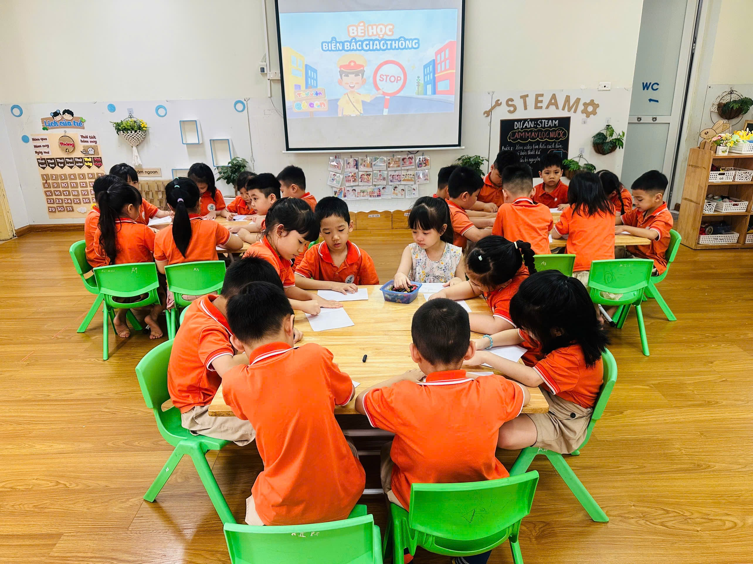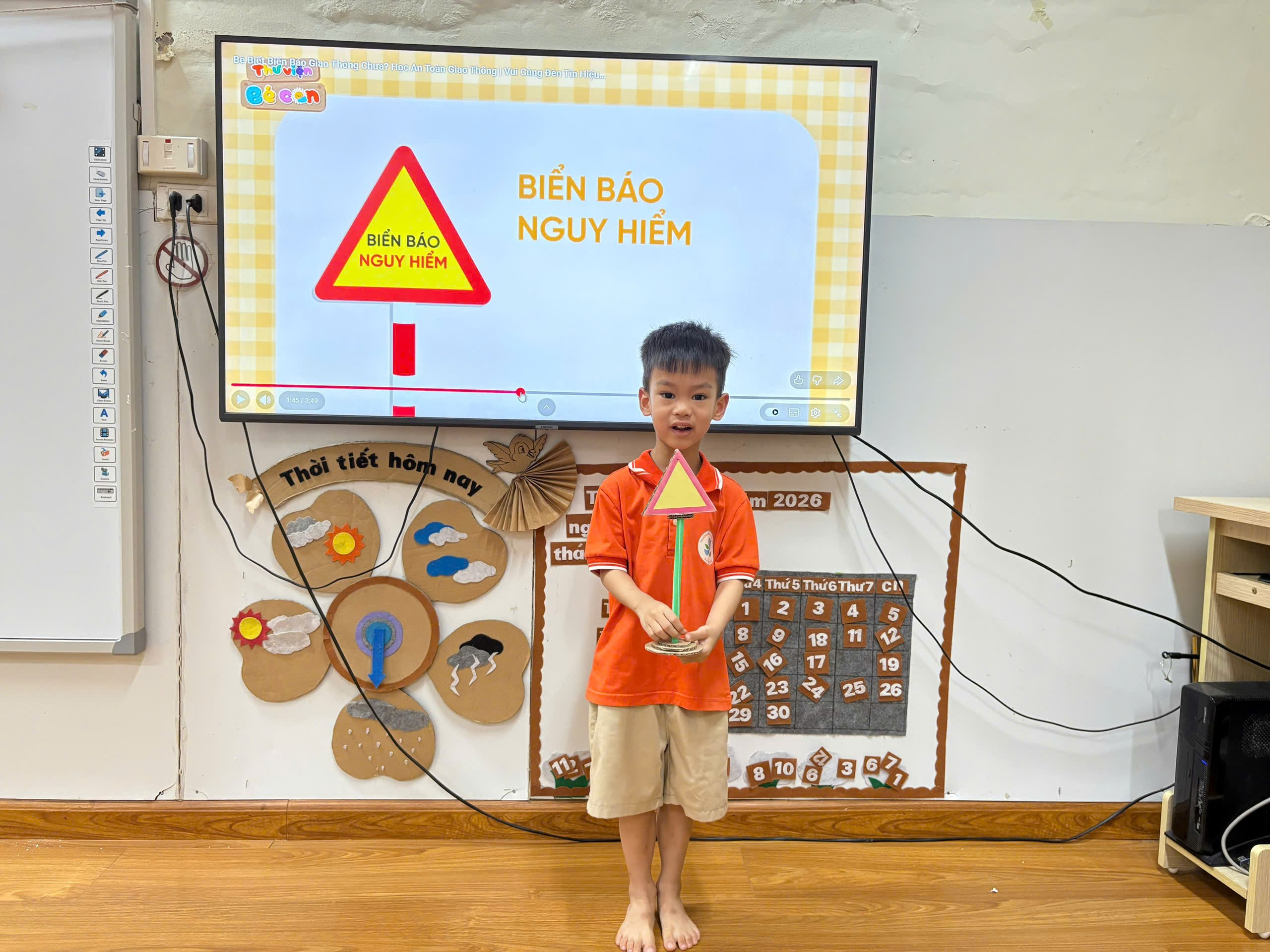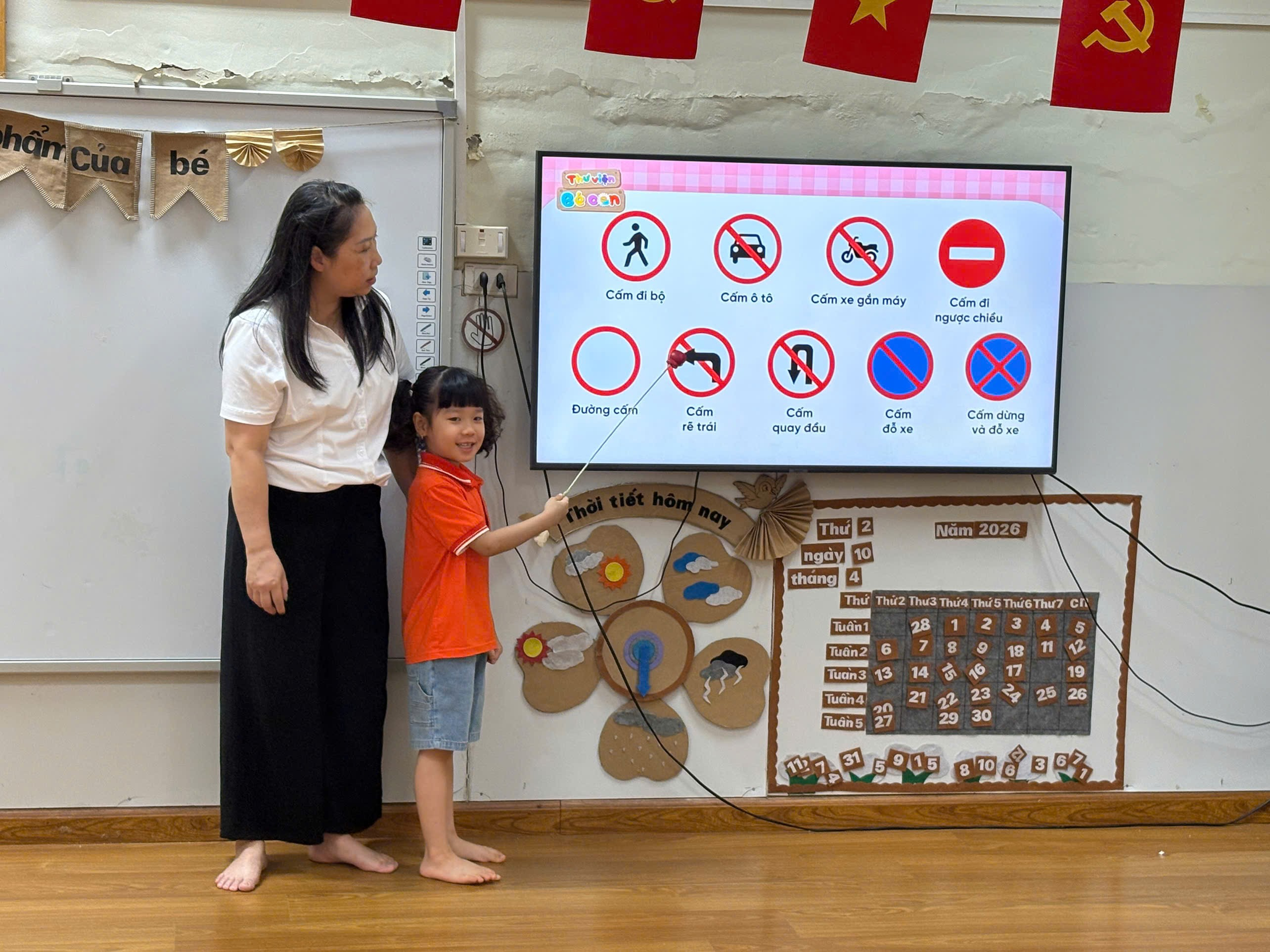 Dưới sự hướng dẫn nhẹ nhàng, gần gũi của cô giáo, các con đã được làm quen với 3 loại biển báo giao thông quan trọng: biển báo cấm, biển chỉ dẫn và biển cảnh báo nguy hiểm. Từng hình ảnh, màu sắc, ký hiệu trở nên gần gũi hơn bao giờ hết khi được lồng ghép qua câu chuyện, tình huống thực tế. Đôi mắt các con ánh lên sự tò mò, thích thú khi dần hiểu rằng mỗi biển báo đều mang một “thông điệp” riêng giúp chúng ta đi đường an toàn hơn.