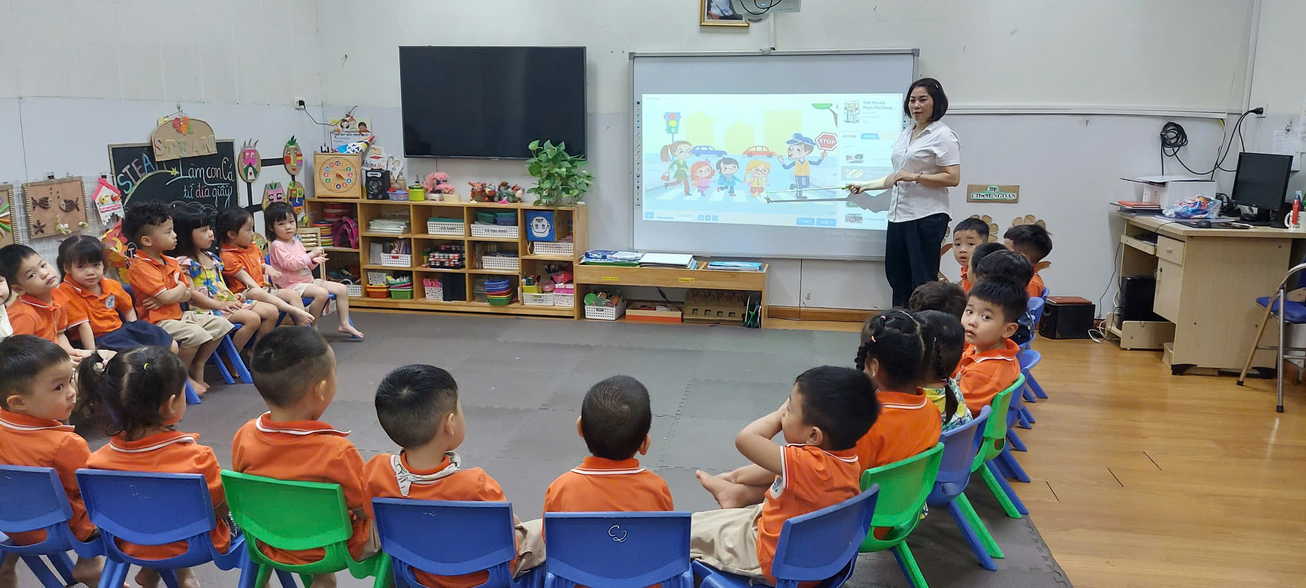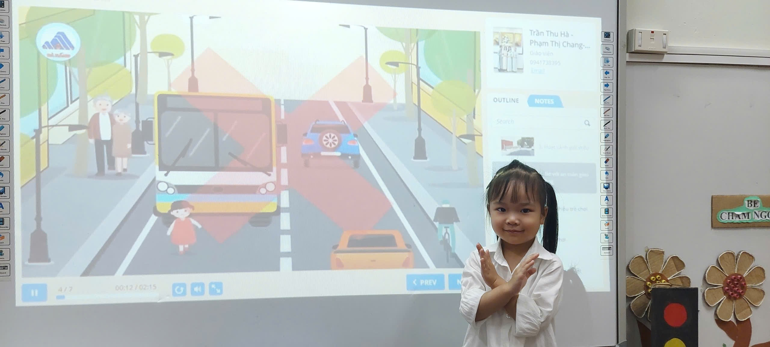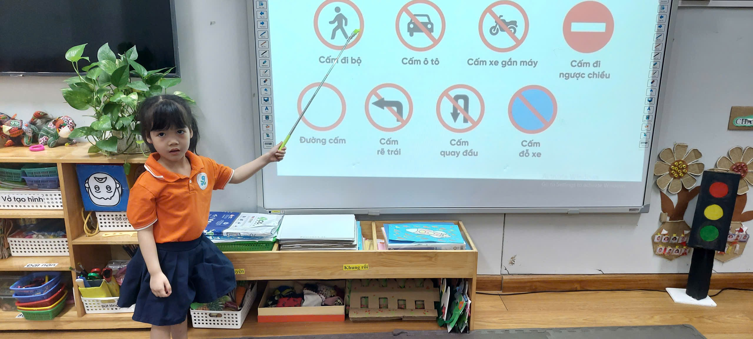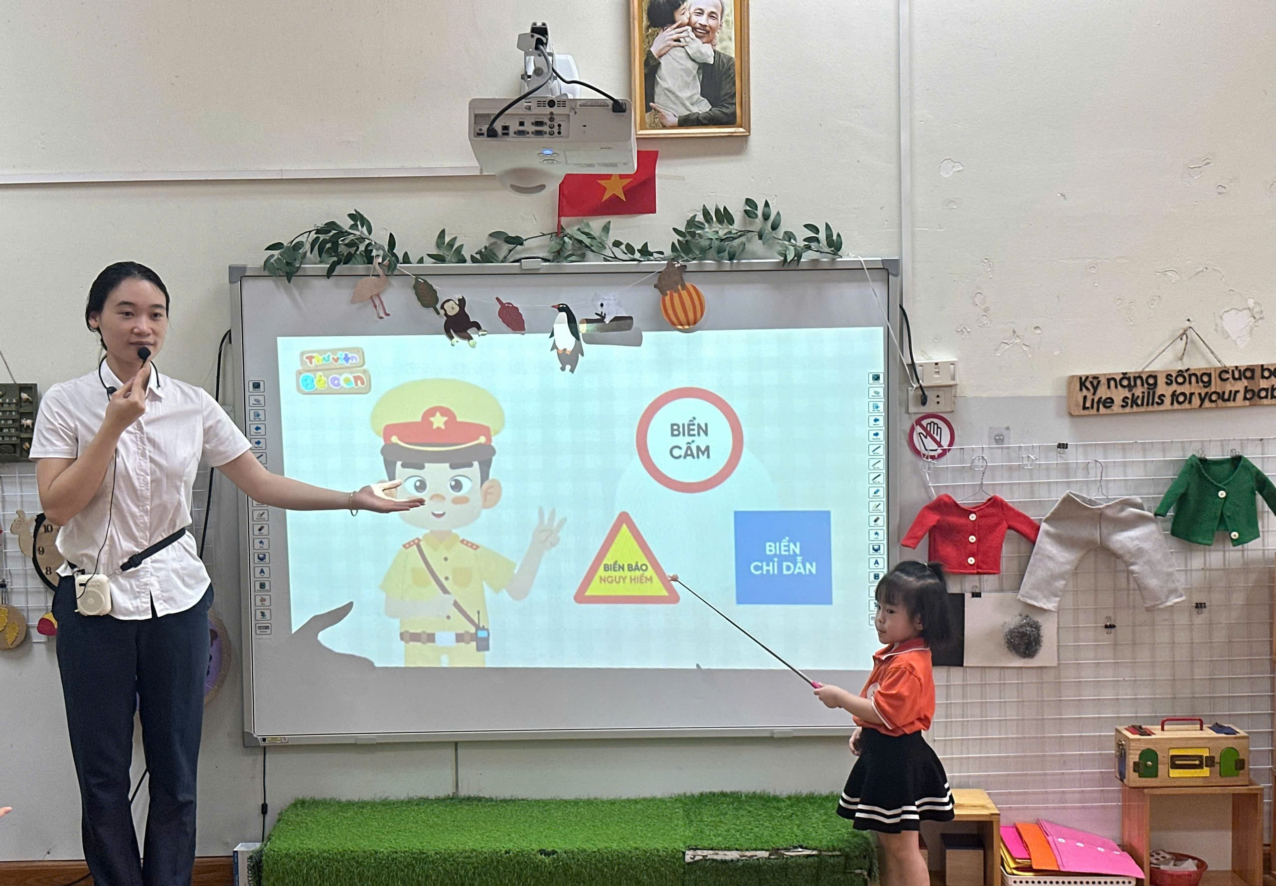 Dưới sự hướng dẫn nhẹ nhàng, gần gũi của cô giáo, các con đã được làm quen với 3 loại biển báo giao thông quan trọng: biển báo cấm, biển chỉ dẫn và biển cảnh báo nguy hiểm. Từng hình ảnh, màu sắc, ký hiệu trở nên gần gũi hơn bao giờ hết khi được lồng ghép qua câu chuyện, tình huống thực tế. Đôi mắt các con ánh lên sự tò mò, thích thú khi dần hiểu rằng mỗi biển báo đều mang một “thông điệp” riêng giúp chúng ta đi đường an toàn hơn.