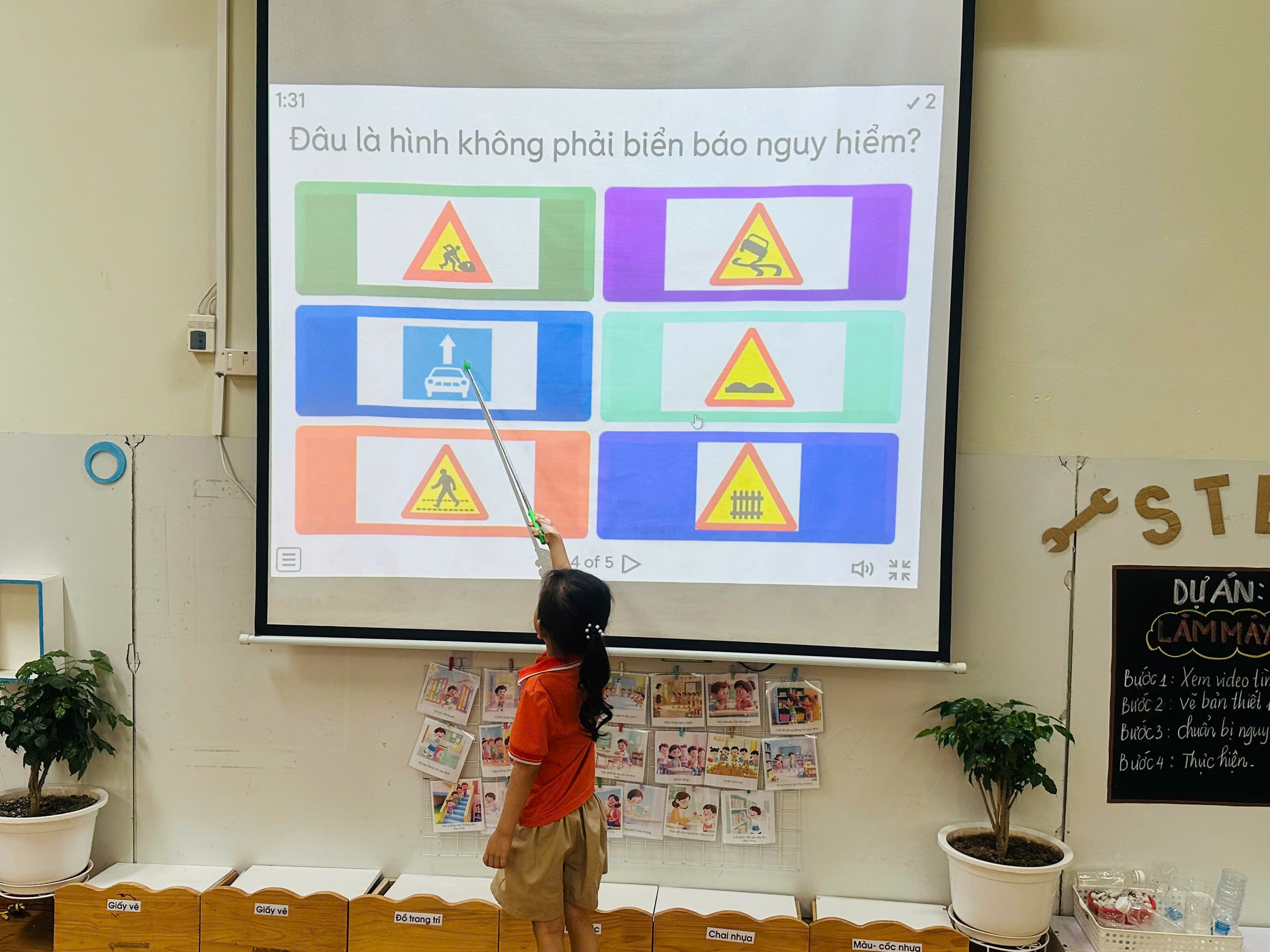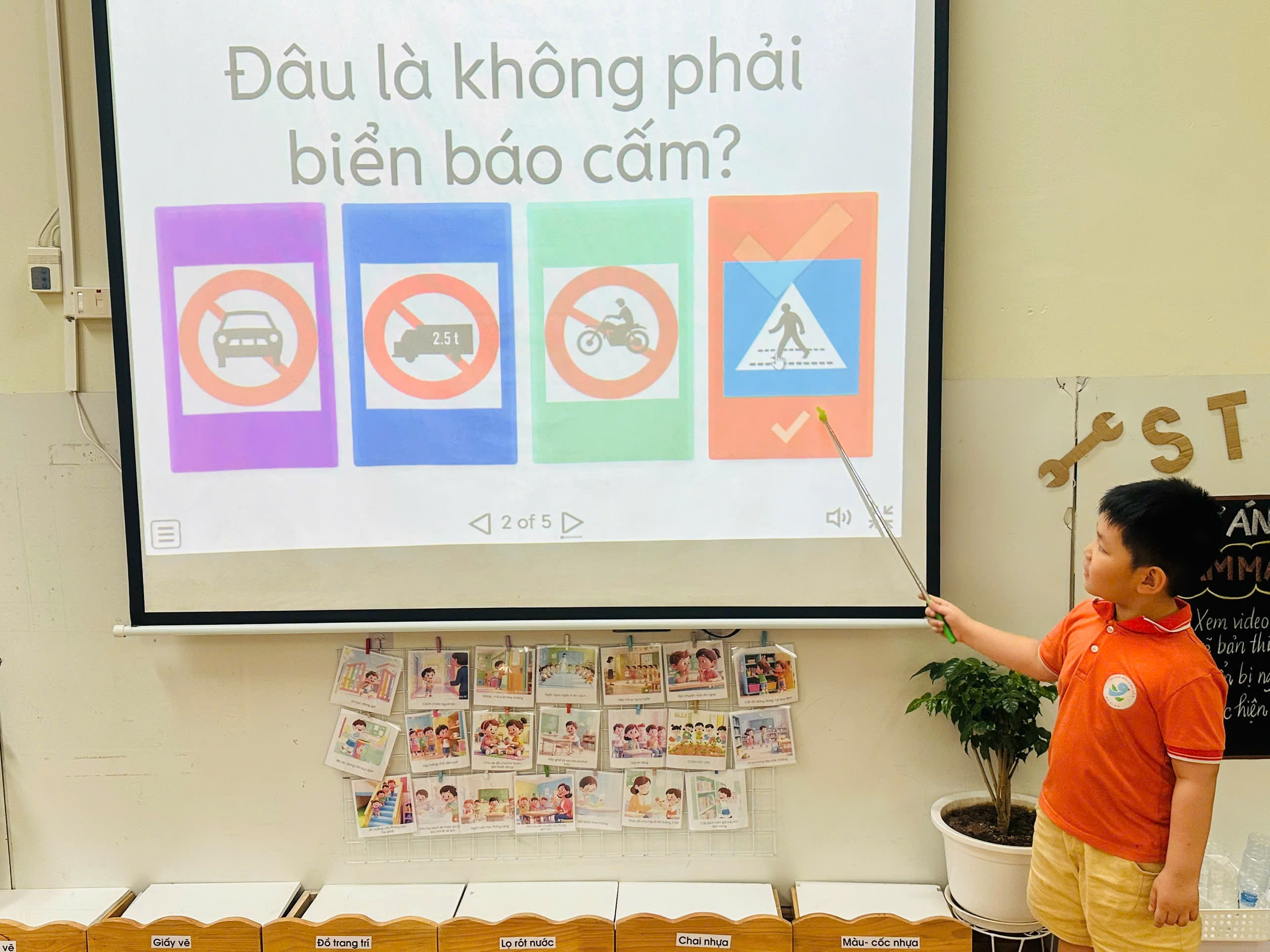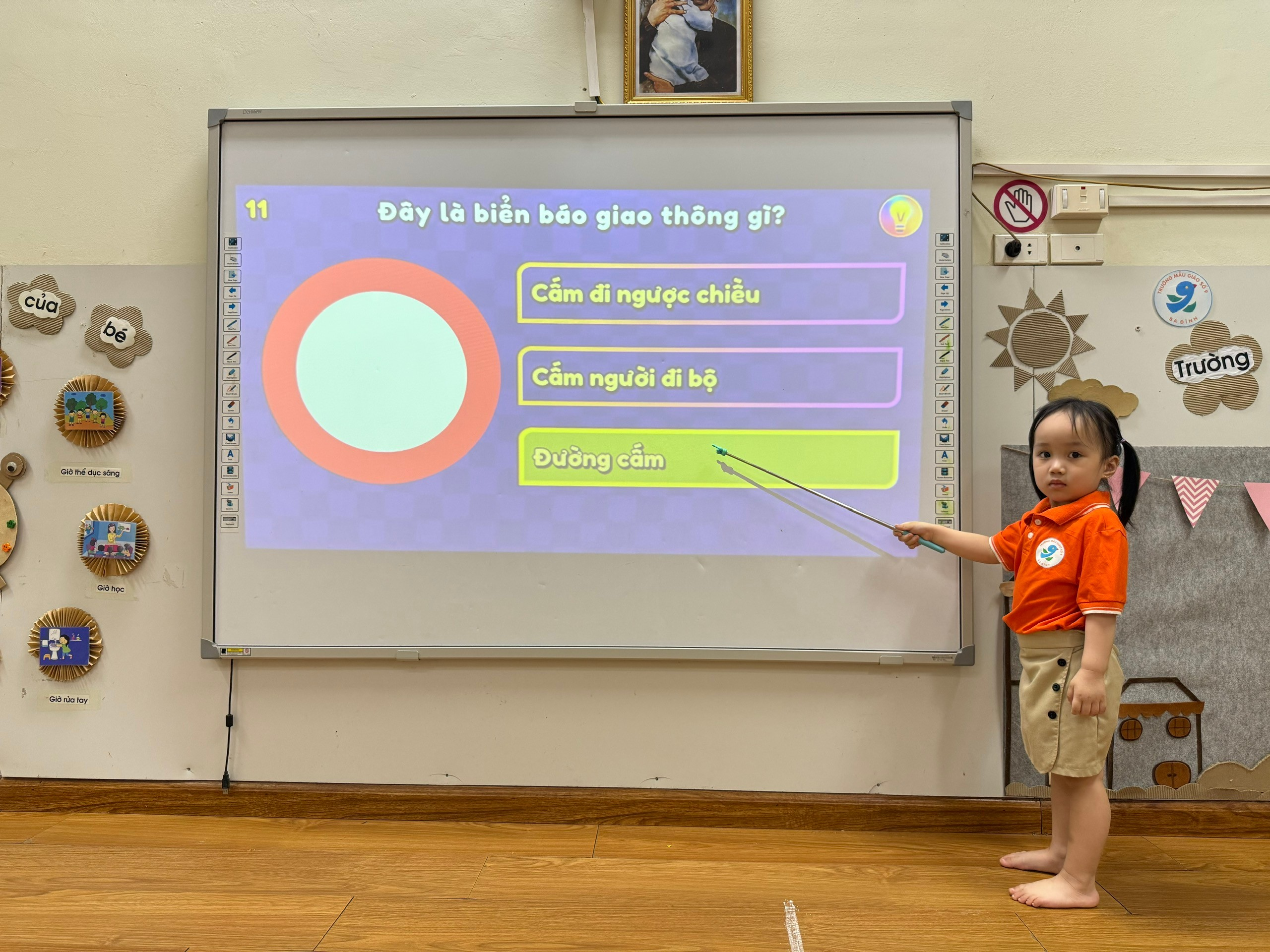 Không khí lớp học bỗng “nóng” lên khi bước vào phần trò chơi tương tác. Những câu hỏi nhanh, những thử thách nhận diện biển báo đã khiến các bạn nhỏ hào hứng giơ tay, tự tin trả lời. Có bạn trả lời rất nhanh, có bạn còn mạnh dạn giải thích ý nghĩa biển báo theo cách hiểu của mình – tất cả tạo nên một không gian học tập sôi nổi, đầy tiếng cười.