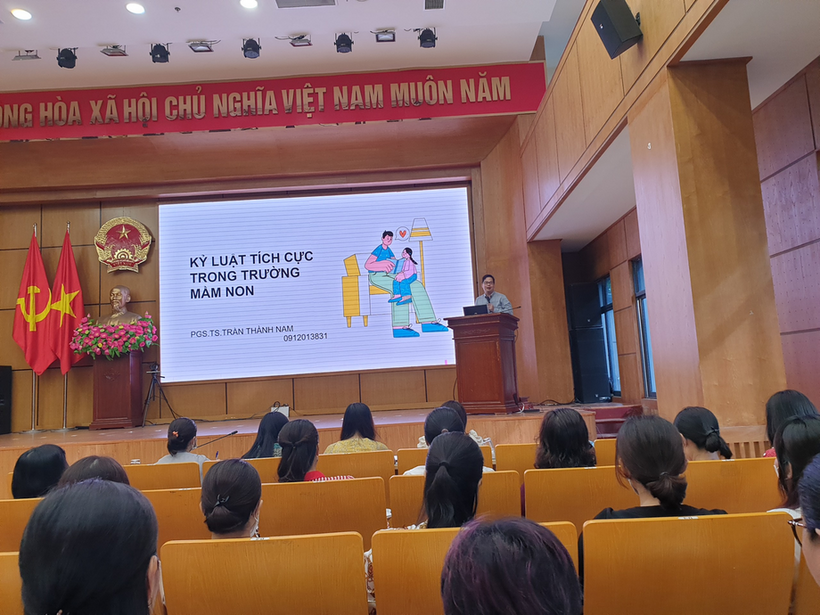 Tại buổi tập huấn chuyên đề, cán bộ, giáo viên các trường mầm non quận Ba Đình đã được nghe giảng viên Trần Thành Nam- PGS.TS- Trưởng khoa các khoa học giáo dục- Trường Đại học giáo dục Quốc gia Hà Nội phổ biến nội dung chuyên đề như: Khái niệm tính kỉ luật tích cực; Nguyên tắc kỉ luật tích cực; Xây dựng kỉ luật tích cực cho trẻ trong nhóm lớp: Kĩ năng KLTC cơ bản dành cho GVMM; Quy trình GVMN sử dụng KLTC với trẻ; KLTC với hành vi sai theo nhóm mục đích.