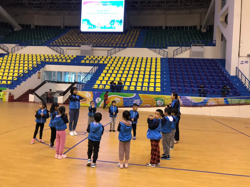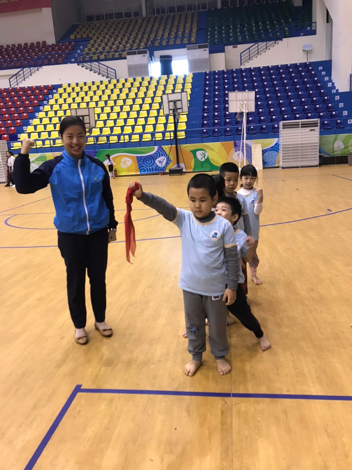 Trước khi bước vào hội thi, cô và trò tích cự tham gia vào khởi động, tập luyện để chuẩn bị vào thi đấu.