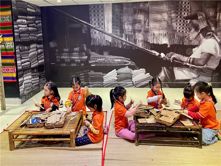 Cùng bé dệt vải.