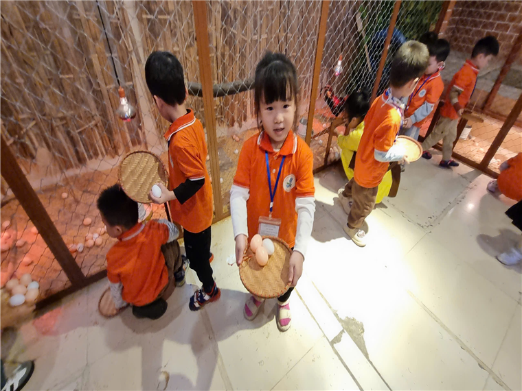 Các bạn nhỏ trải nghiệm đi nhặt trứng gà.