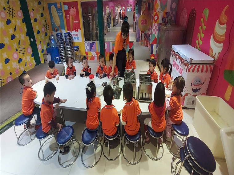 Các bạn nhỏ quan sát quy trình làm kem.