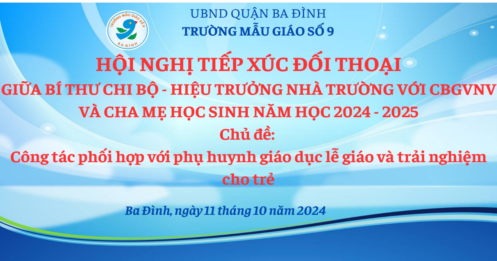 Sáng ngày 11/10/2024 Trường Mẫu giáo Số 9 đã long trọng tổ chức Hội nghị Tiếp xúc, đối thoại trực tiếp giữa người đứng đầu cấp ủy- Hiệu trưởng với đội ngũ CB - GV- NV và PHHS năm học 2024 - 2025.